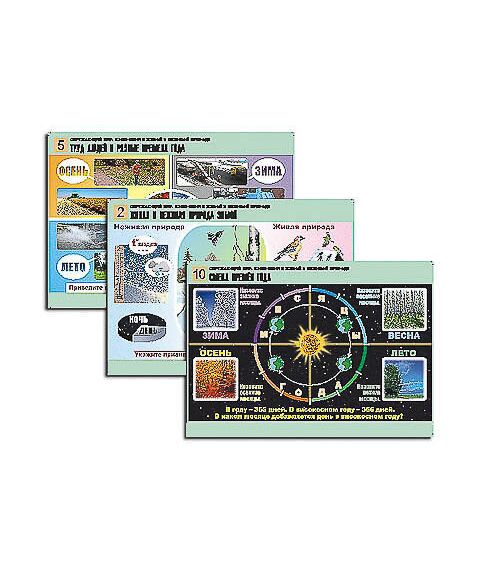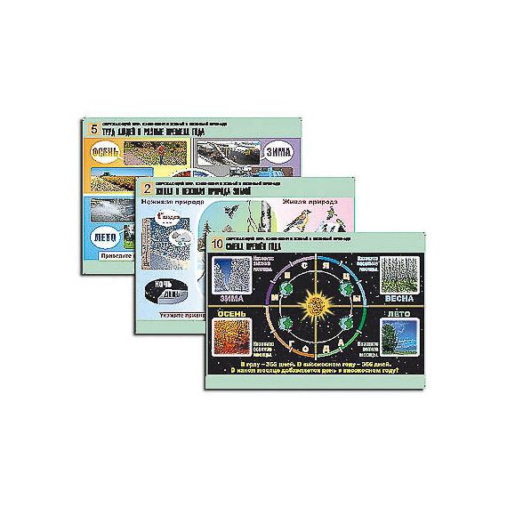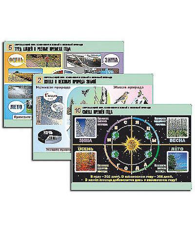 Таблицы: 1. Живая и неживая природа осенью. 2. Живая и неживая природа зимой. 3. Живая и неживая природа весной. 4. Живая и неживая природа летом. 5. Труд людей в разные времена года. 6. Вода и ее свойства. 7. Воздух и его свойства. 8. Минералы, горные породы, полезные ископаемые. 9. Смена дня и ночи. 10. Смена времен года.