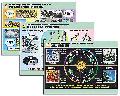Таблицы: 1. Живая и неживая природа осенью. 2. Живая и неживая природа зимой. 3. Живая и неживая природа весной. 4. Живая и неживая природа летом. 5. Труд людей в разные времена года. 6. Вода и ее свойства. 7. Воздух и его свойства. 8. Минералы, горные породы, полезные ископаемые. 9. Смена дня и ночи. 10. Смена времен года.
