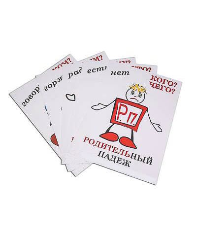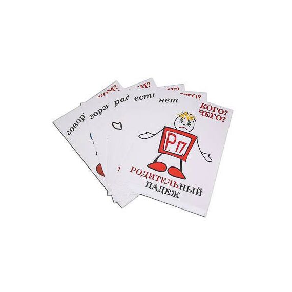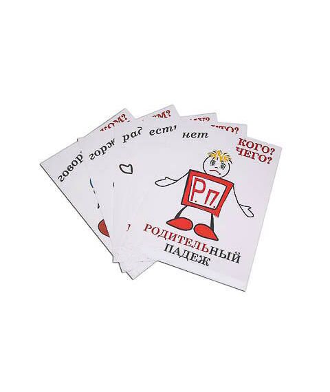 Пособие состоит из 6 полноцветных таблиц формата А3, ламинированных матовой пленкой. На таблицах даны графические изображения шести падежей в виде человечков, которые демонстрируют смысл вспомогательного слова, названия падежей, вспомогательные слова и соответствующие вопросы.