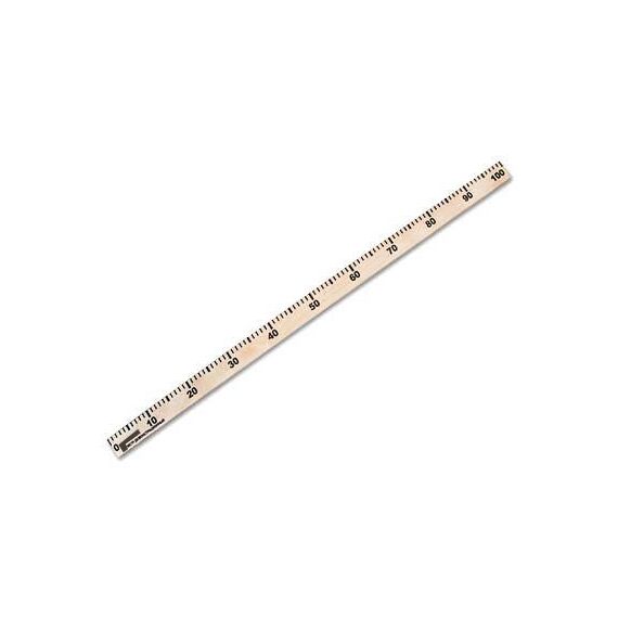 Метр изготовлен из фанеры, покрыт лаком. На изделие нанесена шкала с ценой деления 1 см и оцифровкой через 10 см.