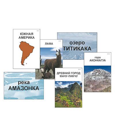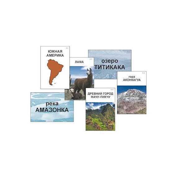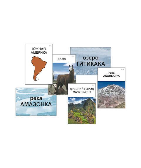 Пособие знакомит учащихся с материками: Евразией, Африкой, Северной Америкой, Южной Америкой, Австралией и Антарктидой. Набор карточек для каждого материка включает следующие изображения: название с контуром материка; высочайшую вершину; крупнейшие озеро и реку; типичное животное, обитающее на данном материке; уникальный природно-культурный объект. В категории «озёра» для Антарктиды представлено подледниковое озеро Восток; карточка категории «реки» для этого материка отсутствует, поскольку на материке в летний период образуются только временные водотоки в результате таяния ледников.