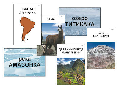Пособие знакомит учащихся с материками: Евразией, Африкой, Северной Америкой, Южной Америкой, Австралией и Антарктидой. Набор карточек для каждого материка включает следующие изображения: название с контуром материка; высочайшую вершину; крупнейшие озеро и реку; типичное животное, обитающее на данном материке; уникальный природно-культурный объект. В категории «озёра» для Антарктиды представлено подледниковое озеро Восток; карточка категории «реки» для этого материка отсутствует, поскольку на материке в летний период образуются только временные водотоки в результате таяния ледников.