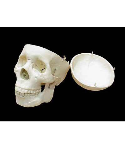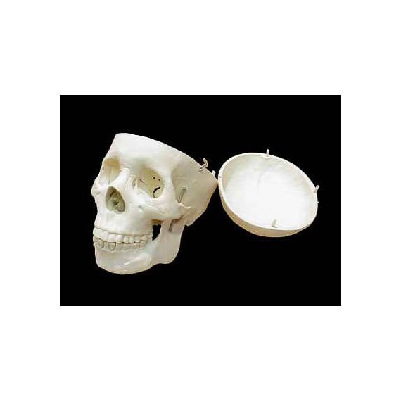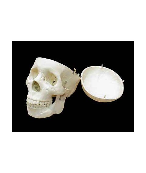 Модель высотой около 15 см, изготовлена из пластмассы. Модель является разборной, позволяет продемонстрировать расположение костей как снаружи черепа, так и внутри черепной коробки