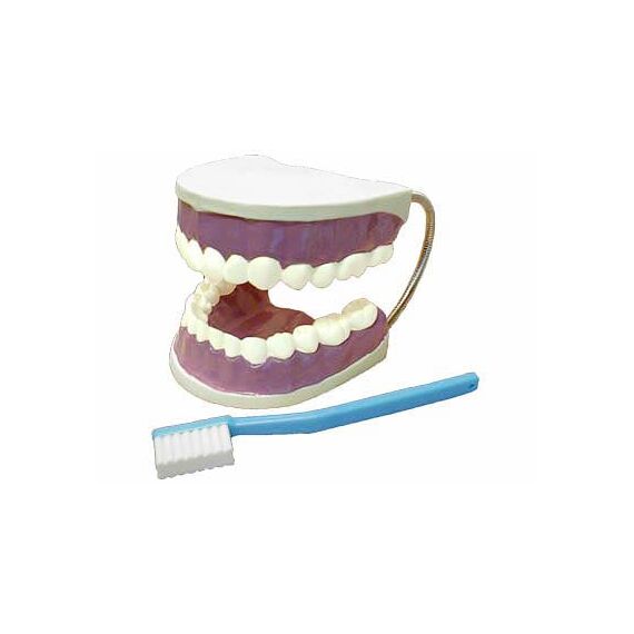 Модель демонстрирует строение челюстей человека (масштаб 5:1). Изготовлена из пластмассы и снабжена подвижными металлическими креплениями, позволяющими демонстрировать строение зубов, а также правила ухода за ними. В комплект входит муляж зубной щетки.