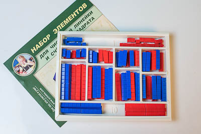 Изделие предназначено для использования в качестве раздаточного материала на уроках математики в начальной школе. Габаритные размеры в упаковке (дл.*шир.*выс.), см: 29*23*3. Вес, кг, не более 0,46. Набор состоит из счетных элементов красного и синего цвета, изготовленных из пластмассы. Число "1" обозначено кубиком 1*1*1 см, "2" – элементом размером 2*1*1 см, и так далее. На элементах нанесены сантиметровые деления. Общее количество элементов - 110. Изделие сопровождается руководством по эксплуатации. Упаковано в закрывающийся крышкой блистер с десятью пронумерованными ячейками, соответствующими размеру счетных элементов.