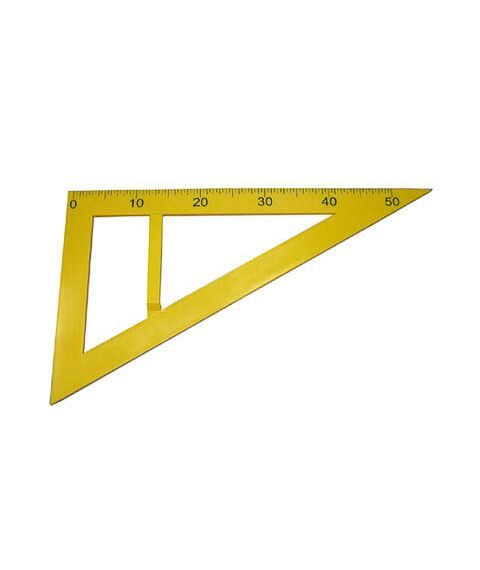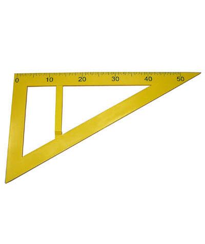 Изготовлен из пластмассы, снабжен ручкой, ярко окрашен. На катет нанесена шкала (50 см) с ценой деления 0,5 см и оцифровкой через 10 см.