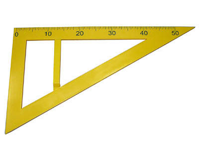 Изготовлен из пластмассы, снабжен ручкой, ярко окрашен. На катет нанесена шкала (50 см) с ценой деления 0,5 см и оцифровкой через 10 см.
