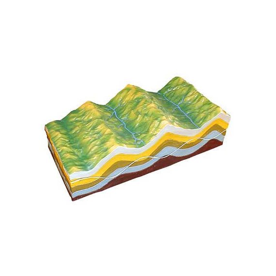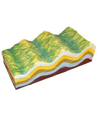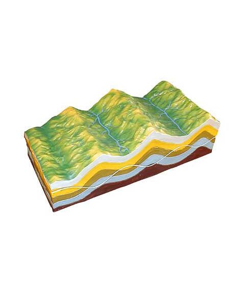 Модель изготовлена из пластмассы. Изображает строение земных складок и эволюций рельефа. На модели показаны: горные хребты, вершины, глубокие межгорные долины, горные реки и разрез складчатого строения.