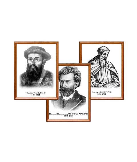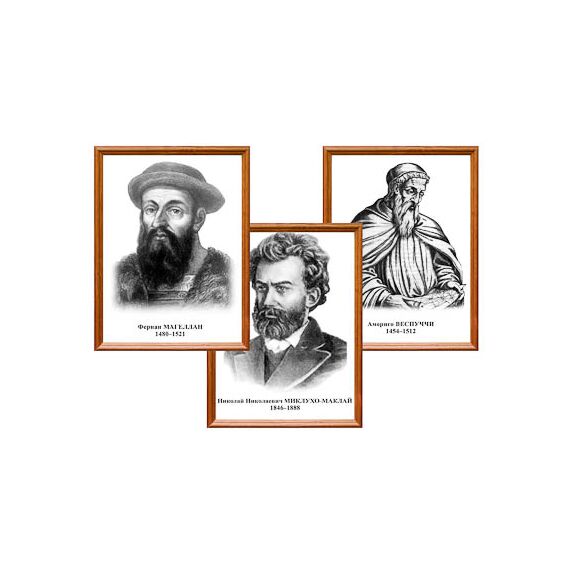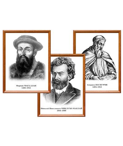 Перечень портретов: 1. Веспуччи Америго. 2. Колумб Христофор. 3. Кук Джеймс. 4. Магеллан Фернан. 5. Миклухо-Маклай Николай Николаевич. 6. Нансен Фритьоф. 7. Пржевальский Николай Михайлович. 8. Семёнов-Тян-Шанский Пётр Петрович.