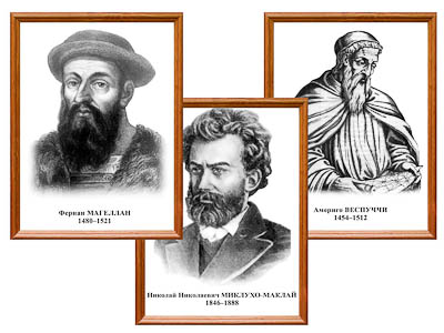 Перечень портретов: 1. Веспуччи Америго. 2. Колумб Христофор. 3. Кук Джеймс. 4. Магеллан Фернан. 5. Миклухо-Маклай Николай Николаевич. 6. Нансен Фритьоф. 7. Пржевальский Николай Михайлович. 8. Семёнов-Тян-Шанский Пётр Петрович.