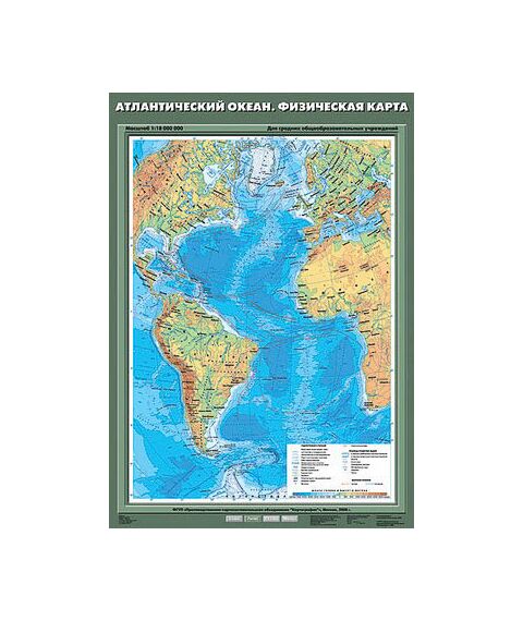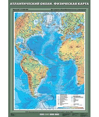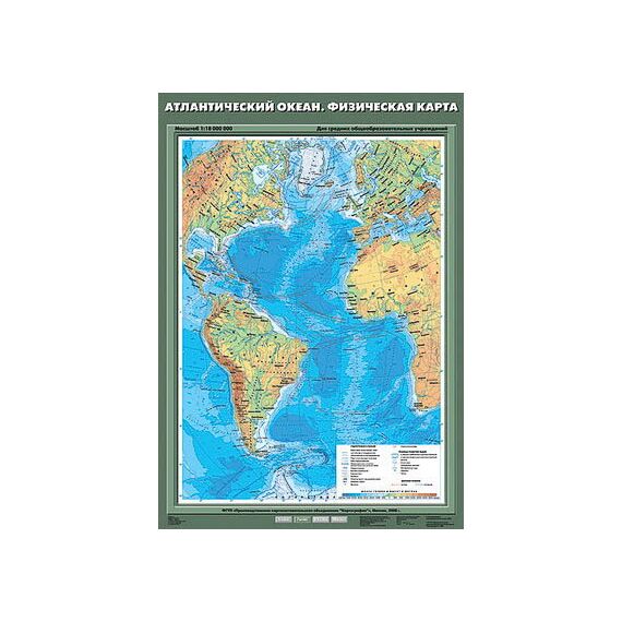 На карте дается граница Атлантического океана, средняя граница распространения плавучих льдов, течения, природные пояса, полезные ископаемые на акваториях океан, места обитания млекопитающих в Атлантическом океане. Односторонняя печать, двустороннее ламинирование, лицевая сторона покрыта матовым ламинатом.