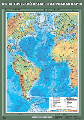 На карте дается граница Атлантического океана, средняя граница распространения плавучих льдов, течения, природные пояса, полезные ископаемые на акваториях океан, места обитания млекопитающих в Атлантическом океане. Односторонняя печать, двустороннее ламинирование, лицевая сторона покрыта матовым ламинатом.