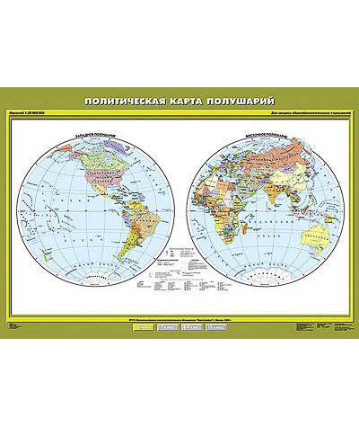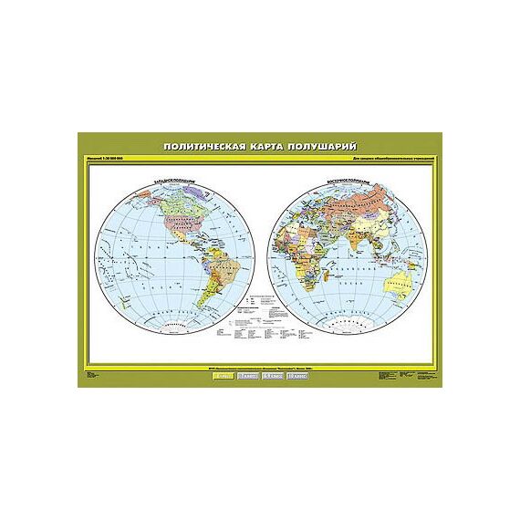 На карте полушарий фоном даны государства и территории мира. Односторонняя печать, двустороннее ламинирование, лицевая сторона покрыта матовым ламинатом.