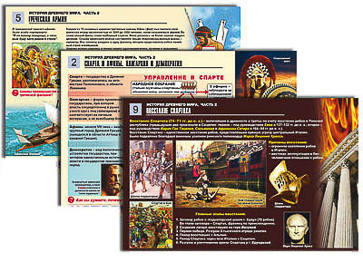 Пособие состоит из 12 полноцветных таблиц, ламинированных глянцевой пленкой. Таблицы: 1. Микенская цивилизация. 2. Спарта и Афины. Олигархия и демократия. 3. Греко-персидские войны. 4. Олимпийские игры. 5. Греческая армия. 6. Завоевательные походы Александра Македонского. 7. Пунические войны. Рим и Карфаген. 8. Римская республика в III в. до н. э. 9. Восстание Спартака. 10. Римский легион. 11. Памятники искусства и архитектуры Древнего Рима. 12. Зарождение христианства.