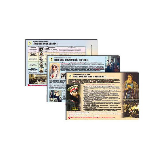 Таблицы: 1. Реформы начала царствования Александра I. 2. Отечественная война 1812 г. Малая война. 3. Тайные общества при Александре I. 4. Собственная Его Императорского Величества Канцелярия. 5. Подвиг врачей в Крымскую войну 1853–1856 гг. 6. Памятники победы России над Наполеоном. 7. Либеральные реформы 60–70 гг. XIX в. 8. Отмена крепостного права (19 февраля 1861 г.). 9. Радикальные общественные движения 1870-х – начала 80-х гг. XIX в. 10. Псевдорусский стиль в архитектуре России конца XIX в.