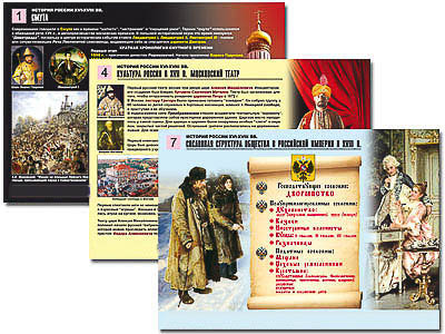Таблицы: 1. Смута. 2. Формирование всероссийского рынка XVII в. 3. Этапы закрепощения крестьян в России в XV–XVII вв. 4. Культура России в XVII в. Московский театр. 5. Государственное устройство России при Петре I, Реформы Петра I. 6. Табель о рангах. 7. Сословная структура общества в Российской империи в XVIII в. 8. Эпоха дворцовых переворотов. 9. Усиление позиций дворянства, "Золотой век" дворянства. 10. Культура России в XVIII в. Гравюра.