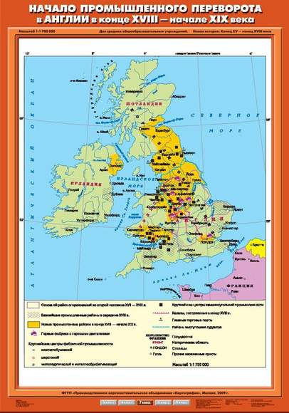 Описание Учебн. карта "Начало промышленного переворота в Англии в конце XVIII - начале XIX вв." (70*100)