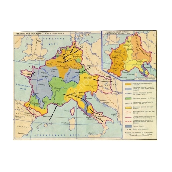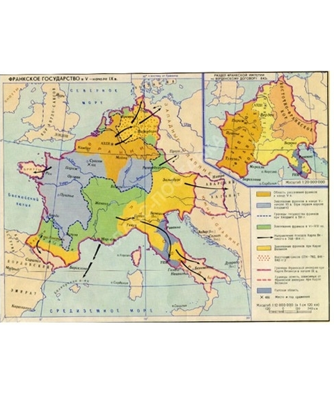 Описание Учебная карта "Франкское государство в V - середине IX в.в." (матовое, 1-стороннее лам.)