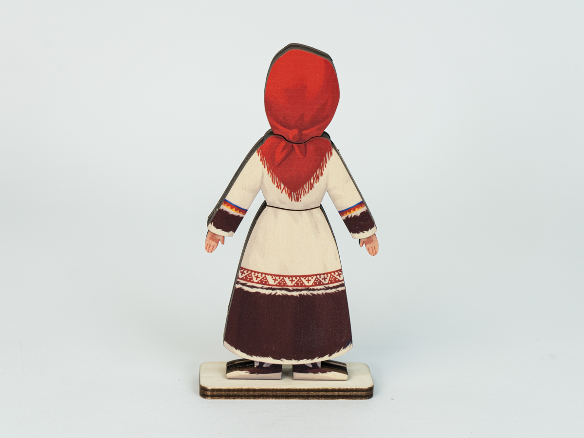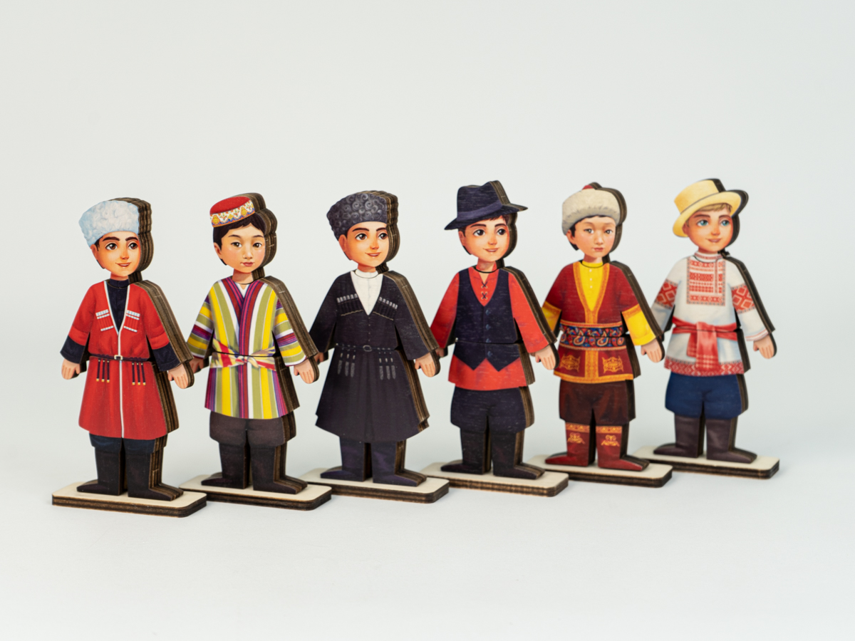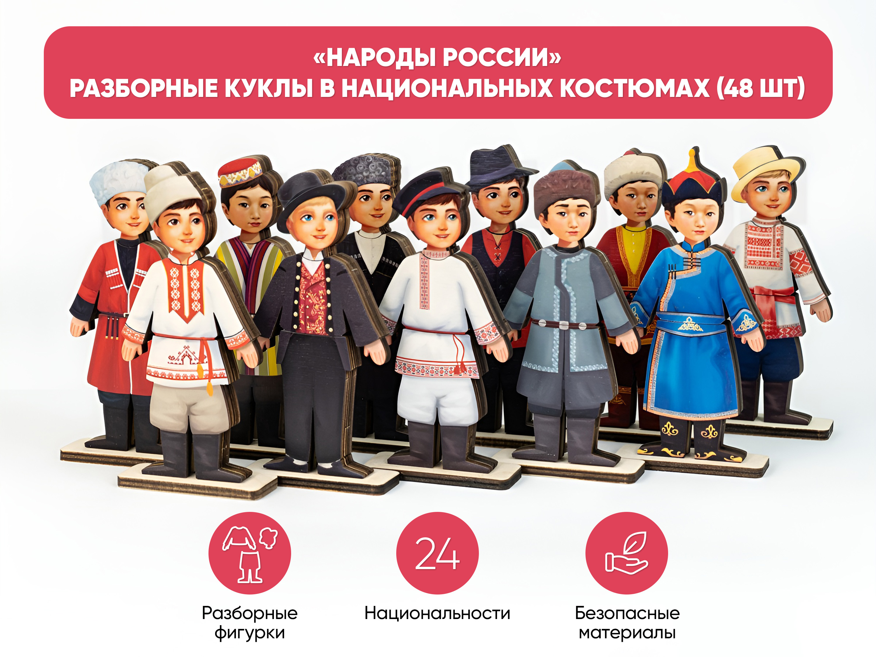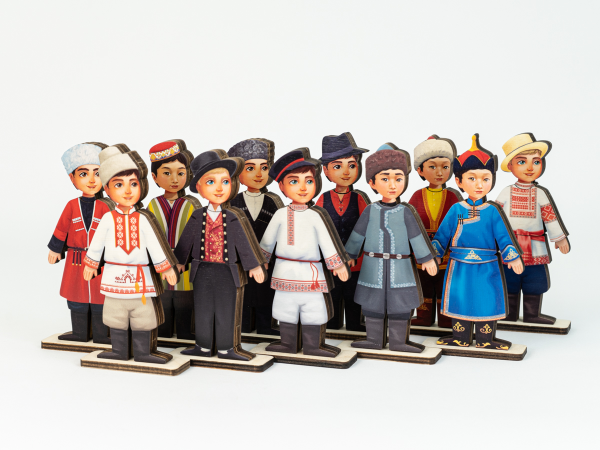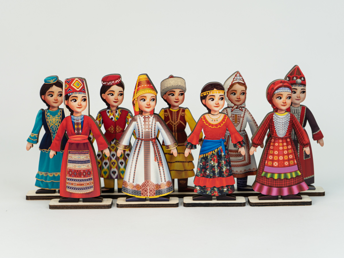 Плоские разборные куклы из ДВП и берёзовой фанеры: состоят из головы, корпуса и нижней части, которые надеваются на основу-подставку. Элементы кукол можно менять между собой для закрепления детских знаний о национальном костюме. Представлены 48 кукол (24 национальности) Высотой 15 см.