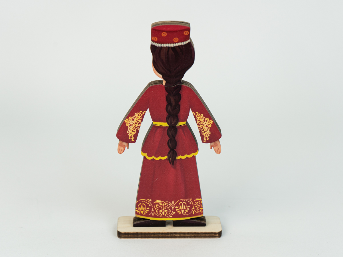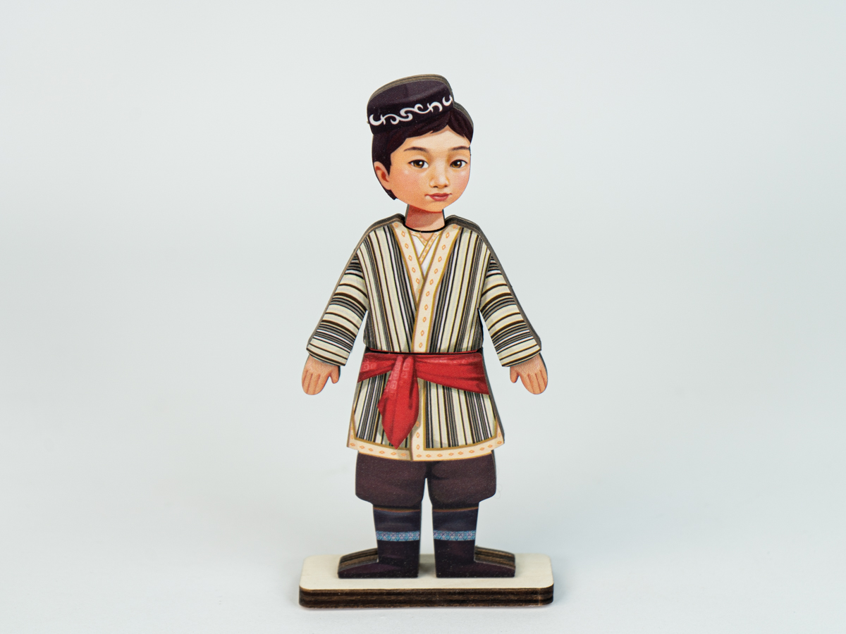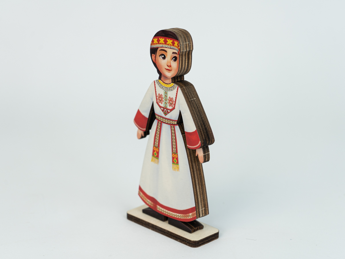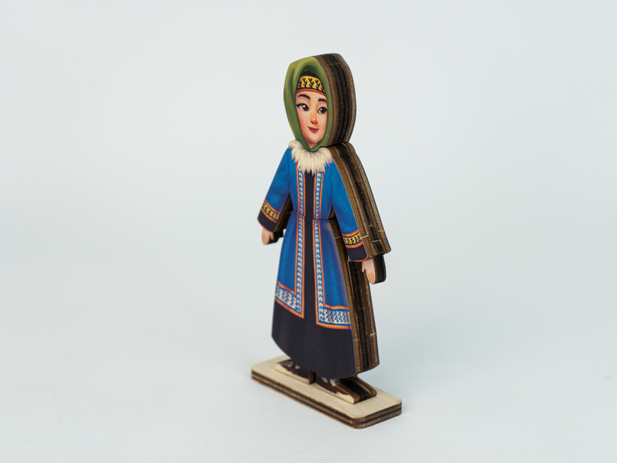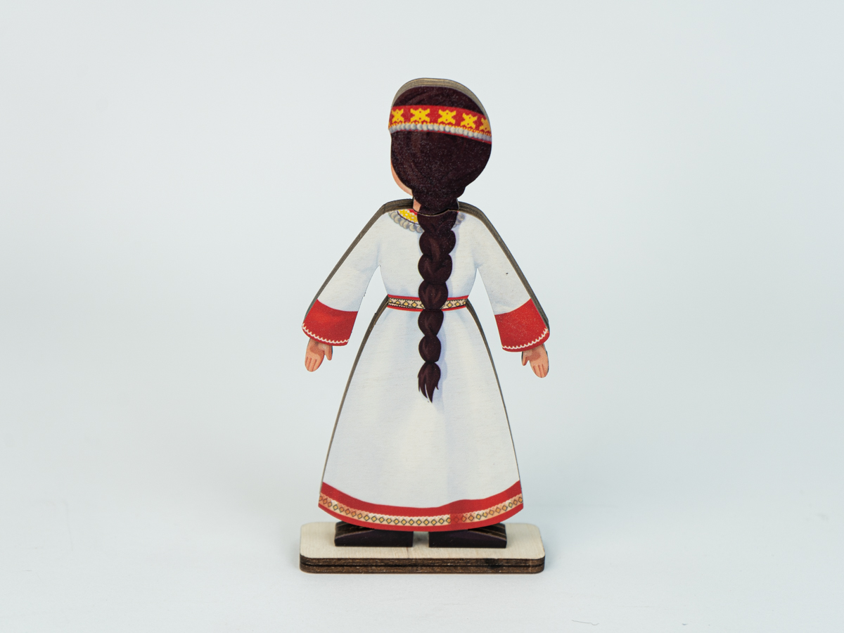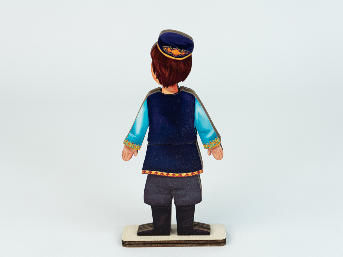 Плоские разборные куклы из ДВП и берёзовой фанеры: состоят из головы, корпуса и нижней части, которые надеваются на основу-подставку. Элементы кукол можно менять между собой для закрепления детских знаний о национальном костюме. Представлены 48 кукол (24 национальности) Высотой 15 см.