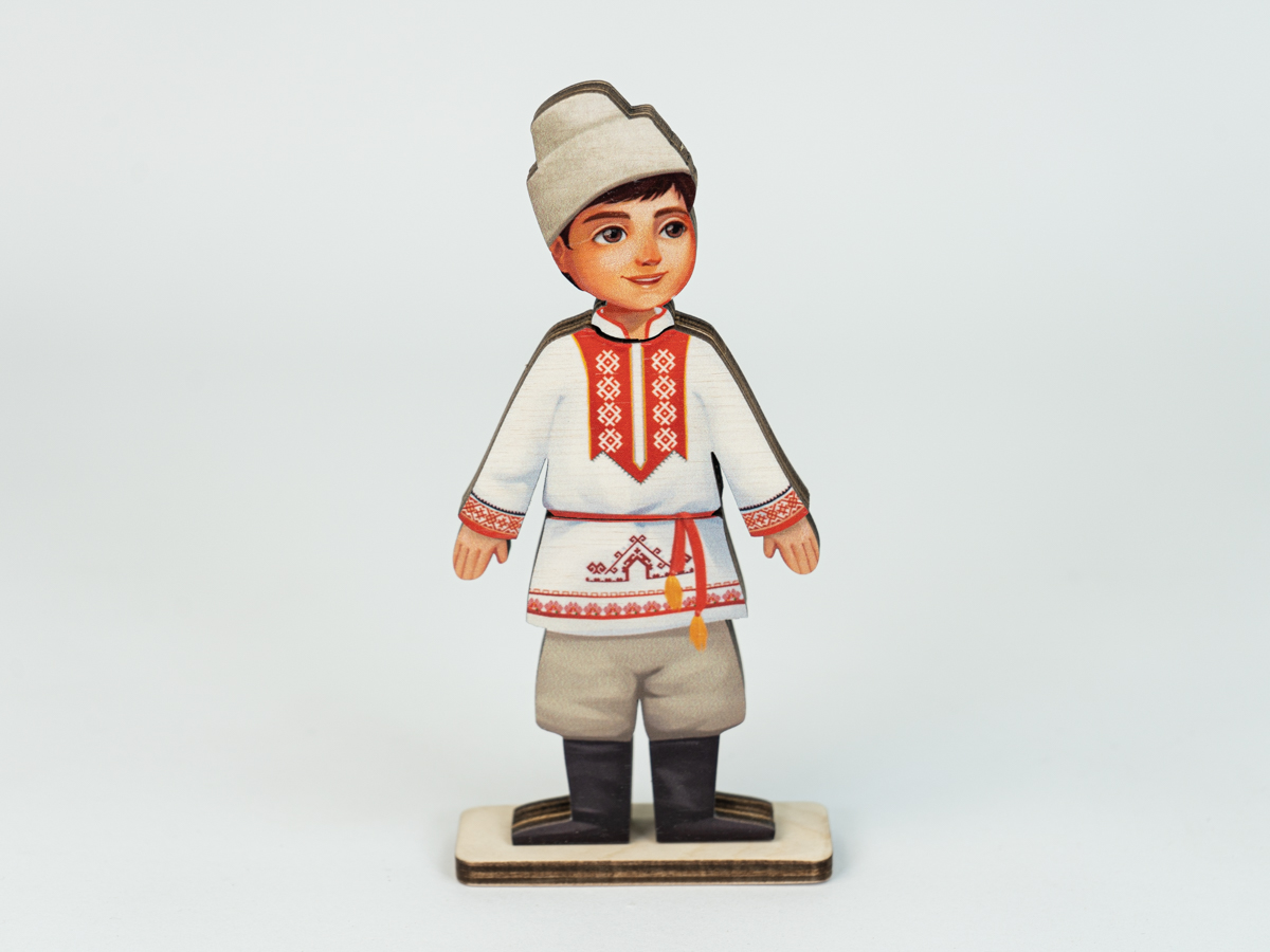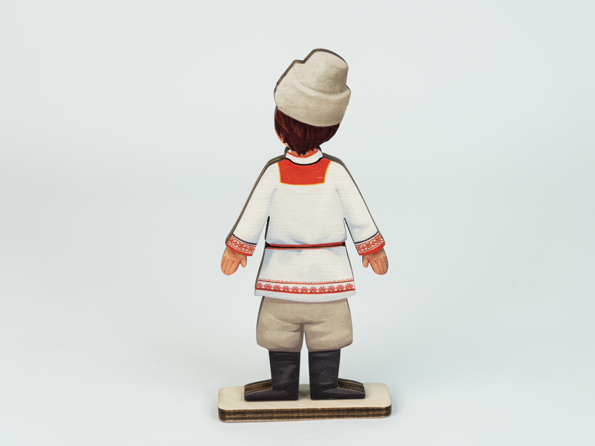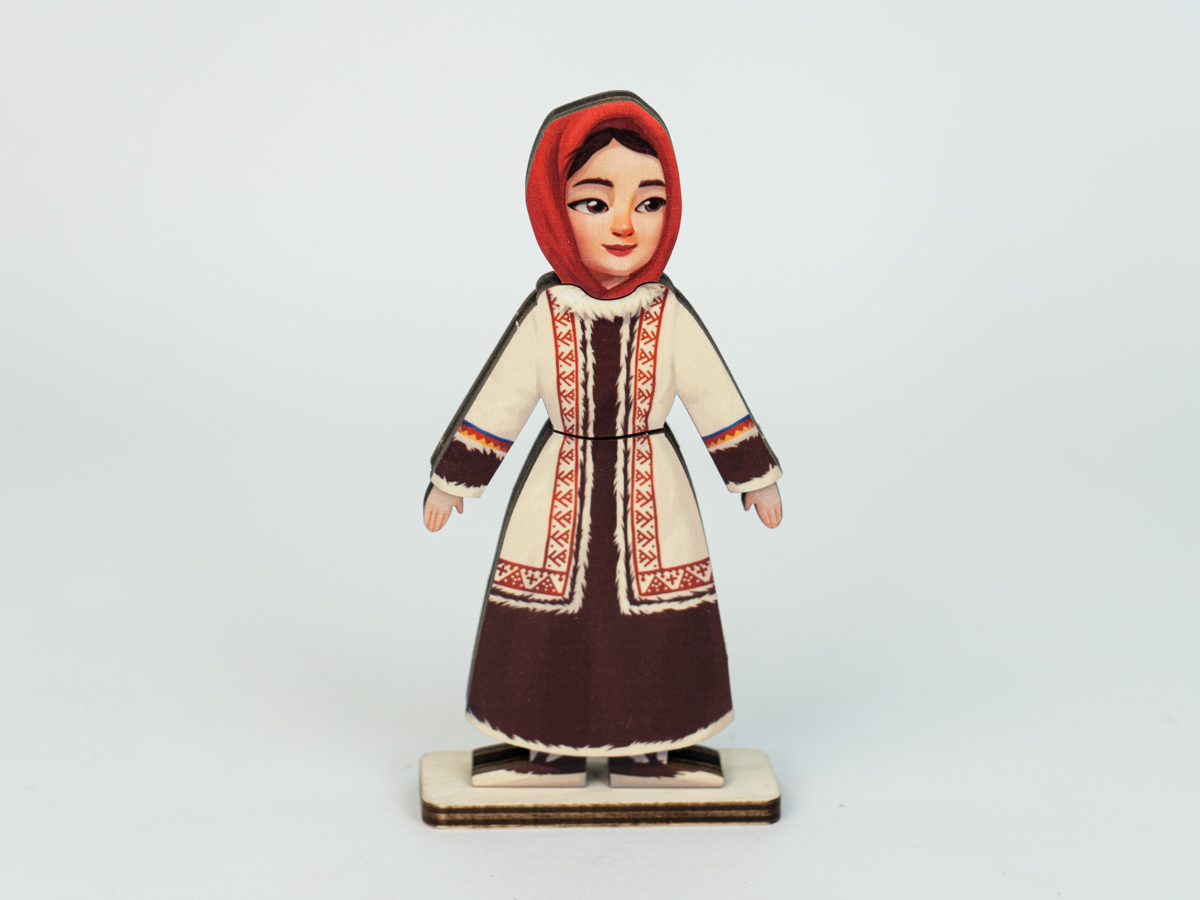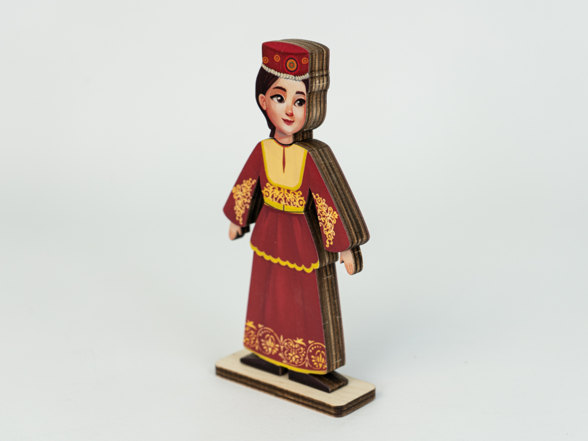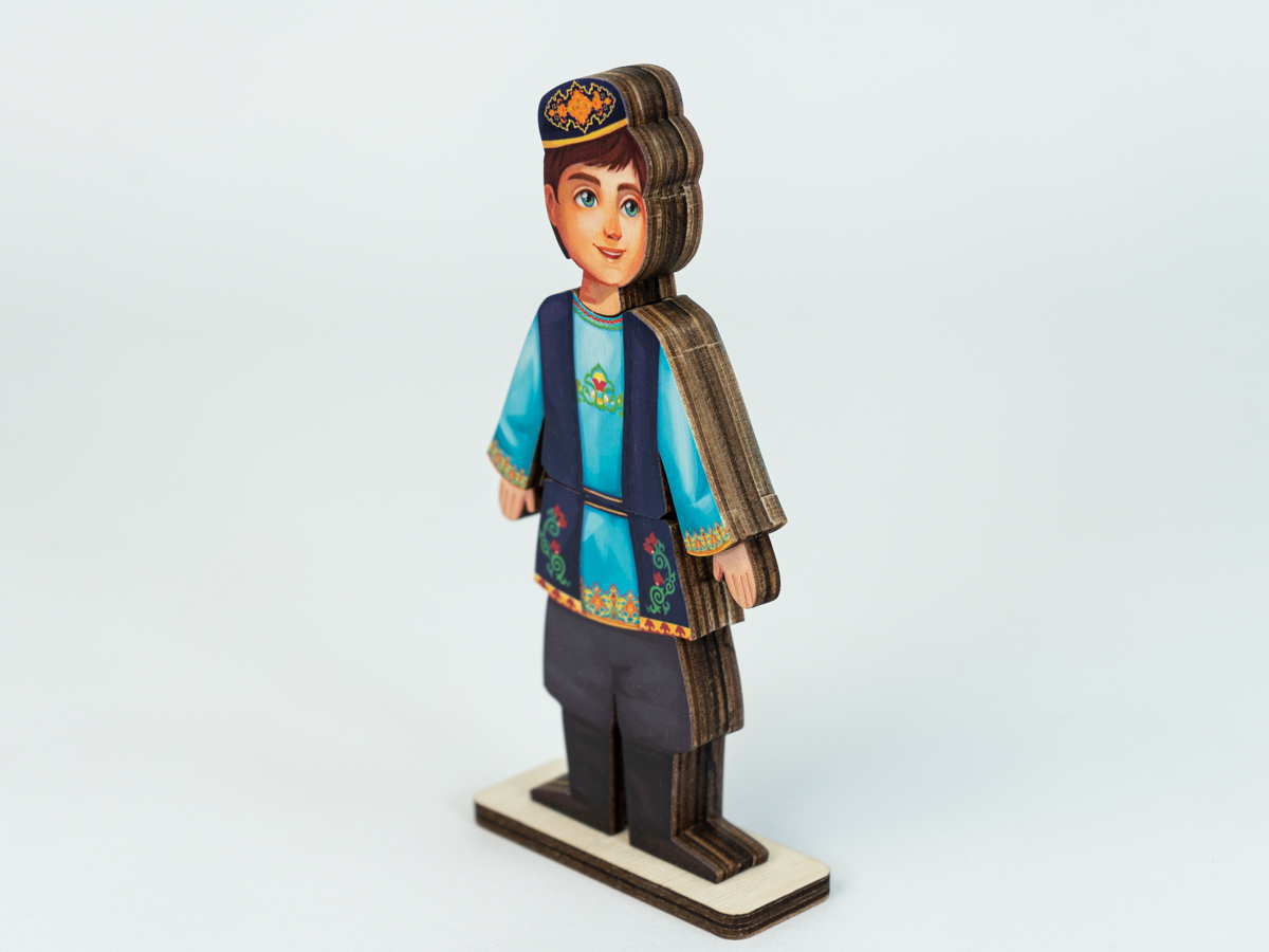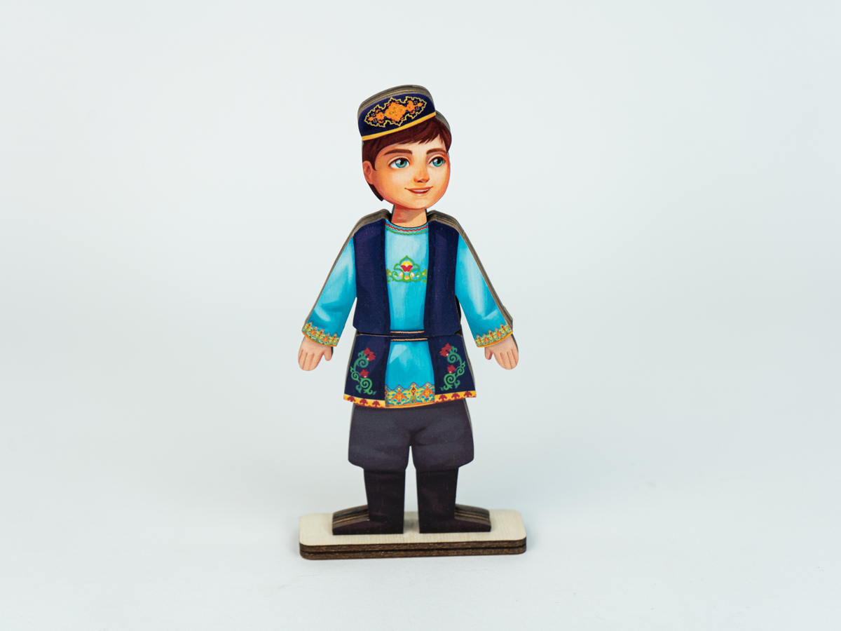 Плоские разборные куклы из ДВП и берёзовой фанеры: состоят из головы, корпуса и нижней части, которые надеваются на основу-подставку. Элементы кукол можно менять между собой для закрепления детских знаний о национальном костюме. Представлены 48 кукол (24 национальности) Высотой 15 см.