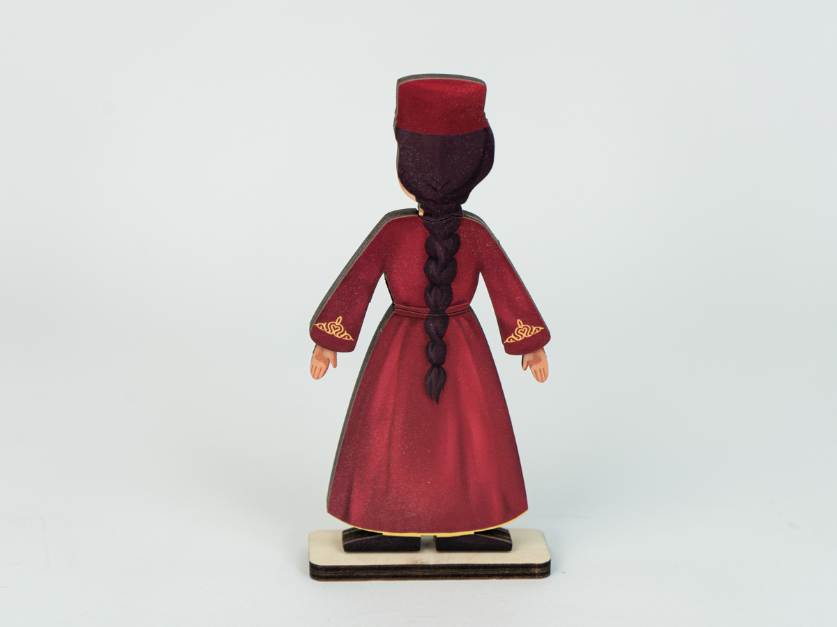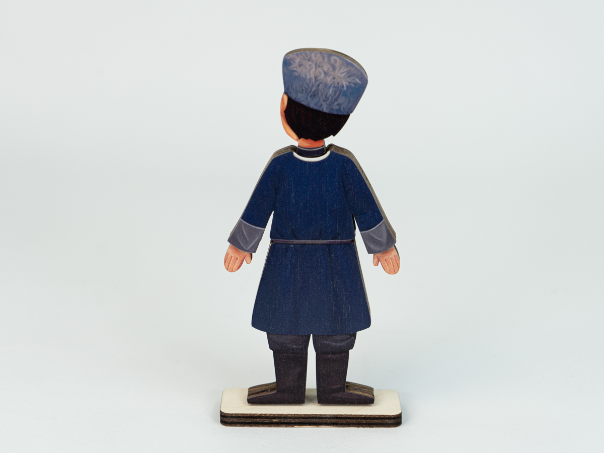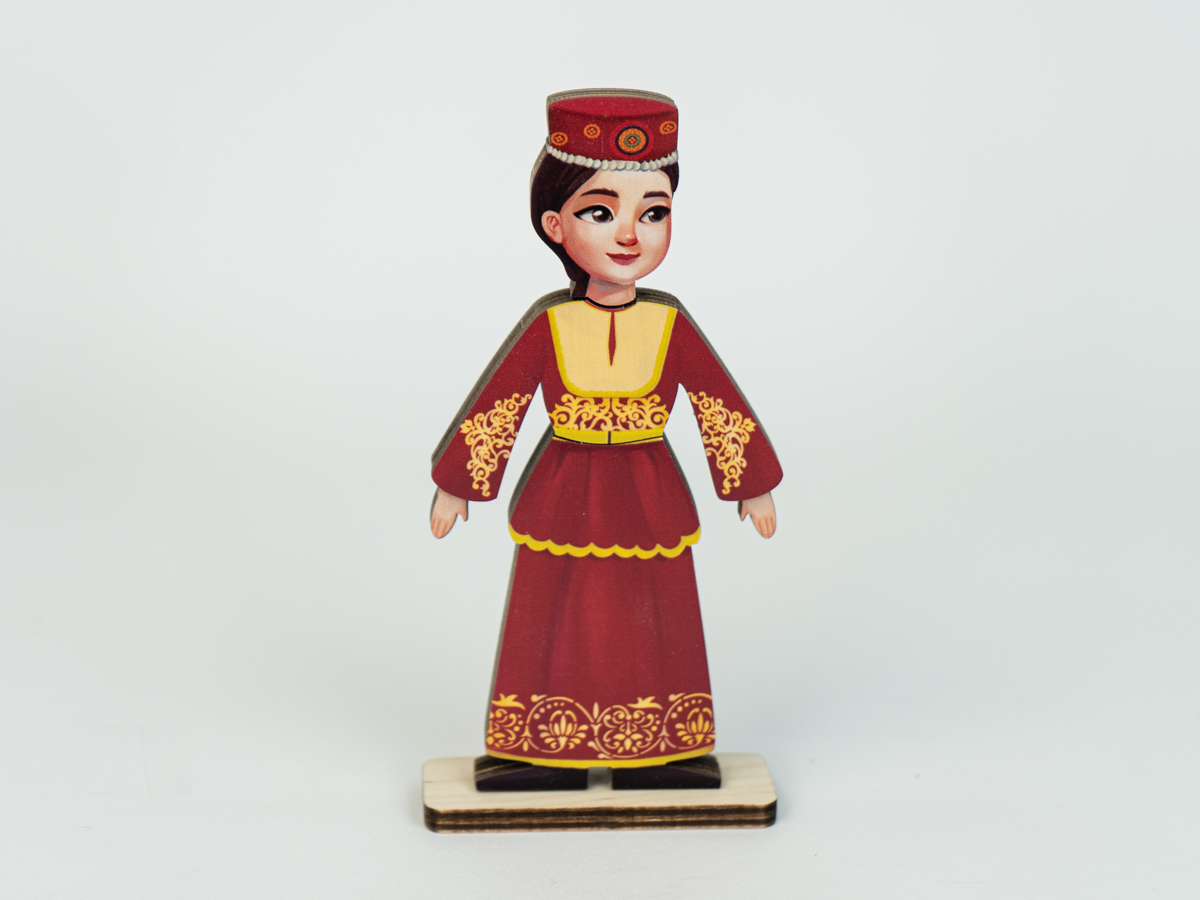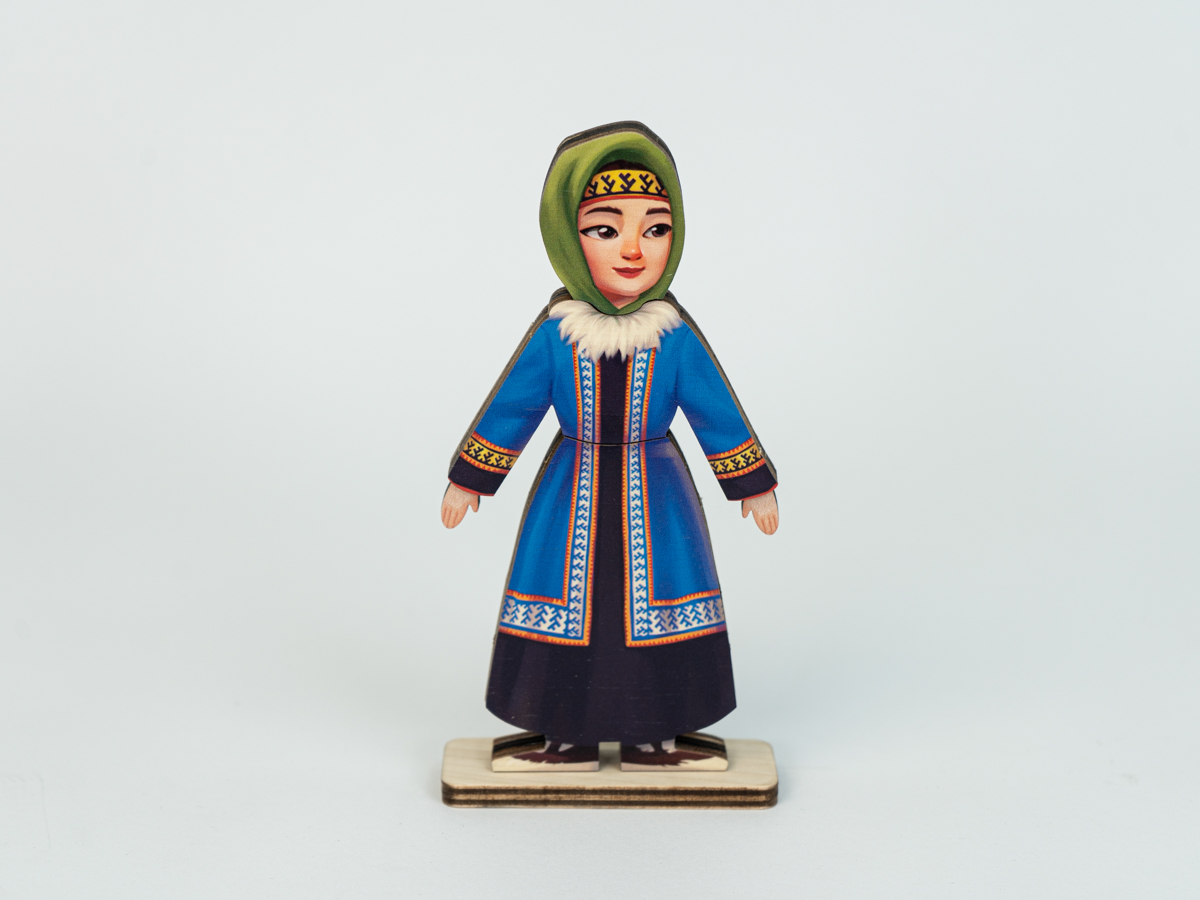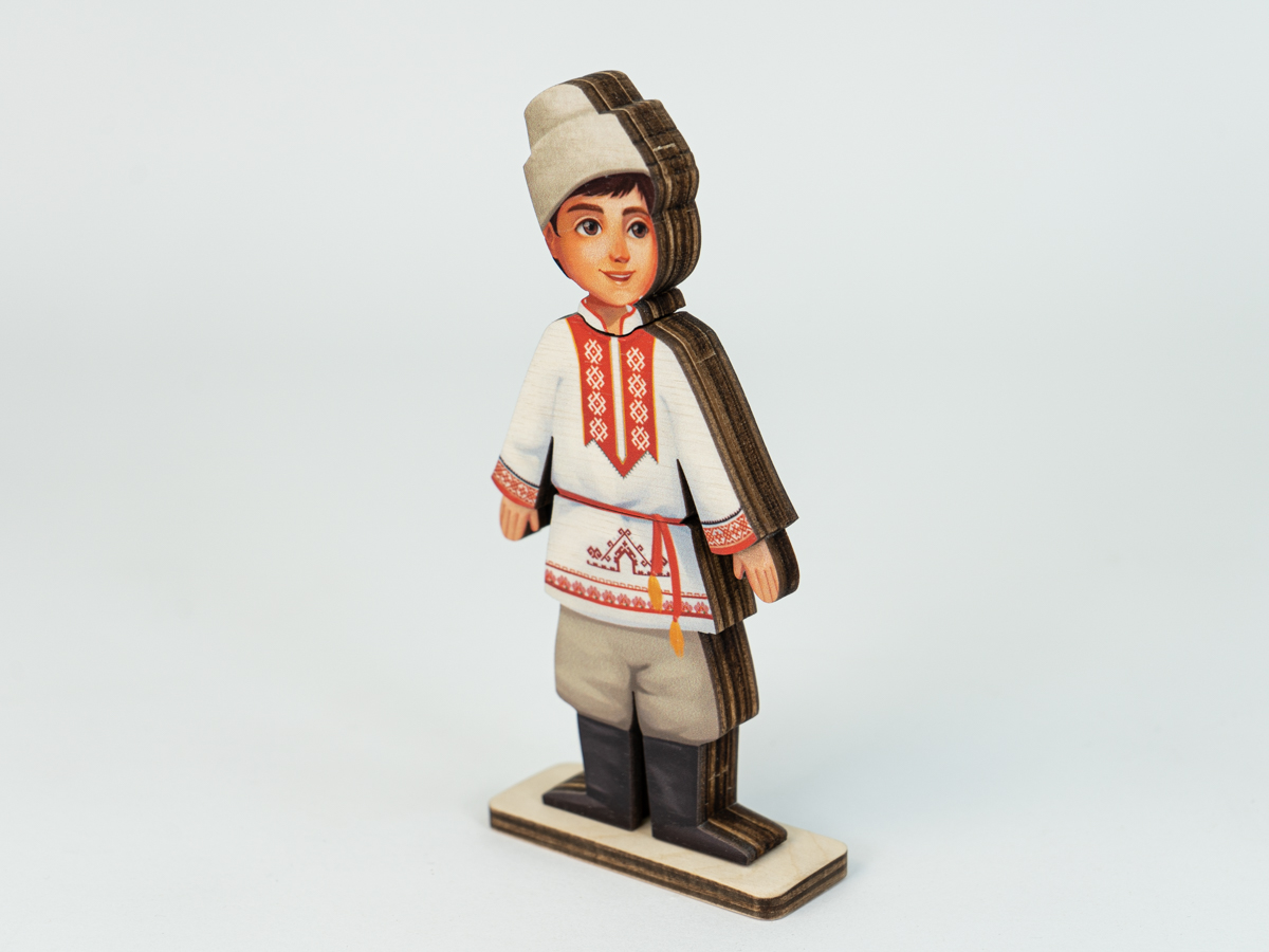 Плоские разборные куклы из ДВП и берёзовой фанеры: состоят из головы, корпуса и нижней части, которые надеваются на основу-подставку. Элементы кукол можно менять между собой для закрепления детских знаний о национальном костюме. Представлены 48 кукол (24 национальности) Высотой 15 см.