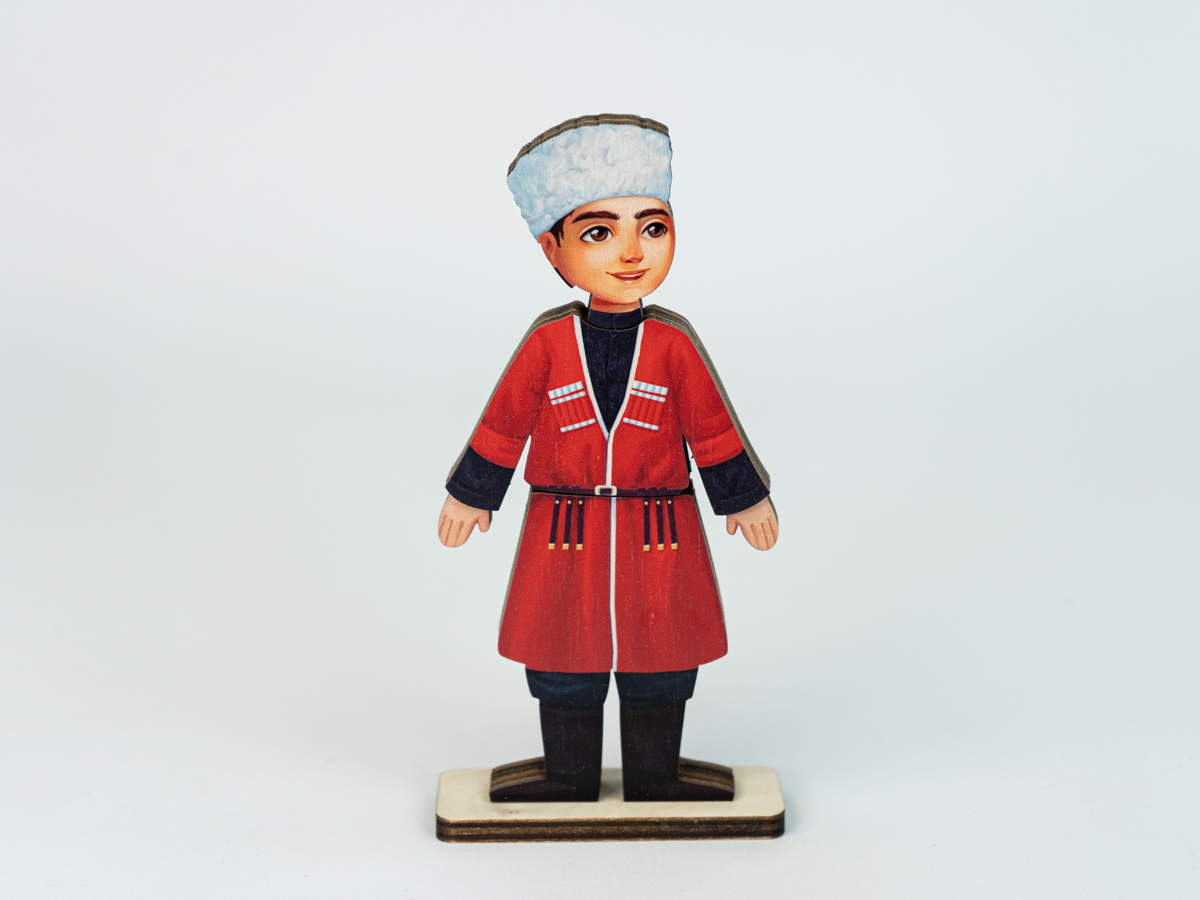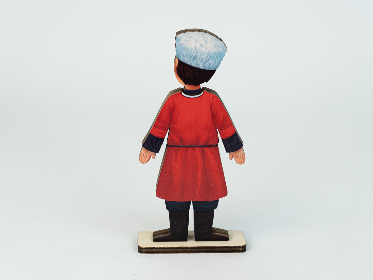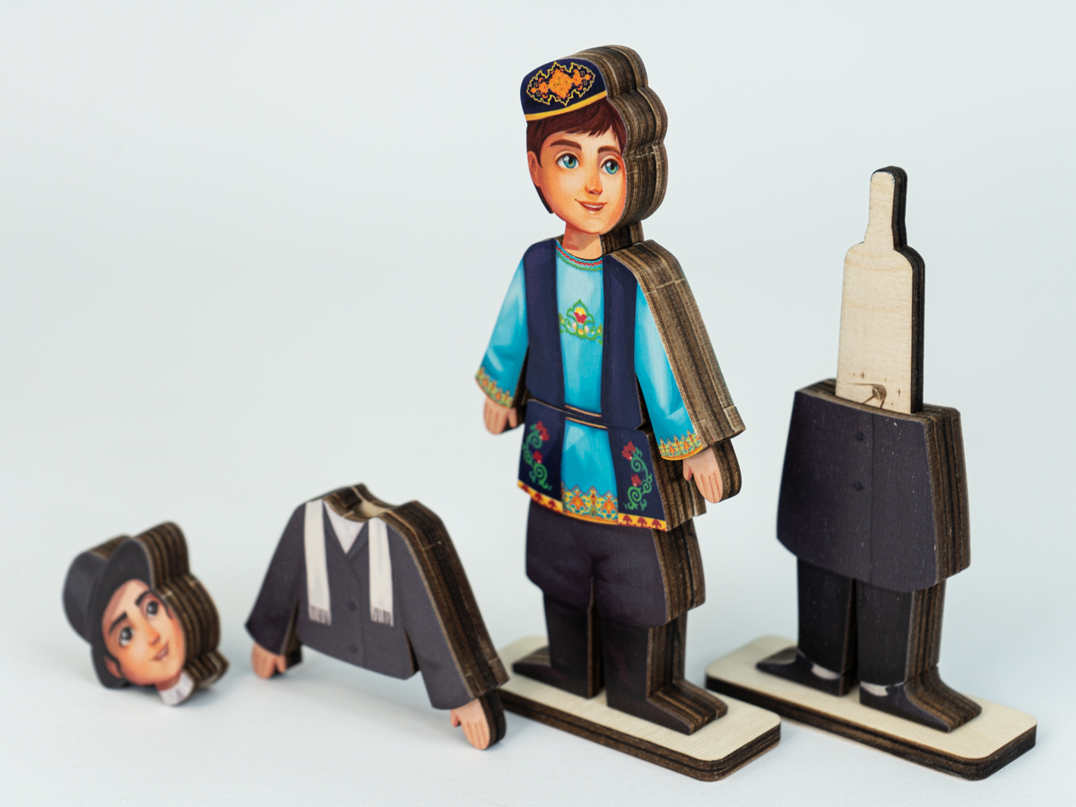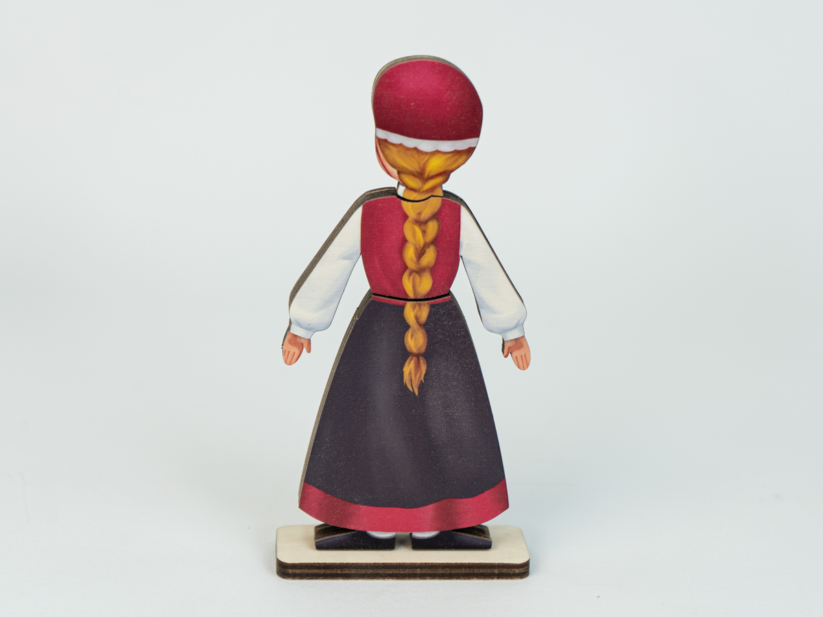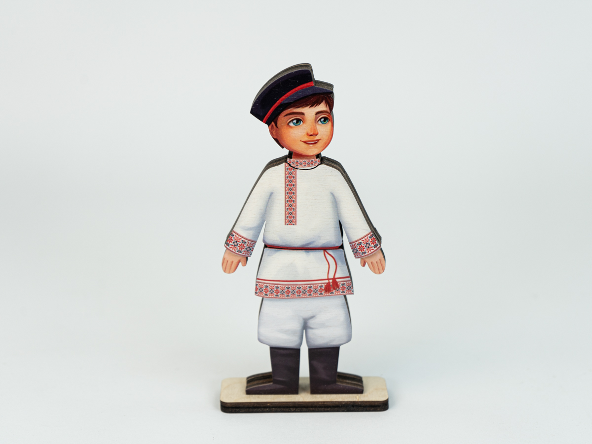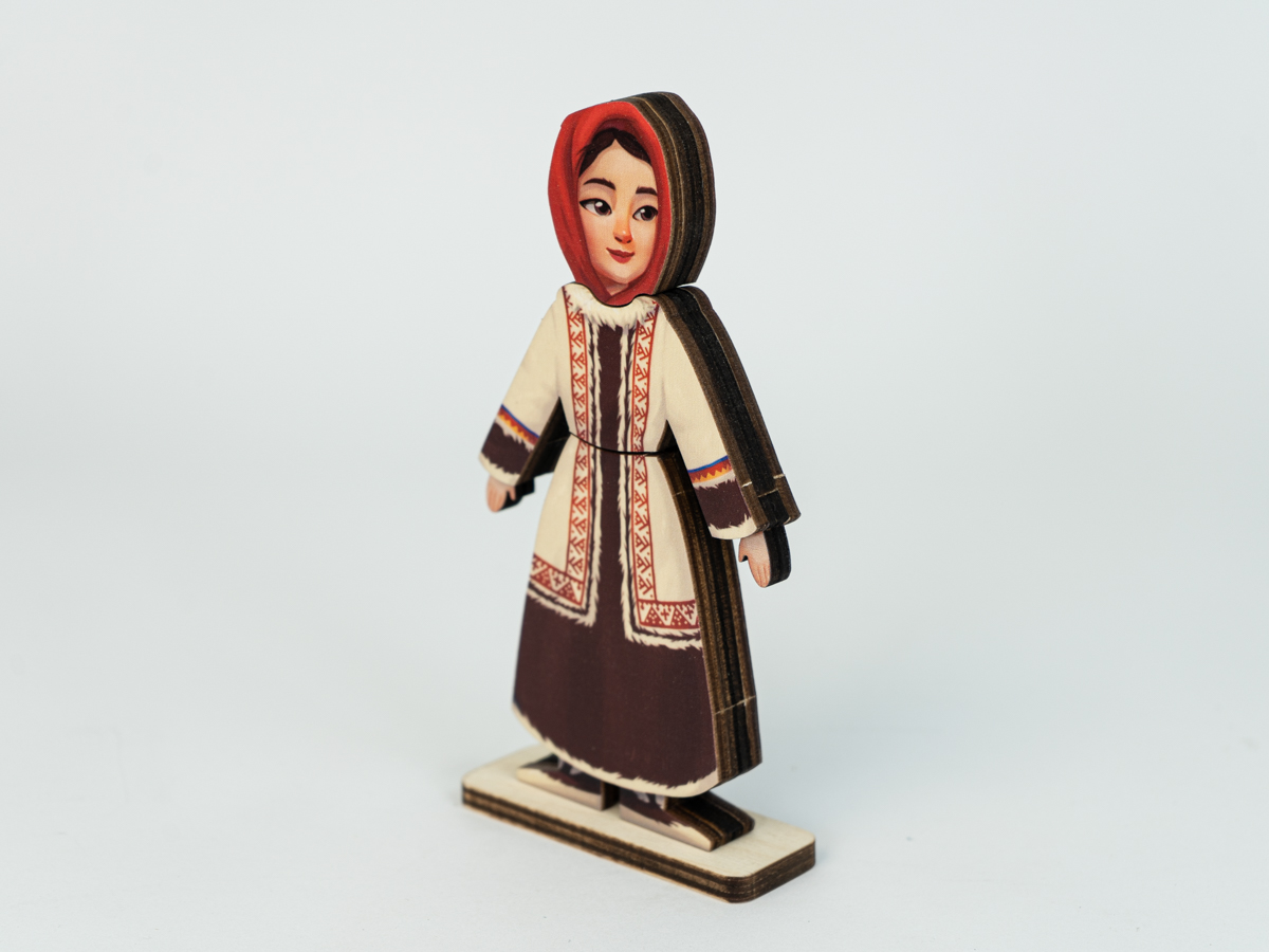 Плоские разборные куклы из ДВП и берёзовой фанеры: состоят из головы, корпуса и нижней части, которые надеваются на основу-подставку. Элементы кукол можно менять между собой для закрепления детских знаний о национальном костюме. Представлены 48 кукол (24 национальности) Высотой 15 см.
