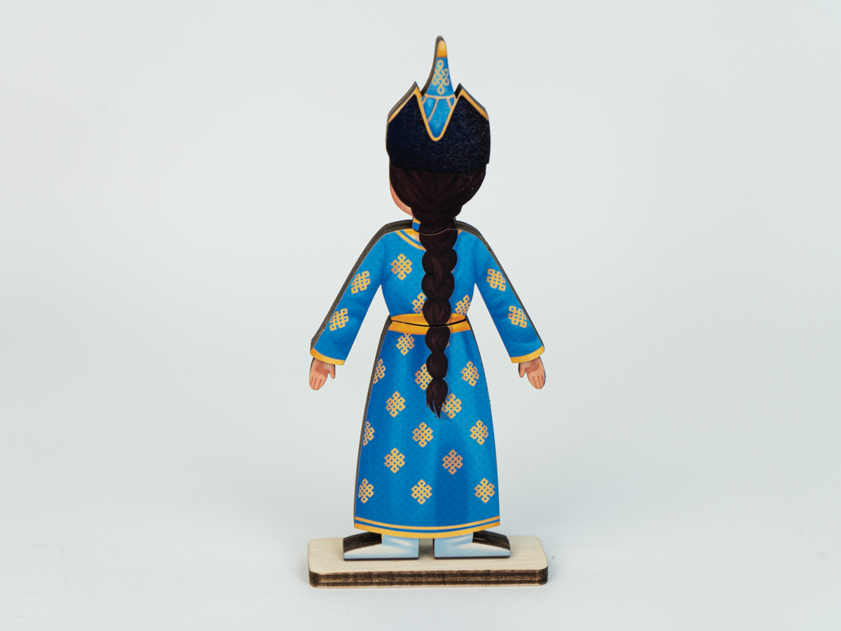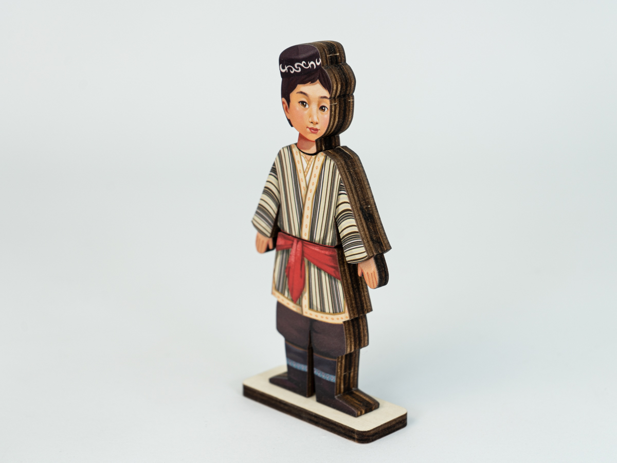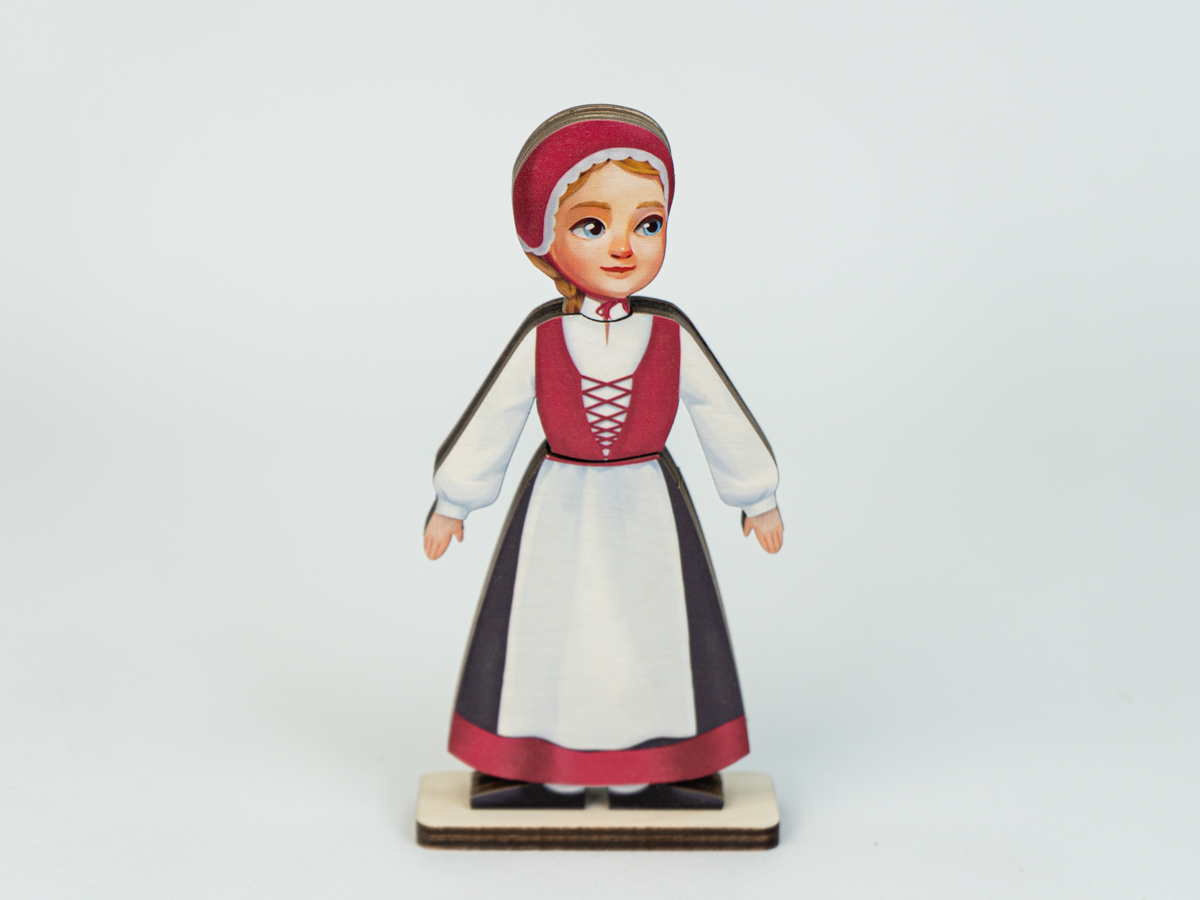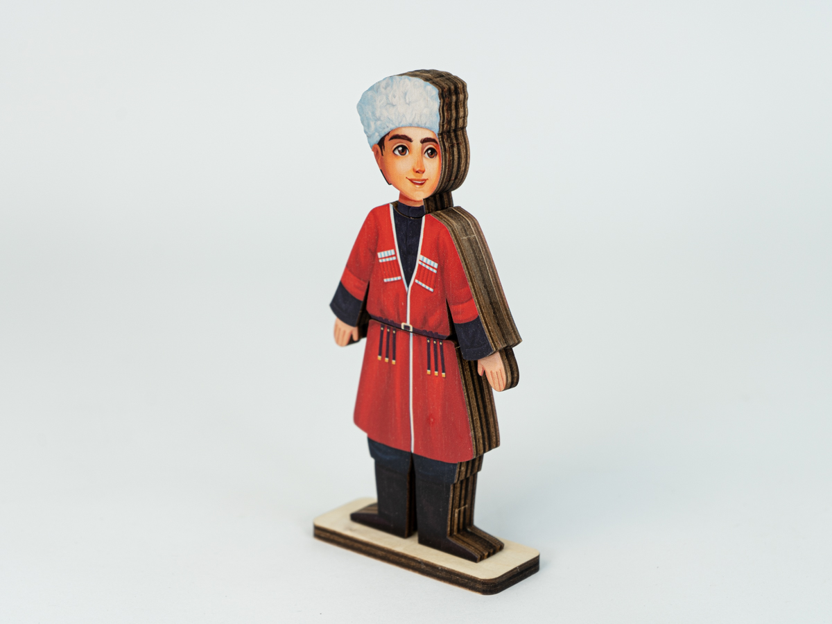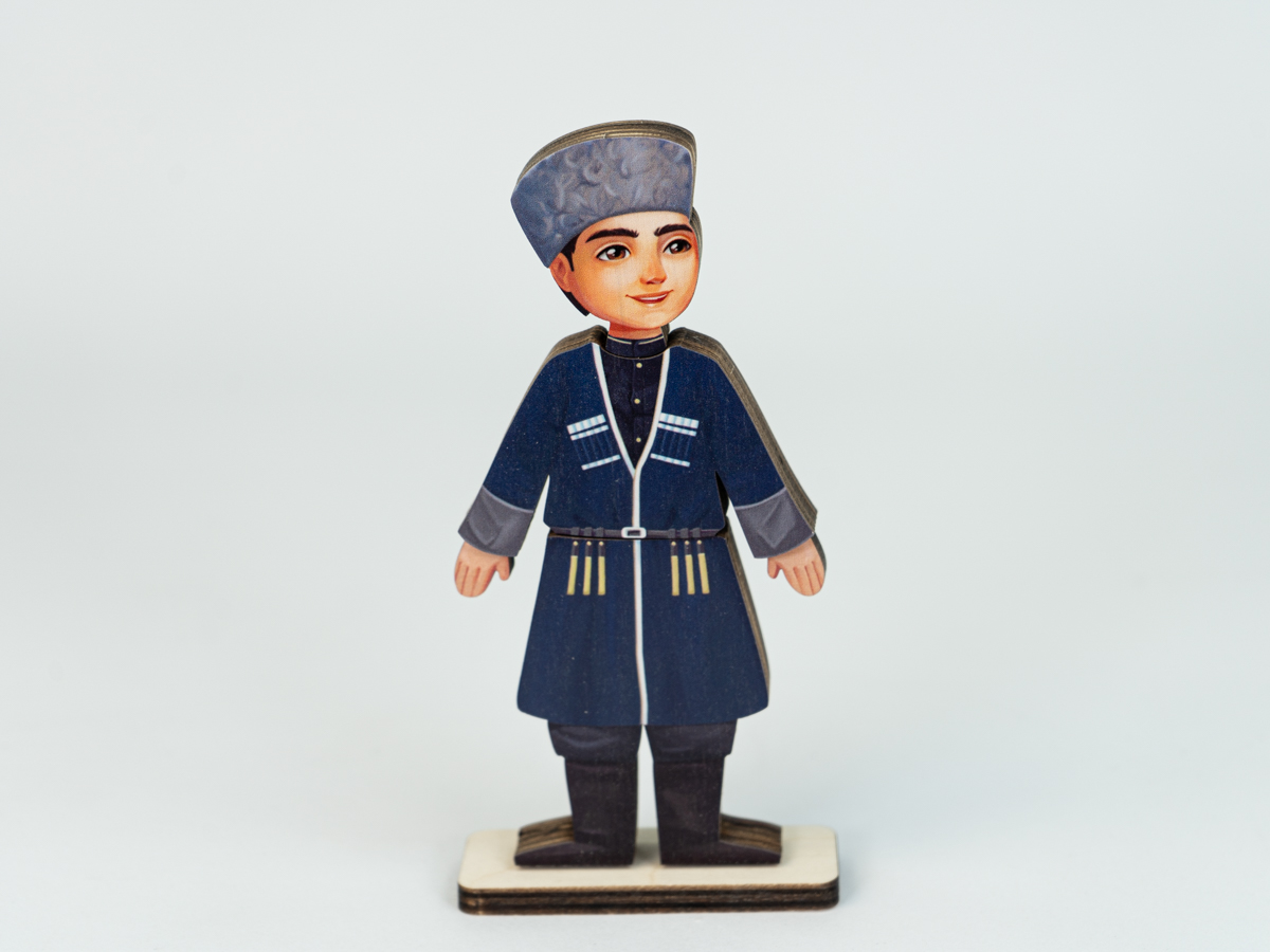 Плоские разборные куклы из ДВП и берёзовой фанеры: состоят из головы, корпуса и нижней части, которые надеваются на основу-подставку. Элементы кукол можно менять между собой для закрепления детских знаний о национальном костюме. Представлены 48 кукол (24 национальности) Высотой 15 см.