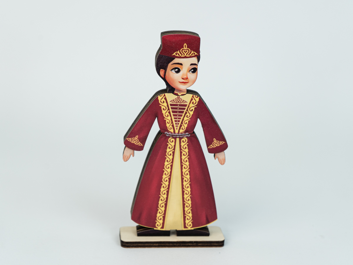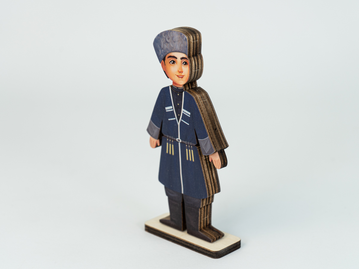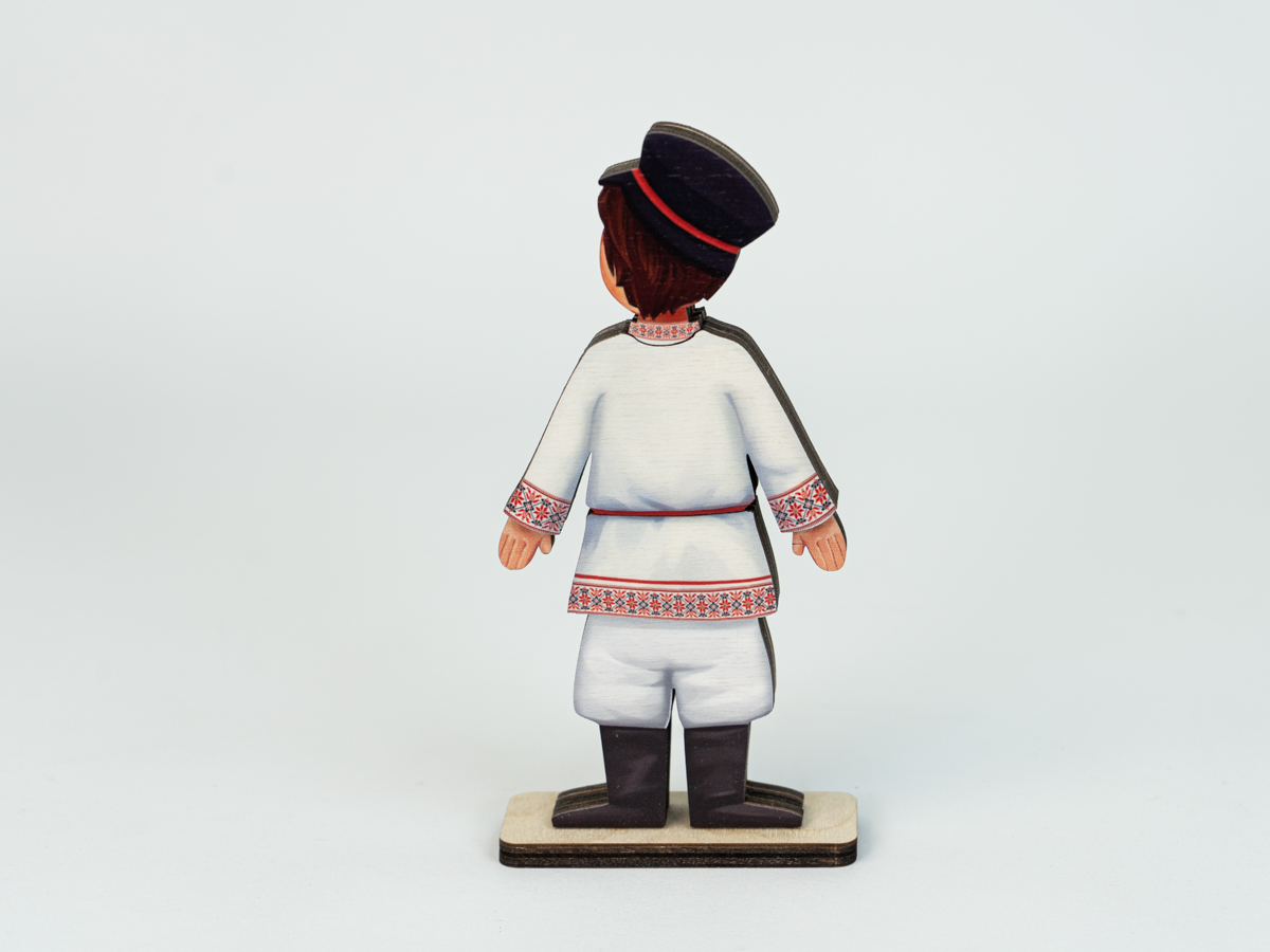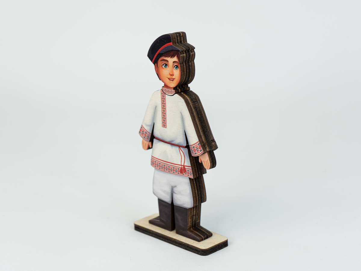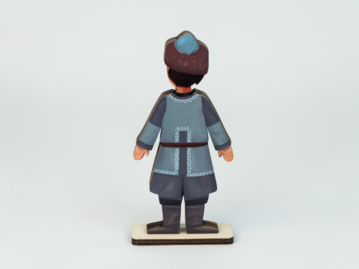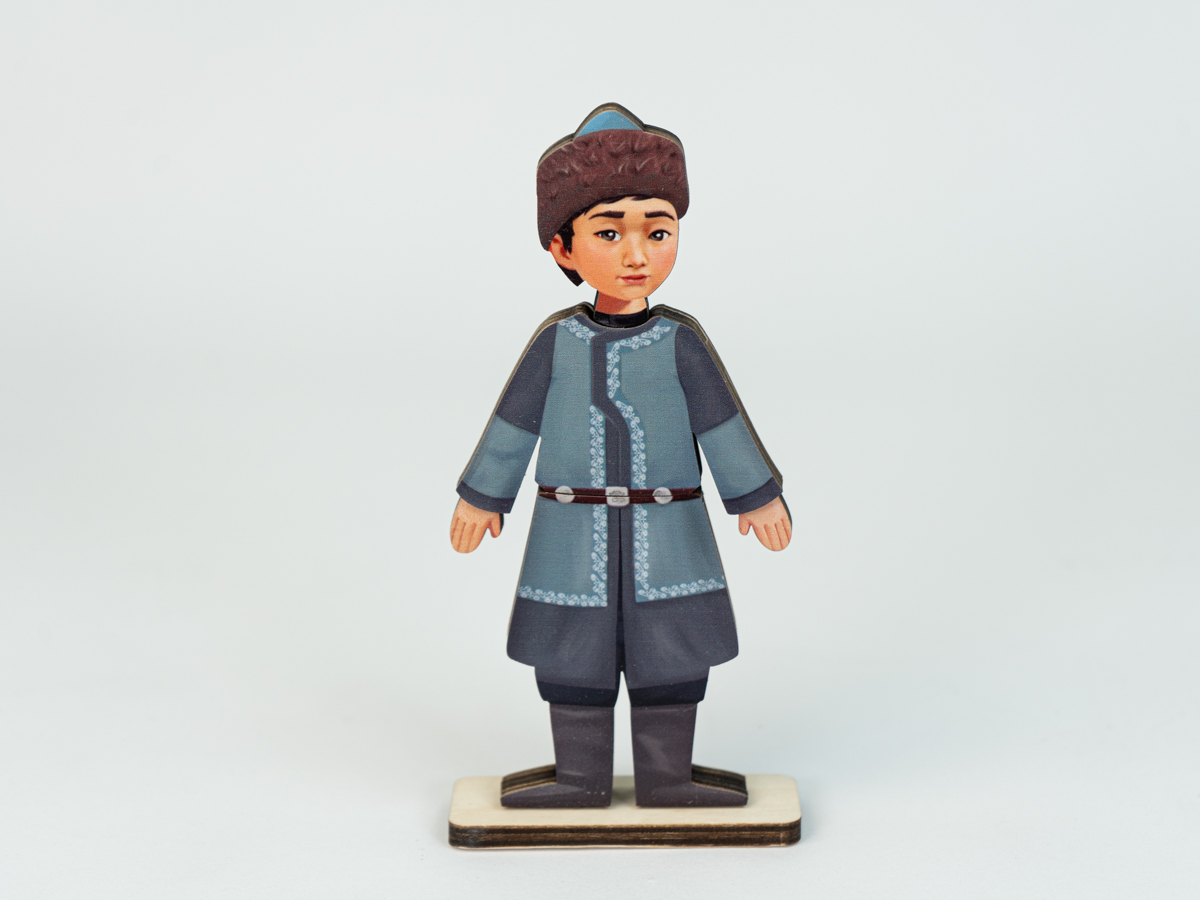 Плоские разборные куклы из ДВП и берёзовой фанеры: состоят из головы, корпуса и нижней части, которые надеваются на основу-подставку. Элементы кукол можно менять между собой для закрепления детских знаний о национальном костюме. Представлены 48 кукол (24 национальности) Высотой 15 см.