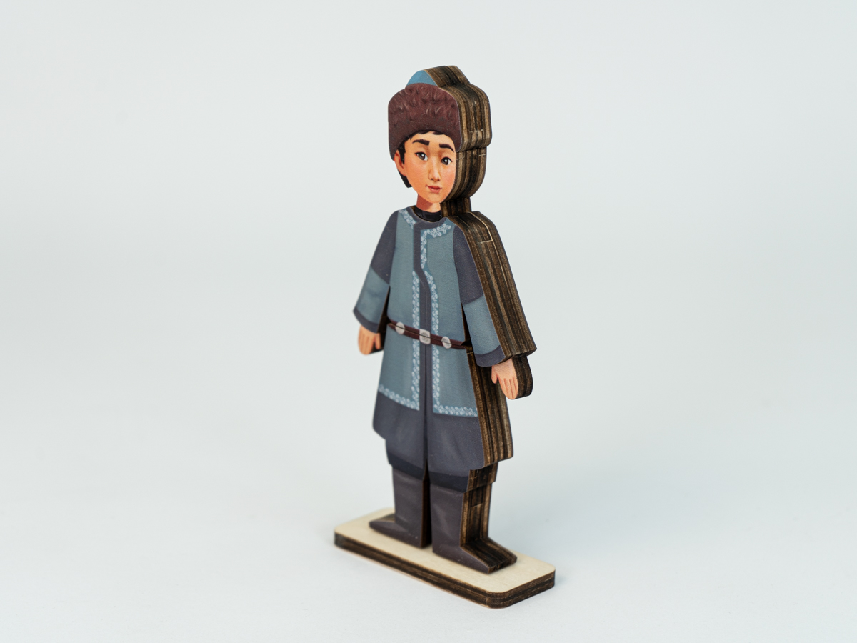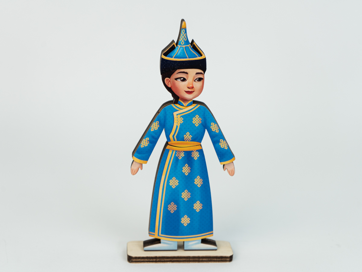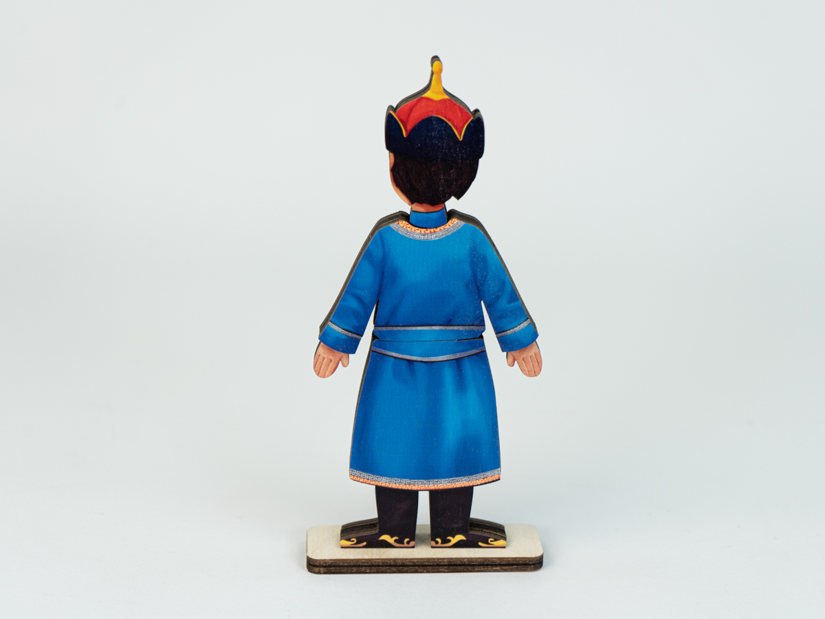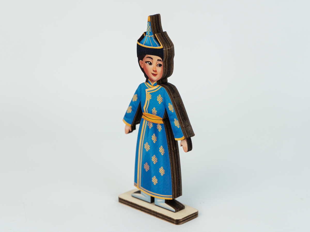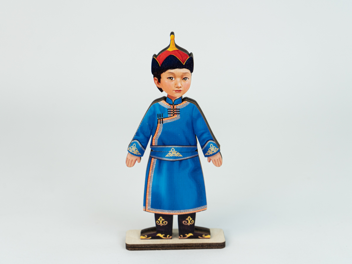 Плоские разборные куклы из ДВП и берёзовой фанеры: состоят из головы, корпуса и нижней части, которые надеваются на основу-подставку. Элементы кукол можно менять между собой для закрепления детских знаний о национальном костюме. Представлены 48 кукол (24 национальности) Высотой 15 см.