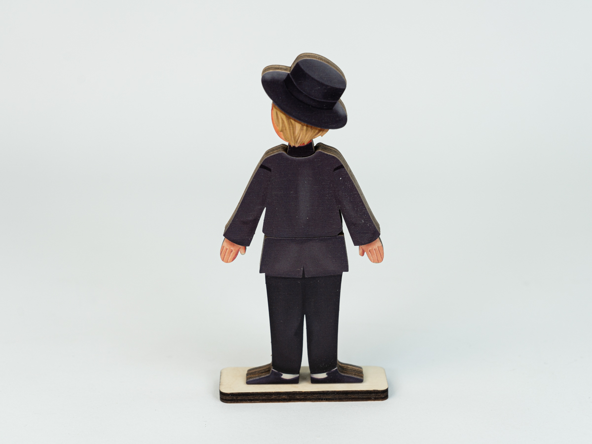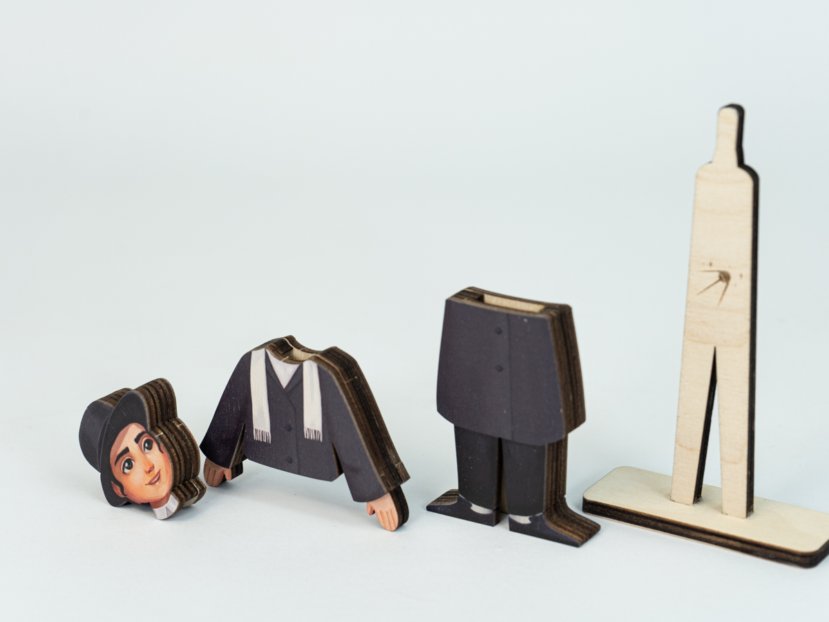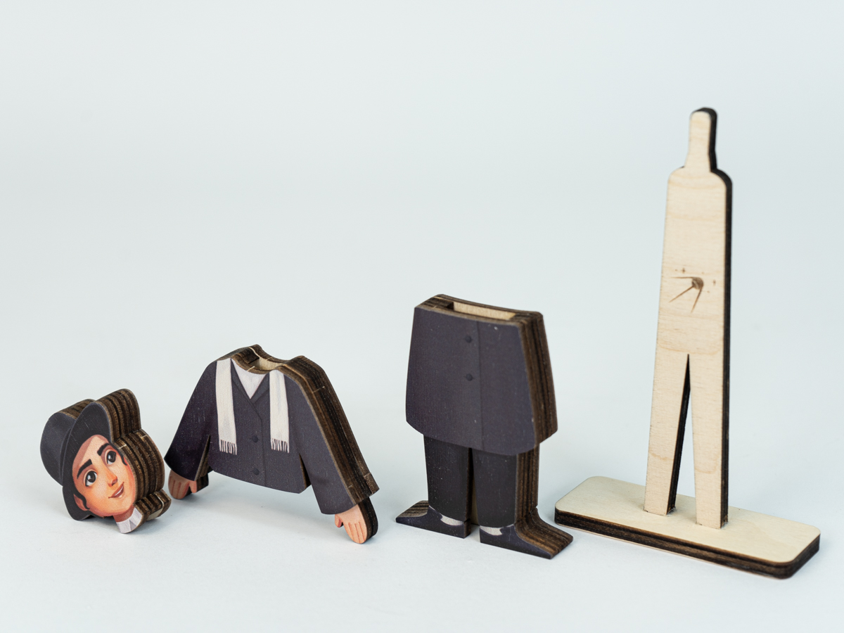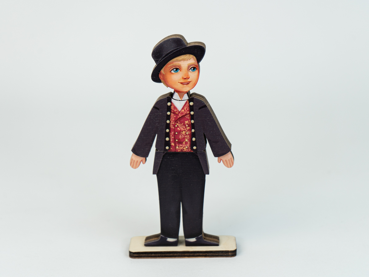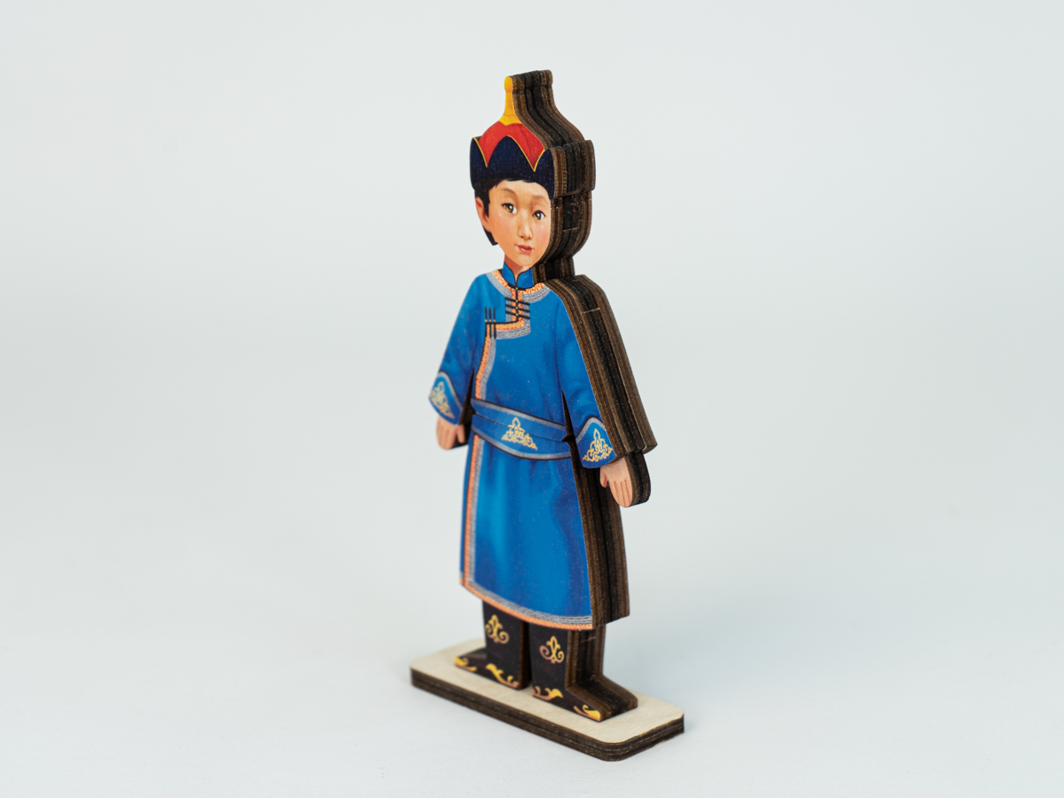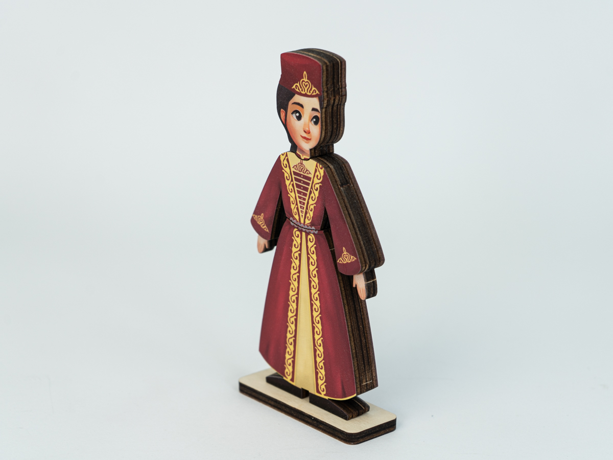 Плоские разборные куклы из ДВП и берёзовой фанеры: состоят из головы, корпуса и нижней части, которые надеваются на основу-подставку. Элементы кукол можно менять между собой для закрепления детских знаний о национальном костюме. Представлены 48 кукол (24 национальности) Высотой 15 см.