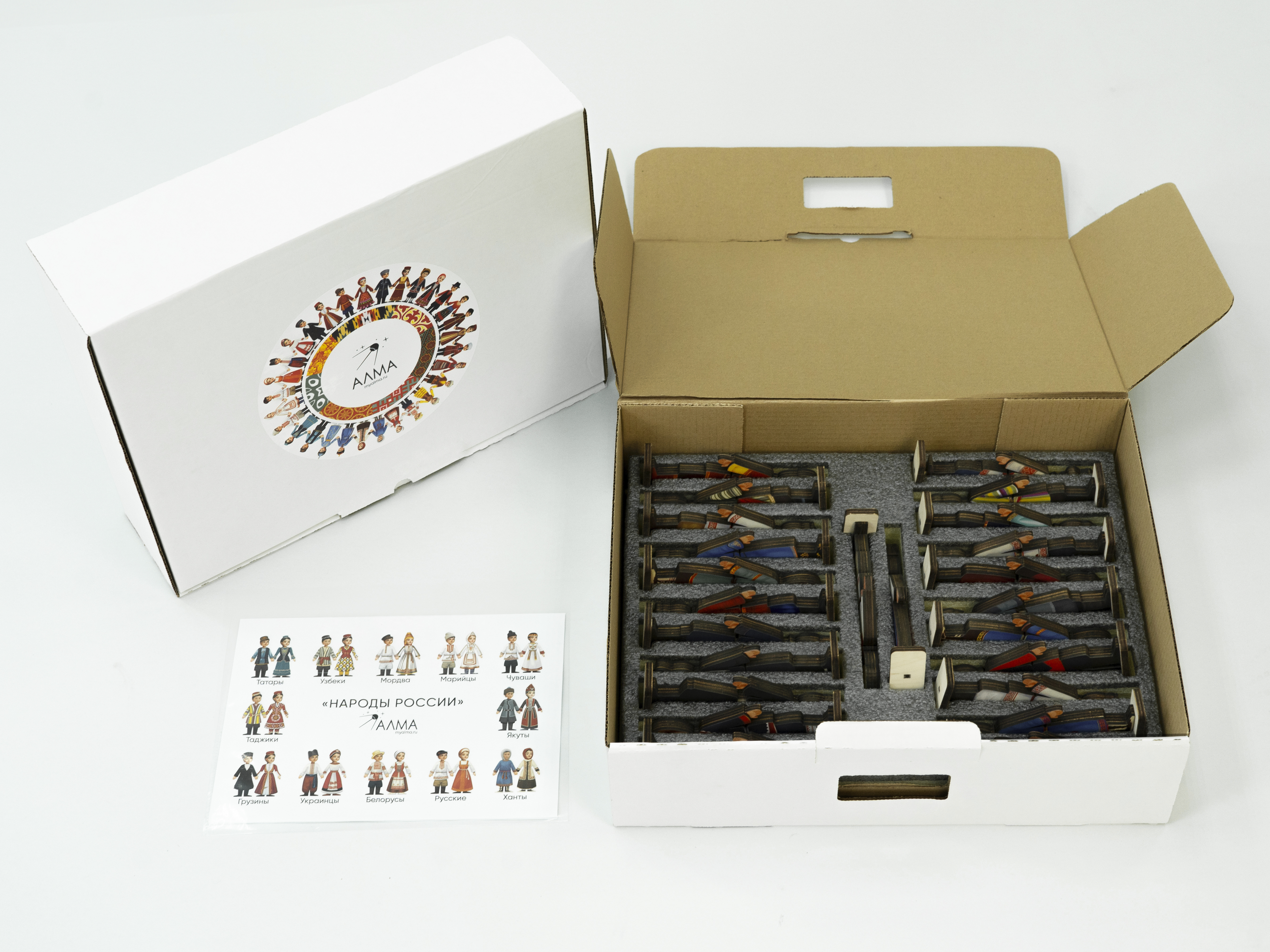 Предусмотрена удобная система хранения кукол в коробке. В комплекте идёт цветное пособие с названием национальностей.