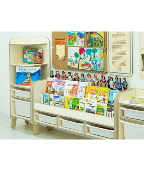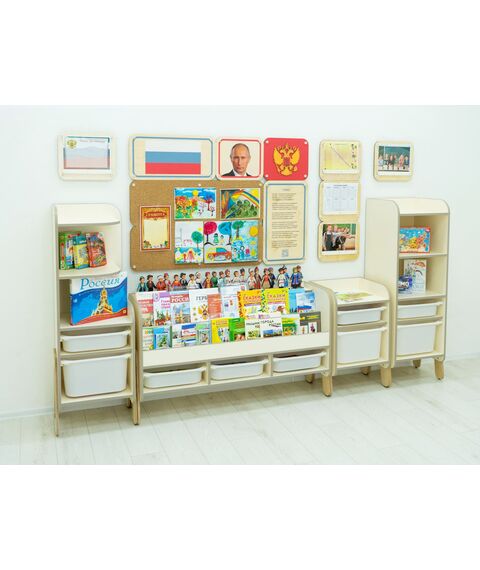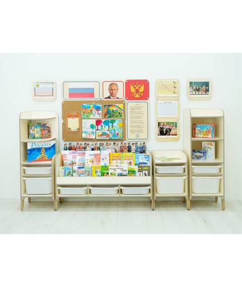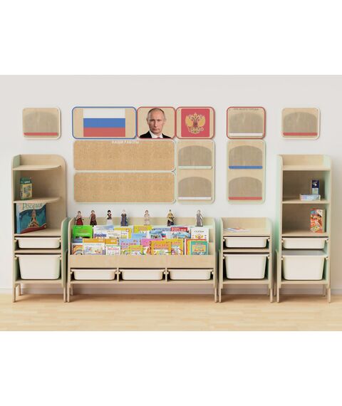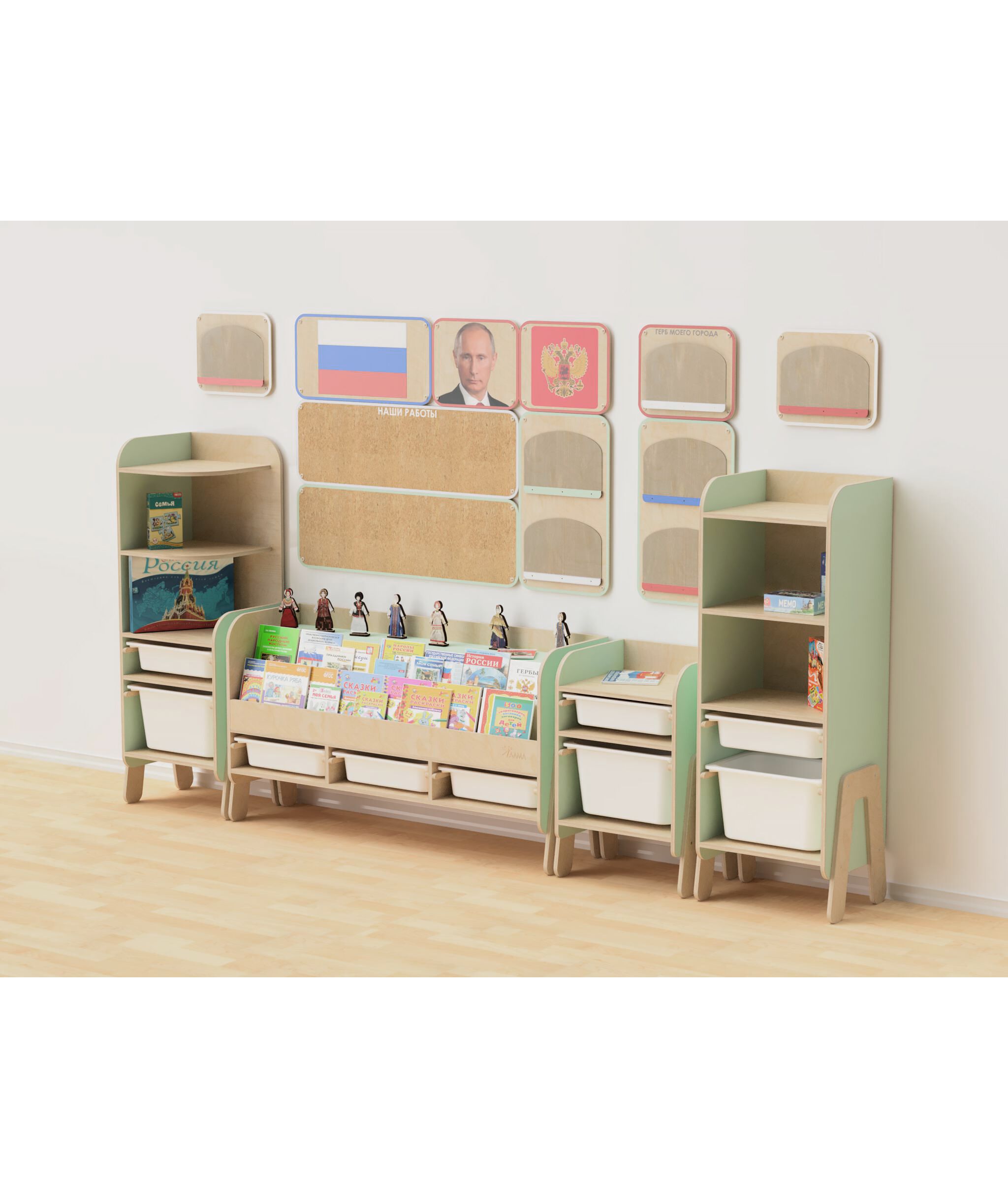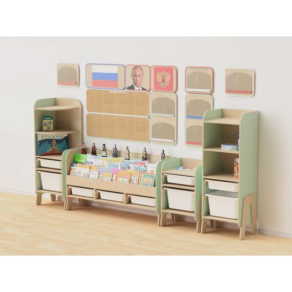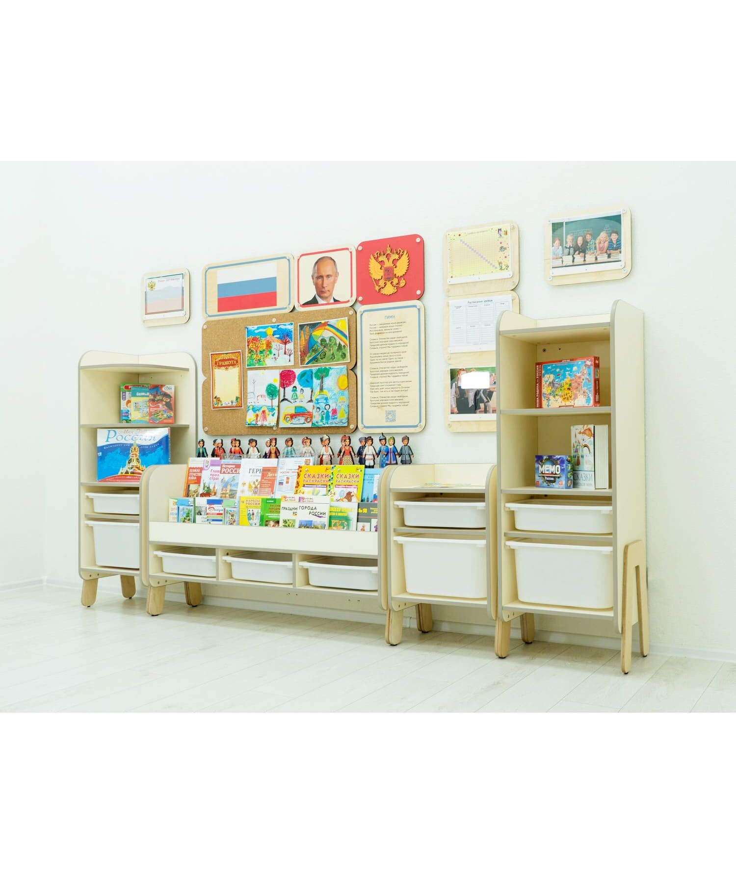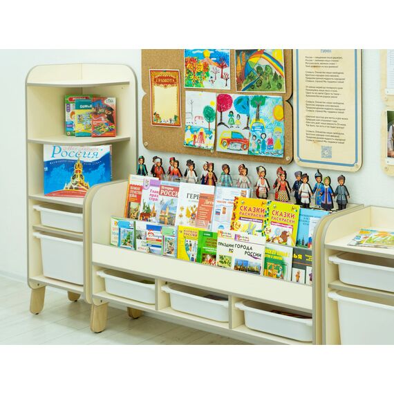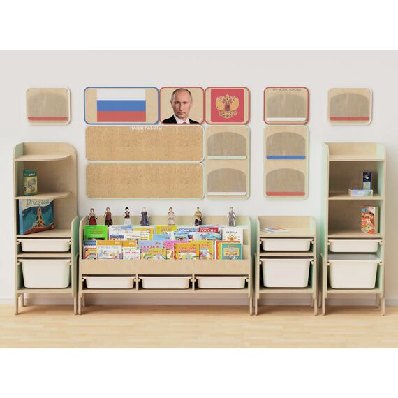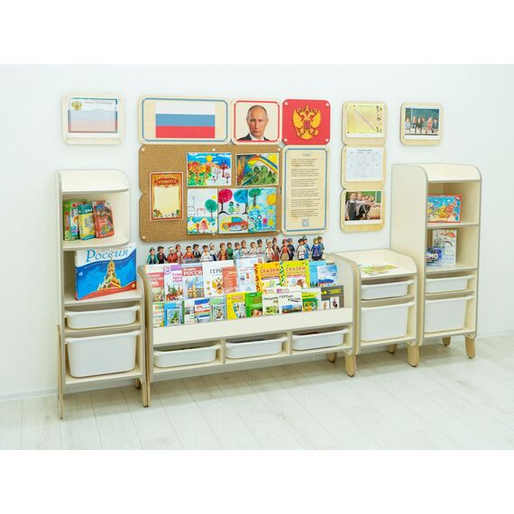 Нашими методистами собраны книги, раскраски и настольные игры для создания полноценного курса по патриотическому воспитанию. Удобные стеллажи с полками и ящиками содержат всё необходимое наполнение, чтобы проводить занятия с дошкольниками 3-6 лет.