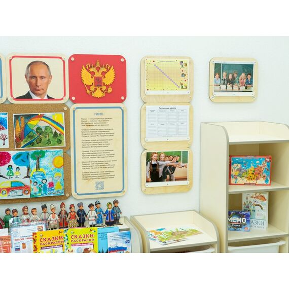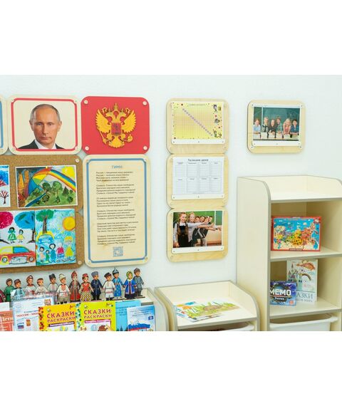 Акриловые рамки служат для размещения полезной информации: портрет губернатора, герб и флаг региона, национальный праздник или историческая личность, которую изучают юные воспитанники. На пустой пробковой панели можно легко размещать работы детей или распечатанный наглядный материал к уроку.