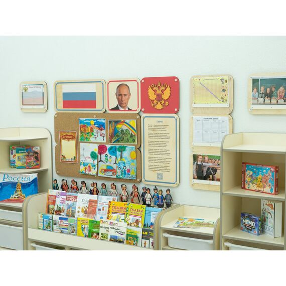 Уголок по патриотическому воспитанию для группы детского сада. Содержит основную символику РФ, панели для размещения работ воспитанников, книги по истории России, ВОВ, русские народные сказки и песни, книги на тему семьи и семейных ценностей, раскраски с тематическими иллюстрациями, настольные игры на тему патриотического воспитания. Соответствует требованиям ФГОС 3.