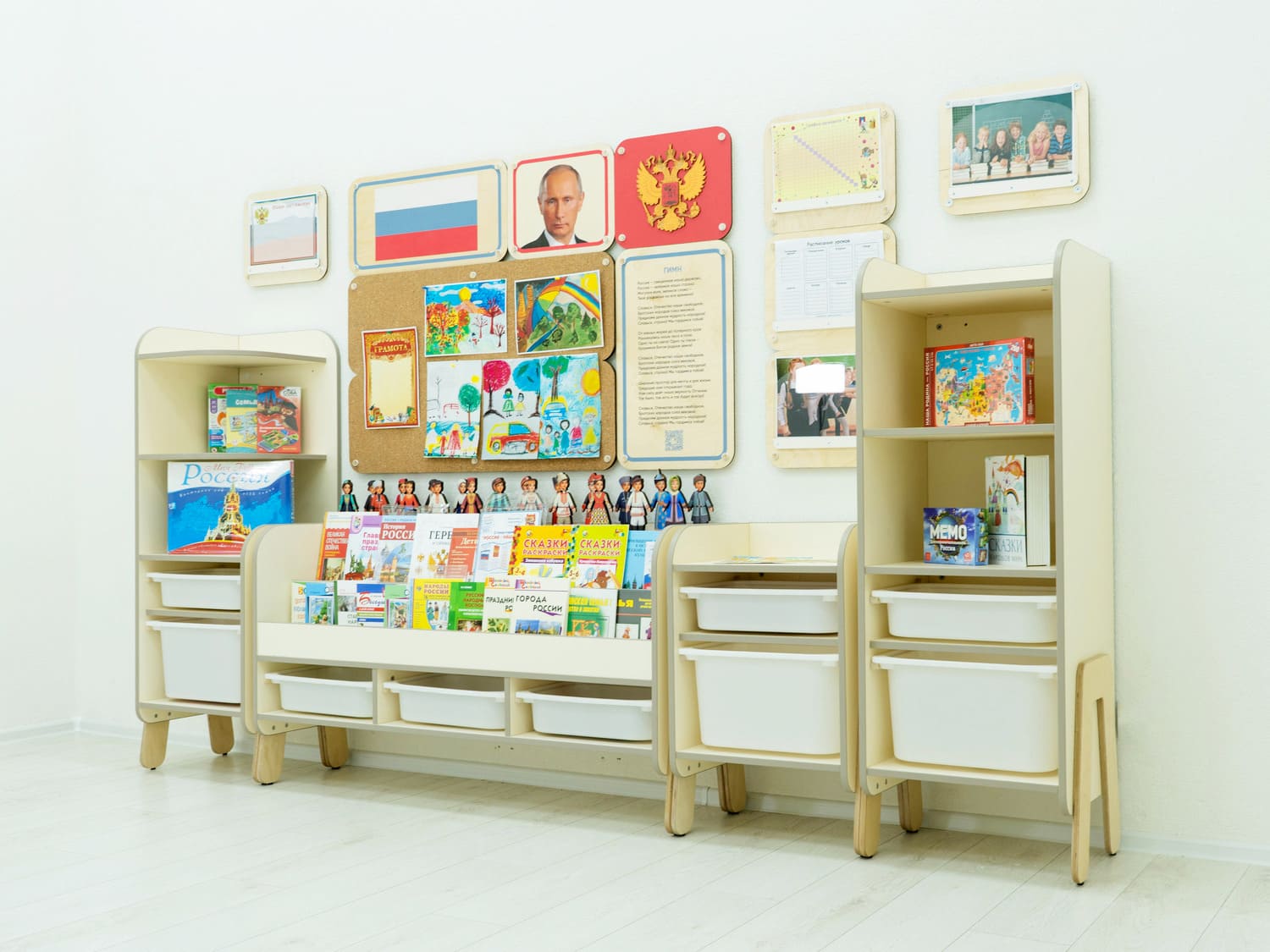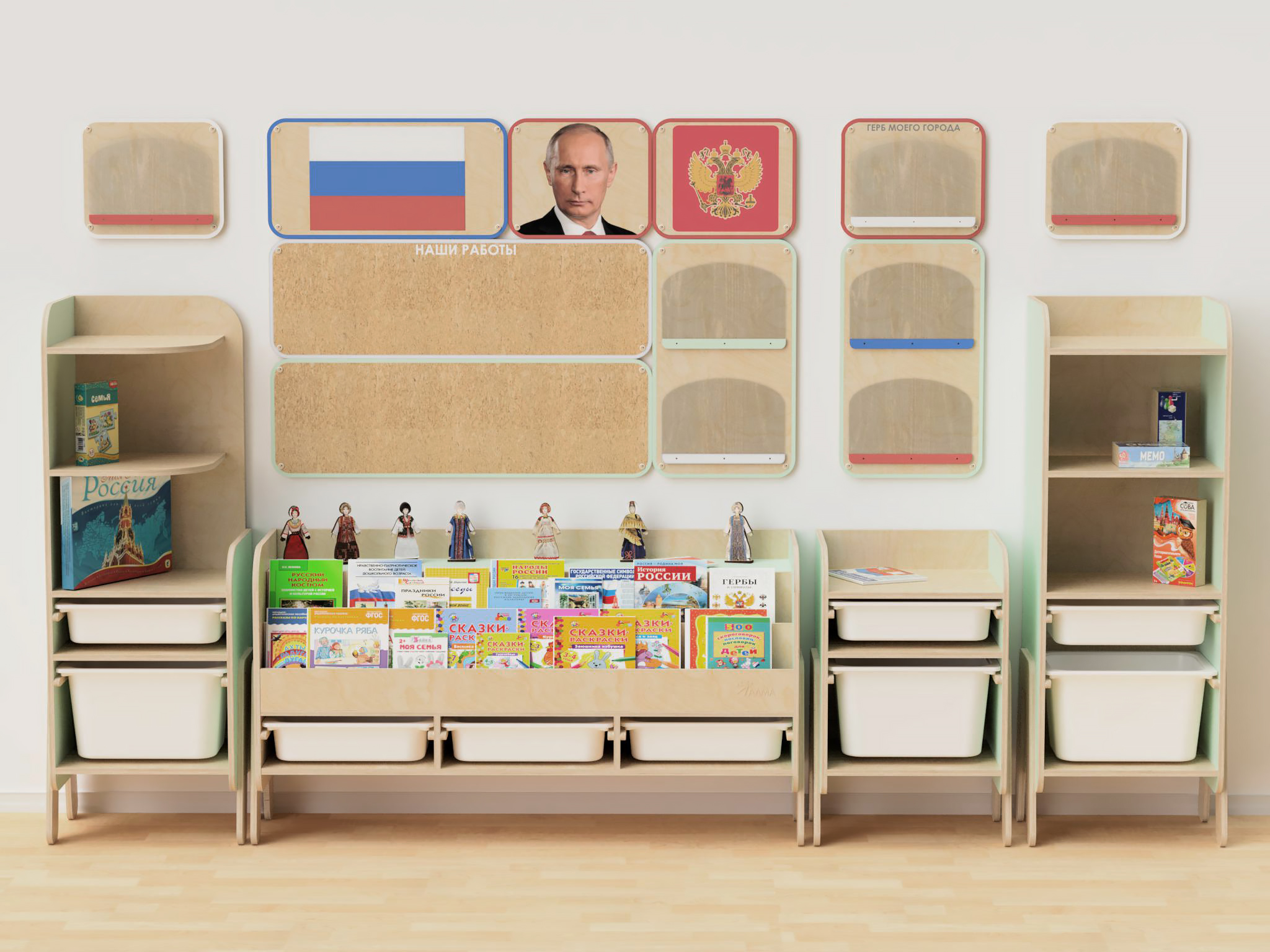 Нашими методистами собраны книги, раскраски и настольные игры для создания полноценного курса по патриотическому воспитанию. Удобные стеллажи с полками и ящиками содержат всё необходимое наполнение, чтобы проводить занятия с дошкольниками 3-6 лет.