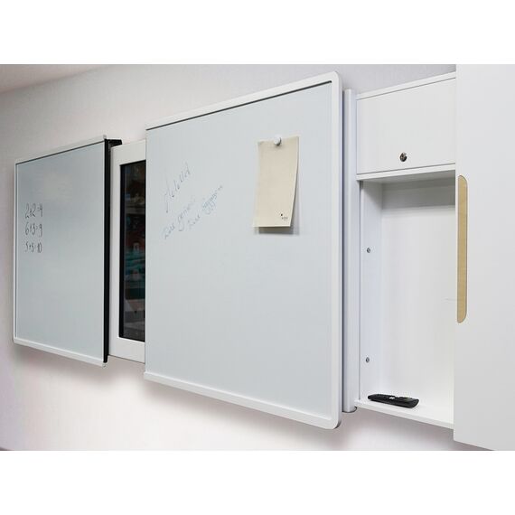 6. Удобство и эргономичность конструкции. Раздвижная система створок имеет прочную конструкцию и плавный ход благодаря доводчикам. По бокам интерактивной раздвижной доски находятся закрытые секции с полочками, где удобно хранить обучающий материал, маркеры, губки, пульты управления и прочий инвентарь, нужный для преподавательской работы. Запирающаяся на ключ секция, куда можно убрать ноутбук преподавателя, становится доступна при максимальном сдвигании двух магнитно-маркерных поверхностей в противоположную от секции сторону.