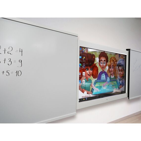 Современная школьная доска, сочетающая пишущую магнитно-маркерную поверхность и интерактивный экран со встроенным компьютером. Раздвижная конструкция доски «Фибоначчи» позволяет трансформировать рабочую зону по желанию преподавателя, и совмещать традиционные занятия от руки с инновационными инструментами в образовании. Подходит для оснащения школ, учреждений культуры, детских кружков, развивающих и коррекционных центров для детей.
