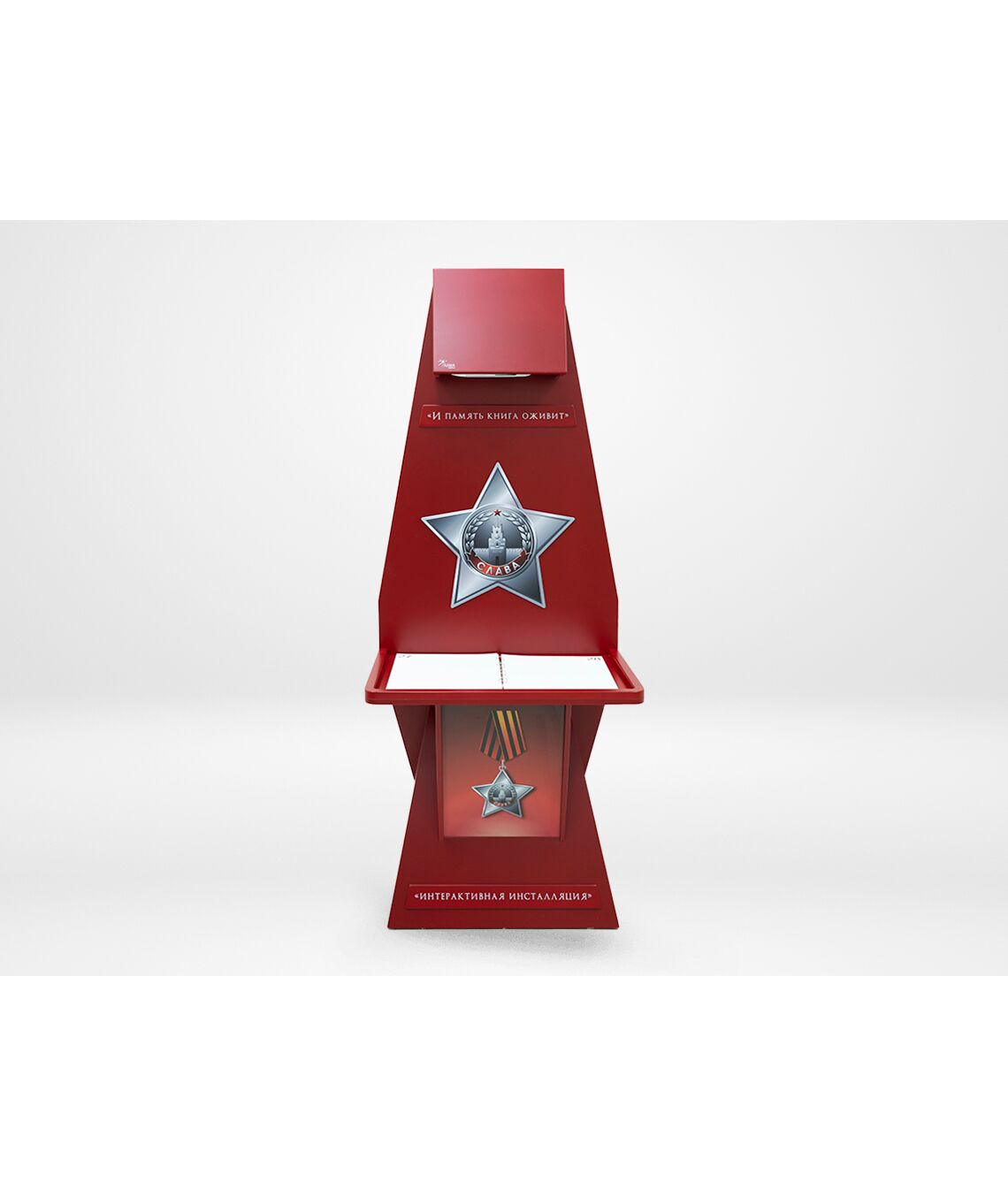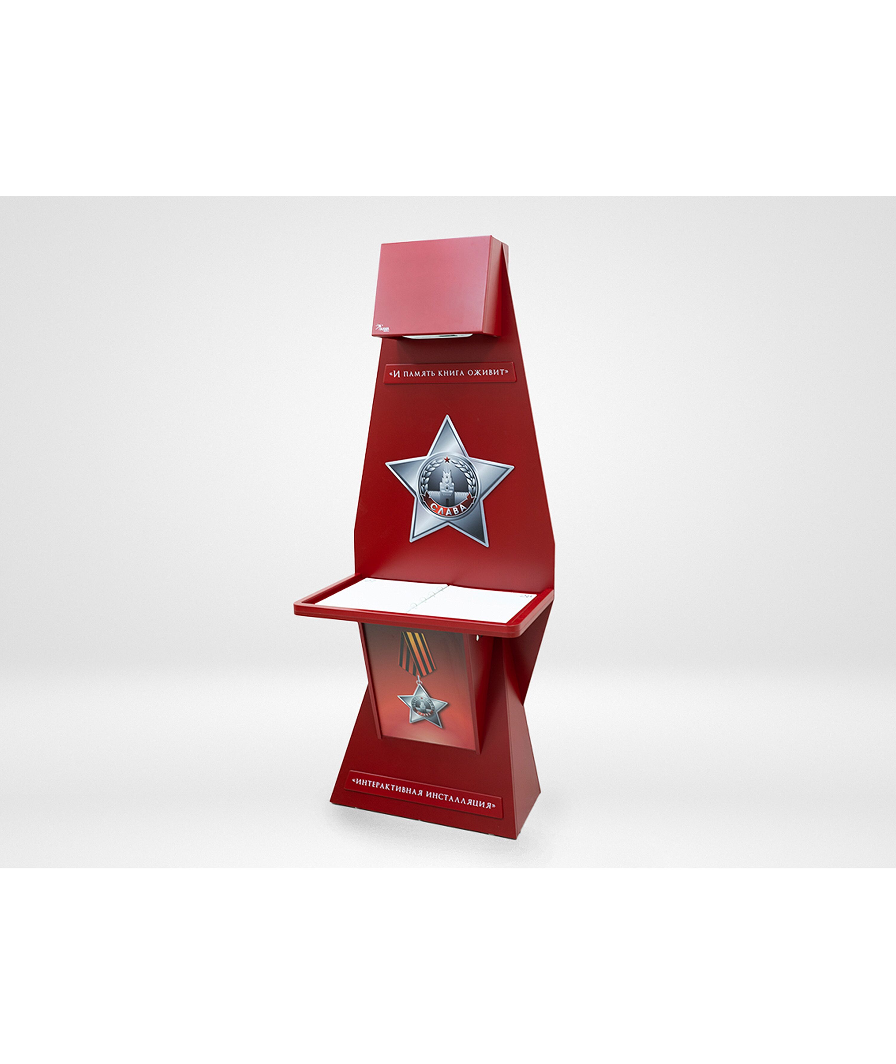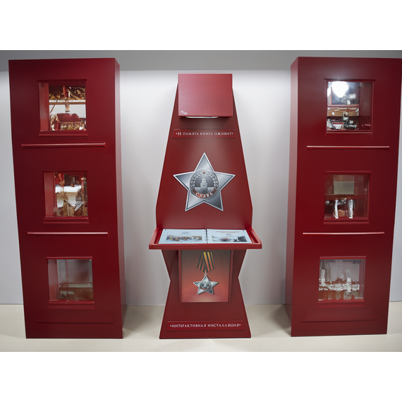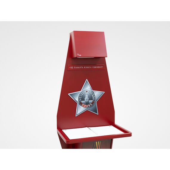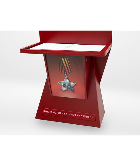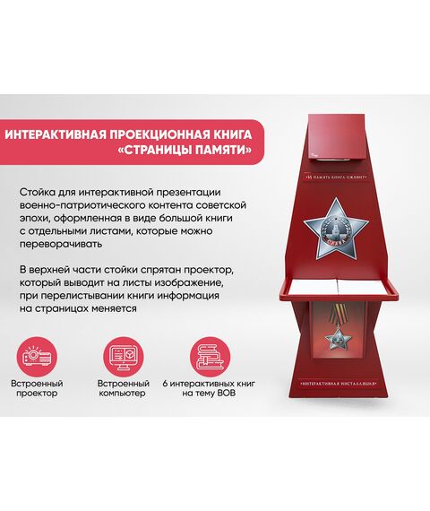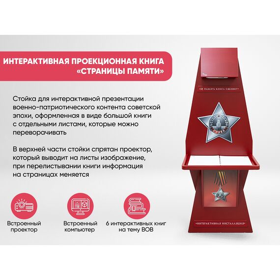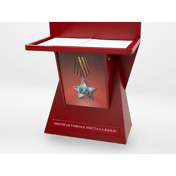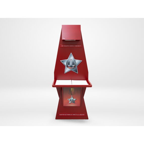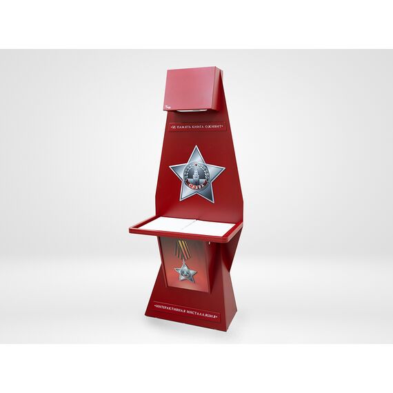Стойка для интерактивной презентации военно-патриотического контента советской эпохи, оформленная в виде большой книги с отдельными листами, которые можно переворачивать. В верхней части стойки спрятан проектор, который выводит на листы изображение, при перелистывании книги информация на страницах меняется. Стойка идеально впишется в интерьер музея, библиотеки, школьного уголка патриотического воспитания.
