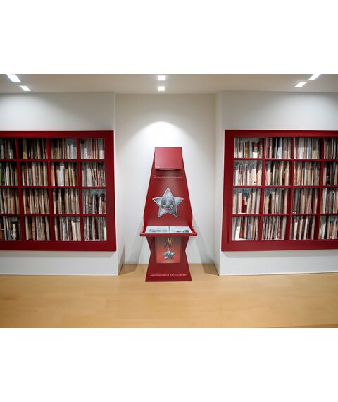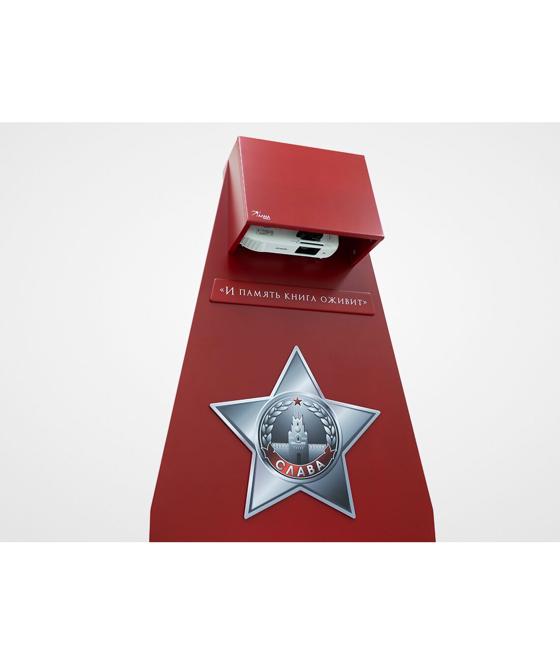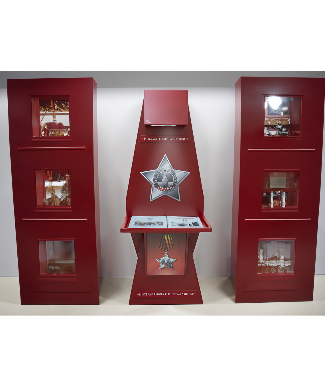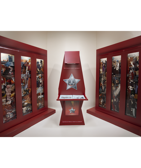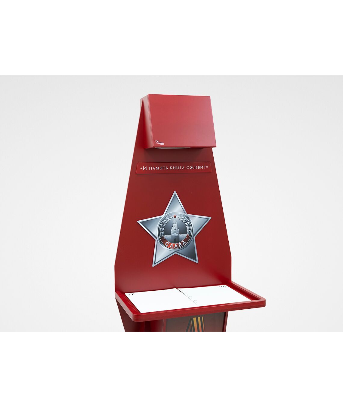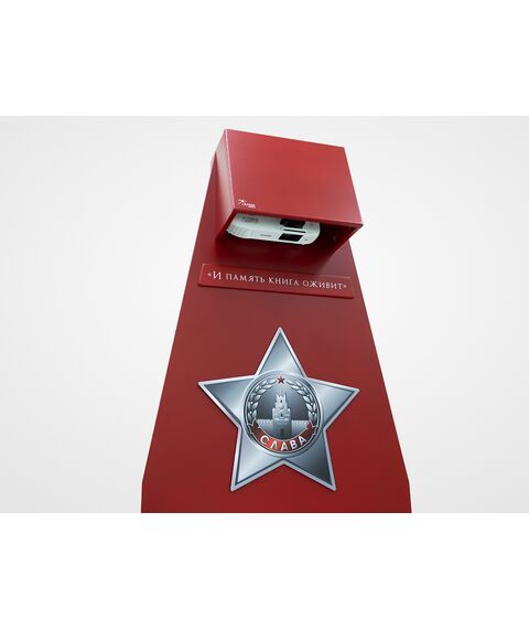 Стойка для интерактивной презентации военно-патриотического контента советской эпохи, оформленная в виде большой книги с отдельными листами, которые можно переворачивать. В верхней части стойки спрятан проектор, который выводит на листы изображение, при перелистывании книги информация на страницах меняется. Стойка идеально впишется в интерьер музея, библиотеки, школьного уголка патриотического воспитания.
