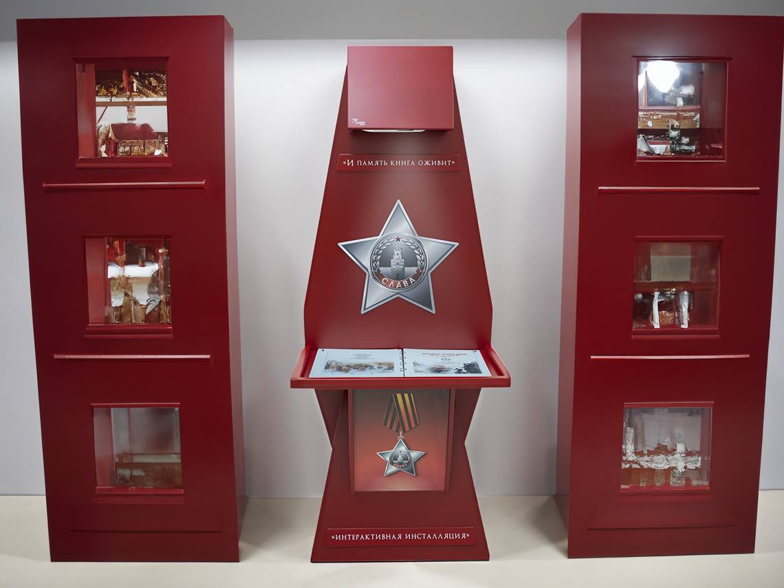 Стойка для интерактивной презентации военно-патриотического контента советской эпохи, оформленная в виде большой книги с отдельными листами, которые можно переворачивать. В верхней части стойки спрятан проектор, который выводит на листы изображение, при перелистывании книги информация на страницах меняется. Стойка идеально впишется в интерьер музея, библиотеки, школьного уголка патриотического воспитания.