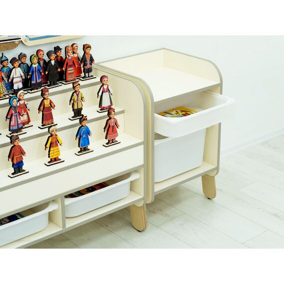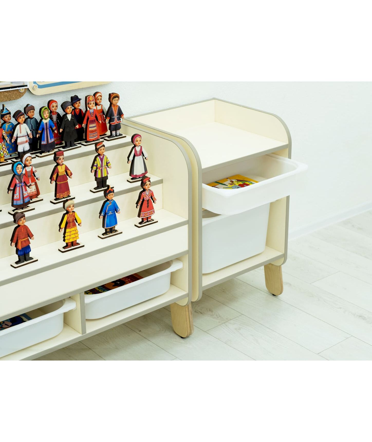Для изучения национального разнообразия России в комплектации есть куклы в народных костюмах (24 национальности, 48 кукол). Они выполнены из берёзовой фанеры и ДВП с нанесением принтерной печати. Куклы разборные: голова, верхняя часть туловища и нижняя часть надеваются на основу-подставку. Играя в них, дети могут составлять различные вариации одежды куколок – правильные и неправильные, искать пары, разыгрывать сюжетно-ролевые сценки, параллельно запоминая национальности и их традиционные костюмы.