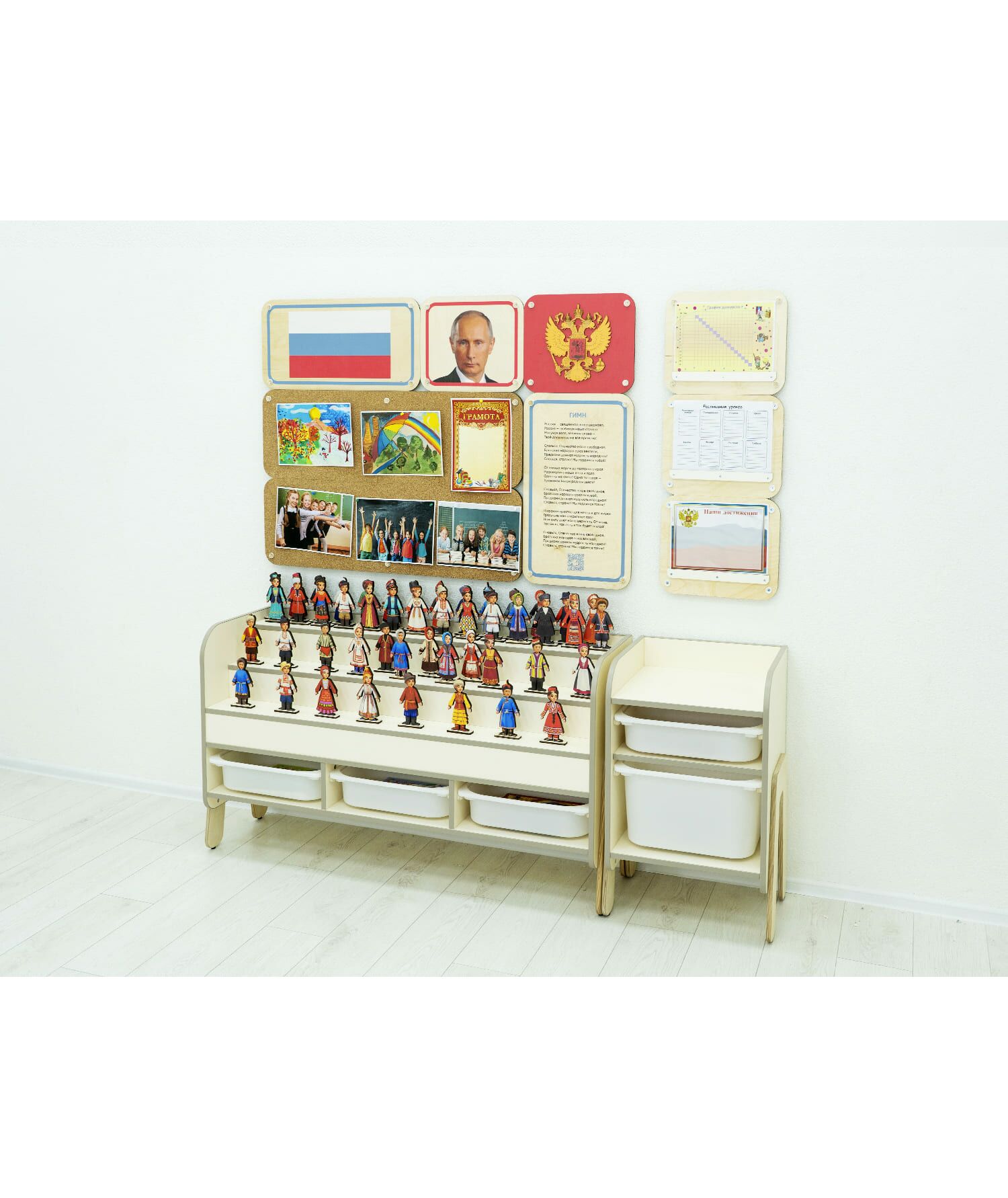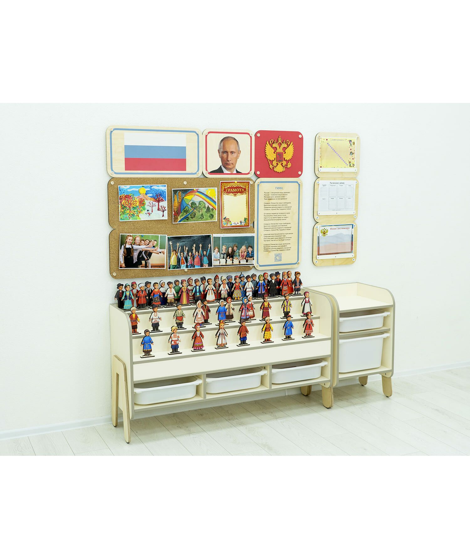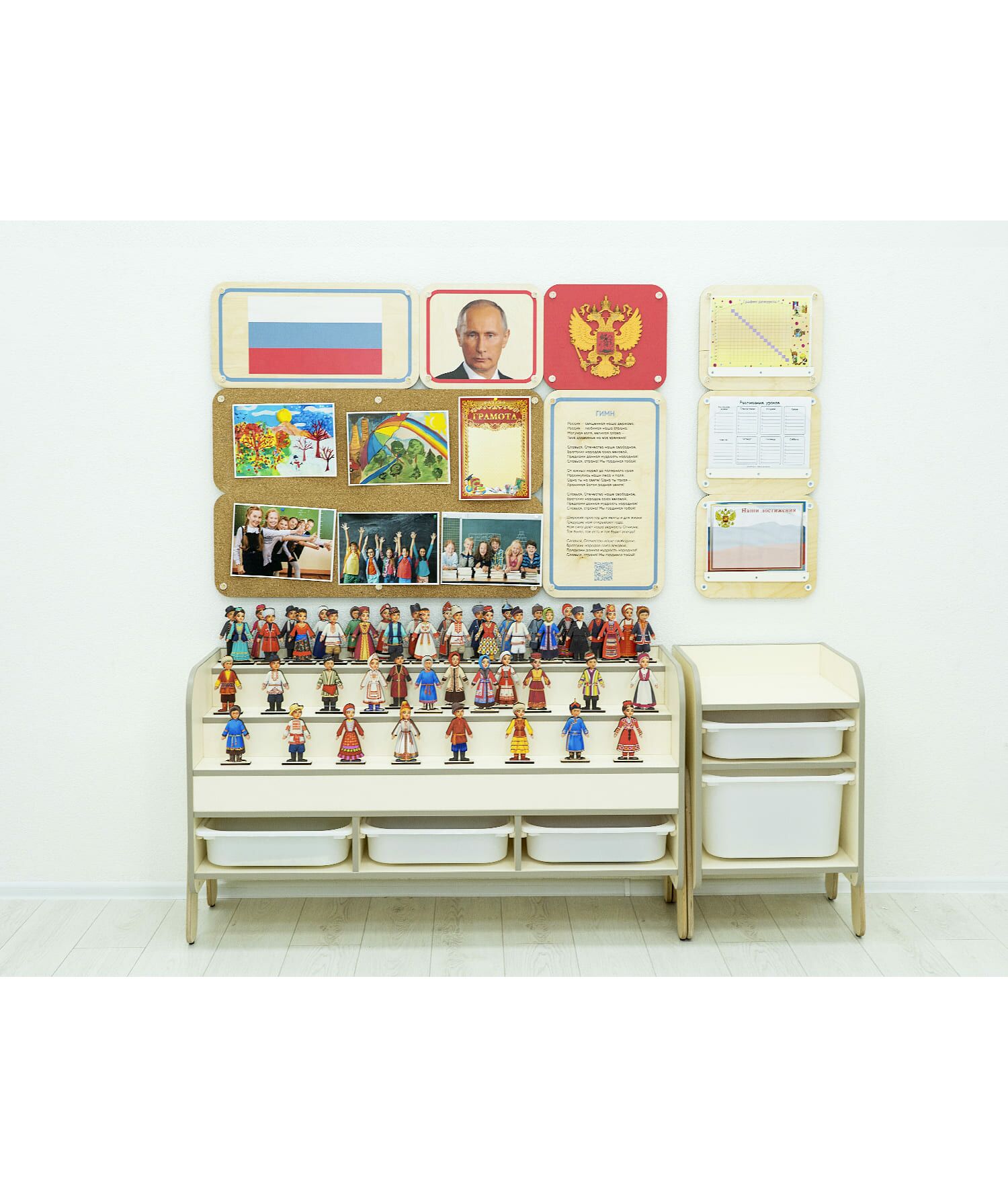 Уголок по патриотическому воспитанию для группы детского сада. Содержит основную символику РФ, панели для размещения работ воспитанников, набор разборных кукол, контейнеры для размещения книг. Соответствует требованиям ФГОС 3.