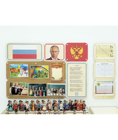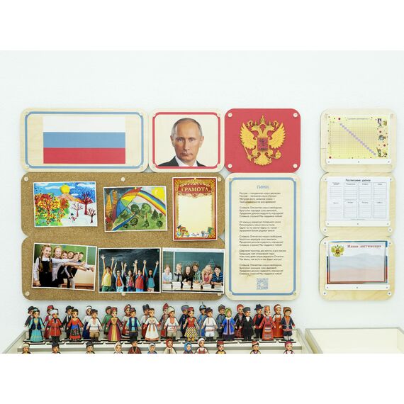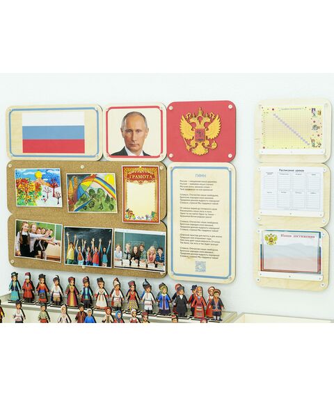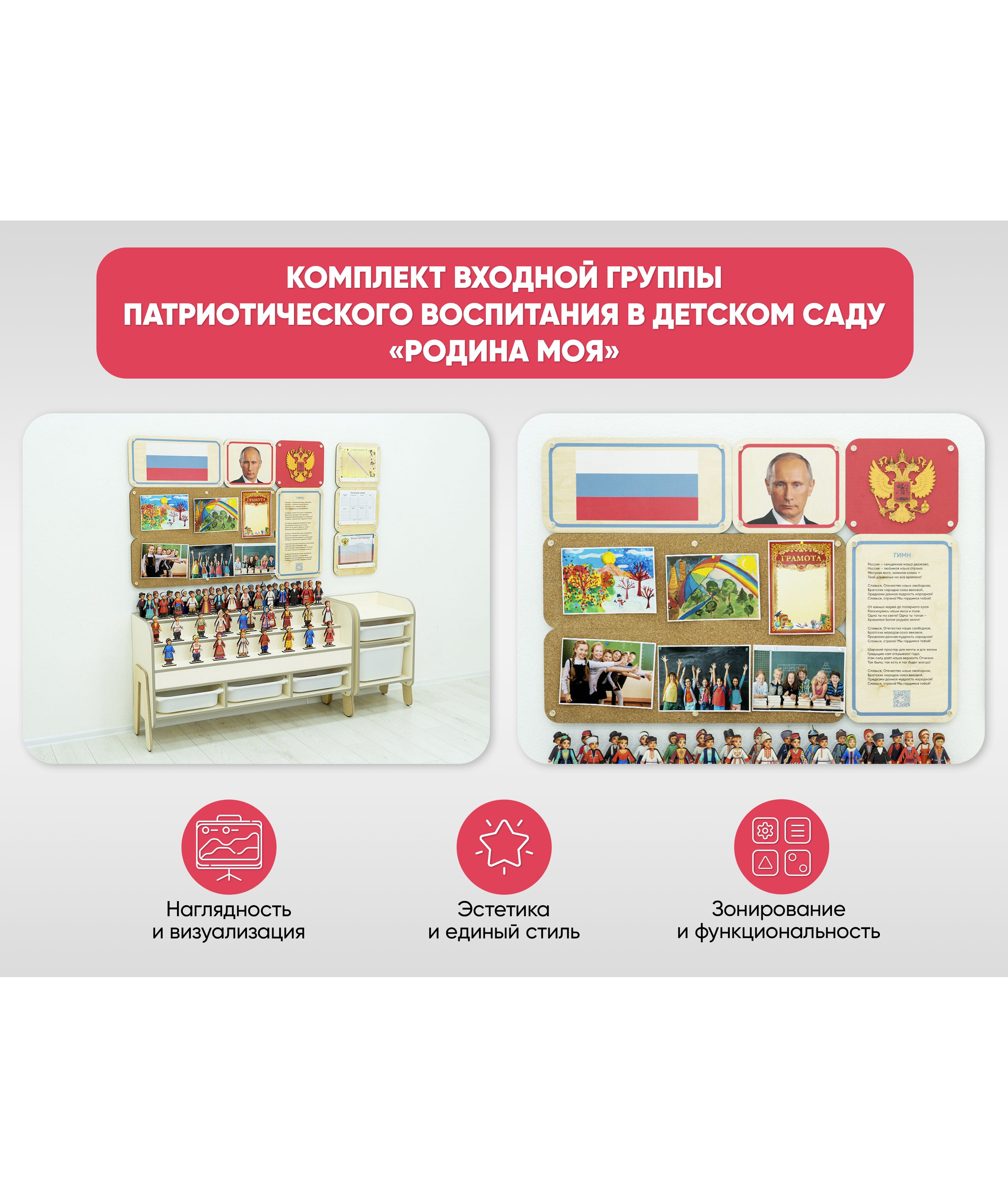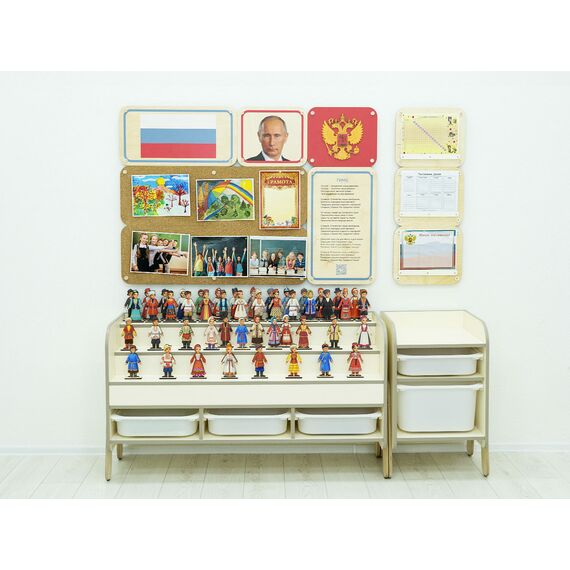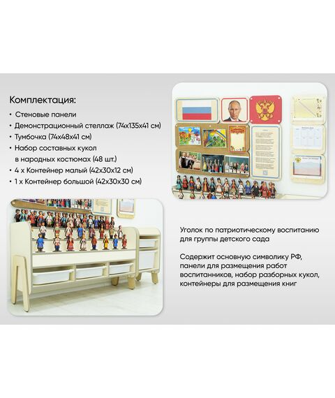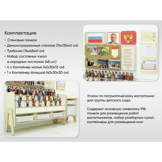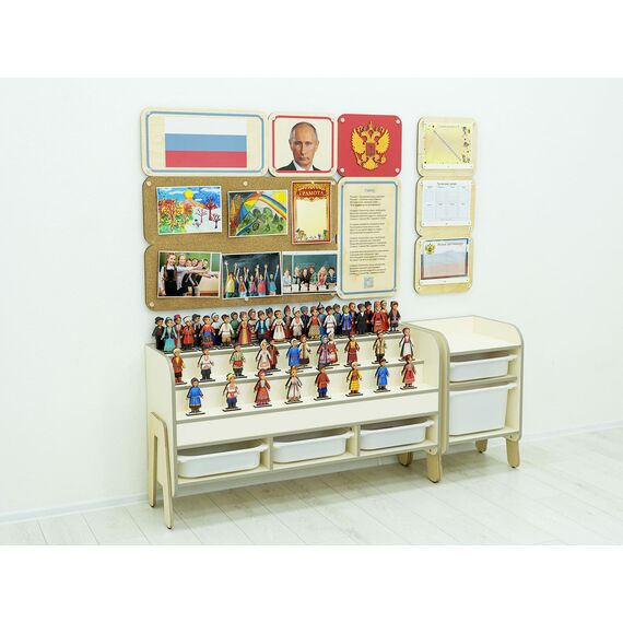 Уголок по патриотическому воспитанию для группы детского сада. Содержит основную символику РФ, панели для размещения работ воспитанников, набор разборных кукол, контейнеры для размещения книг. Соответствует требованиям ФГОС 3.