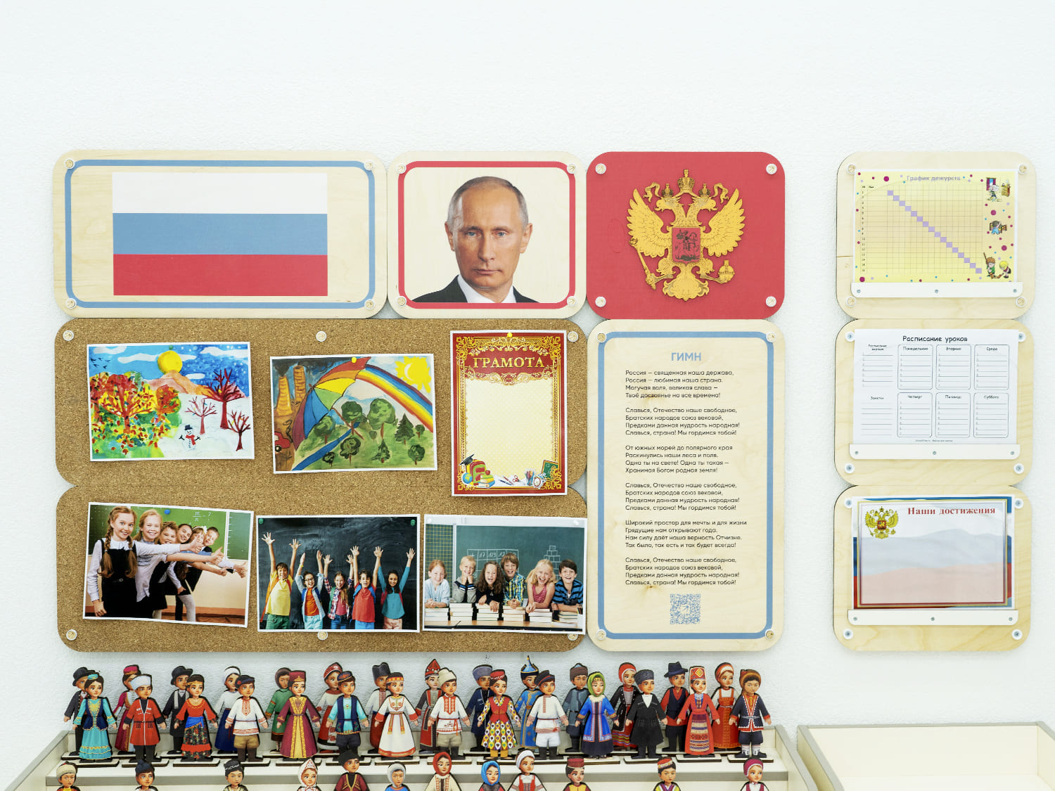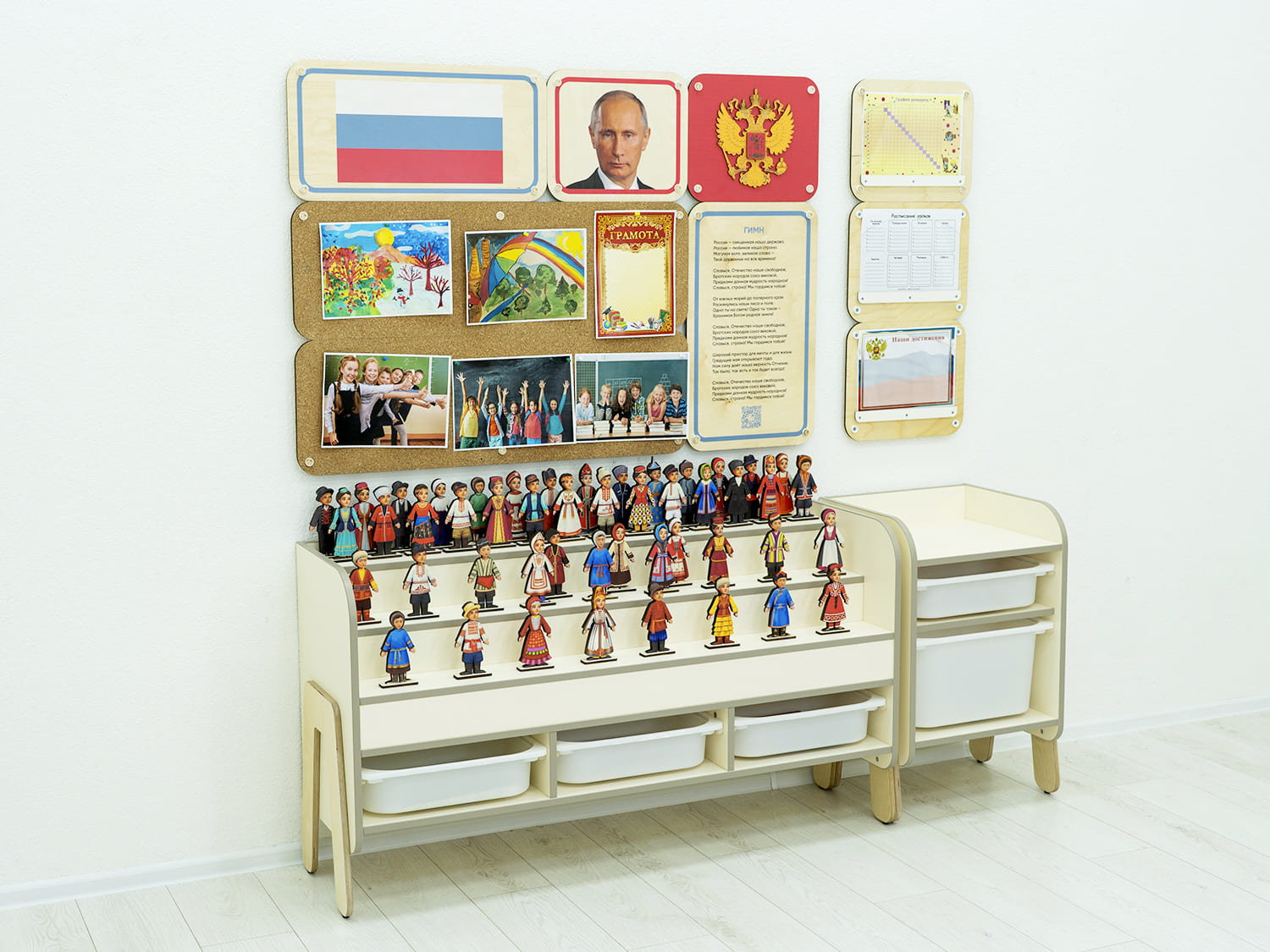 Уголок по патриотическому воспитанию для группы детского сада. Содержит основную символику РФ, панели для размещения работ воспитанников, набор разборных кукол, контейнеры для размещения книг. Соответствует требованиям ФГОС 3.