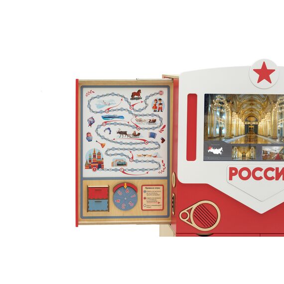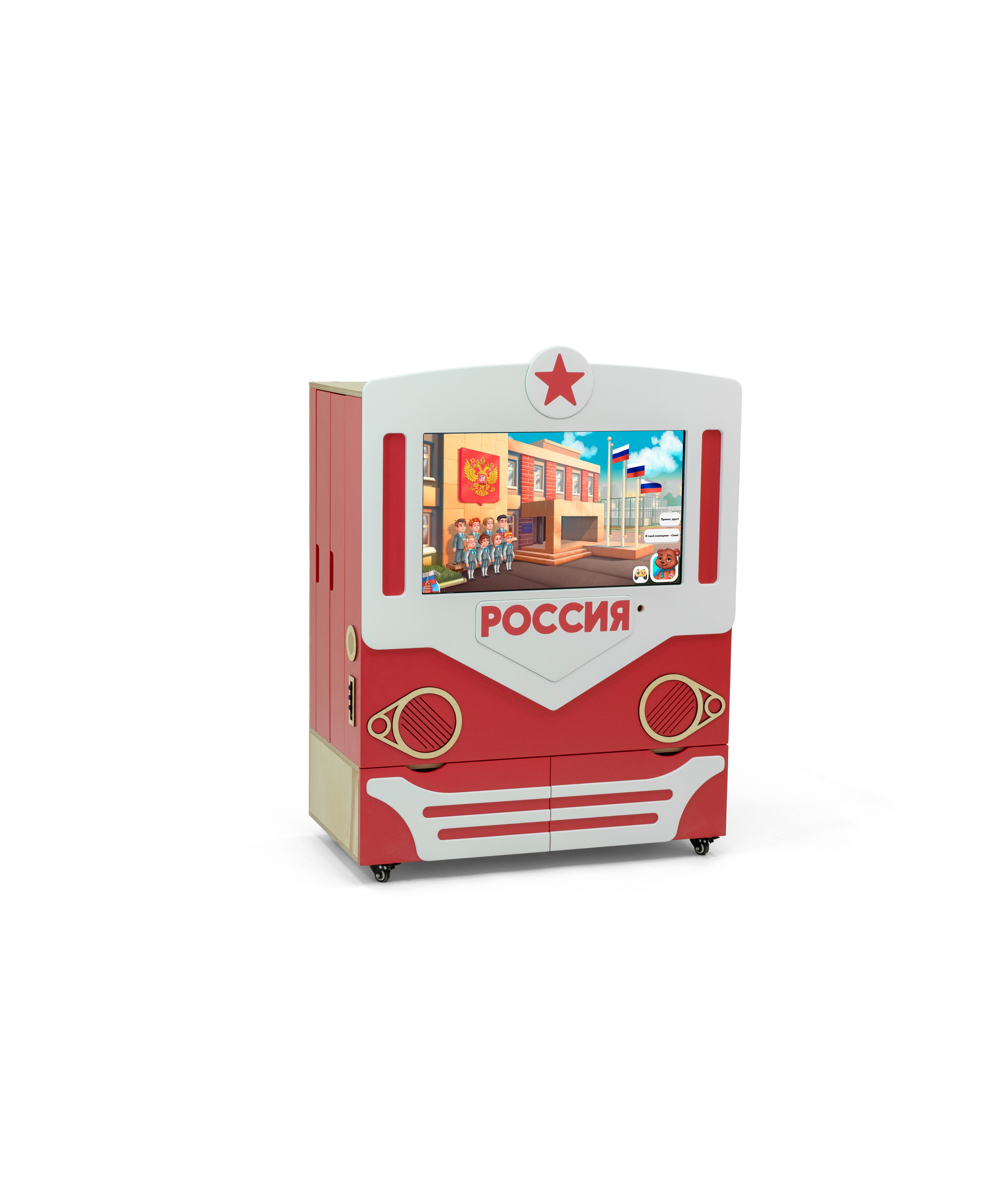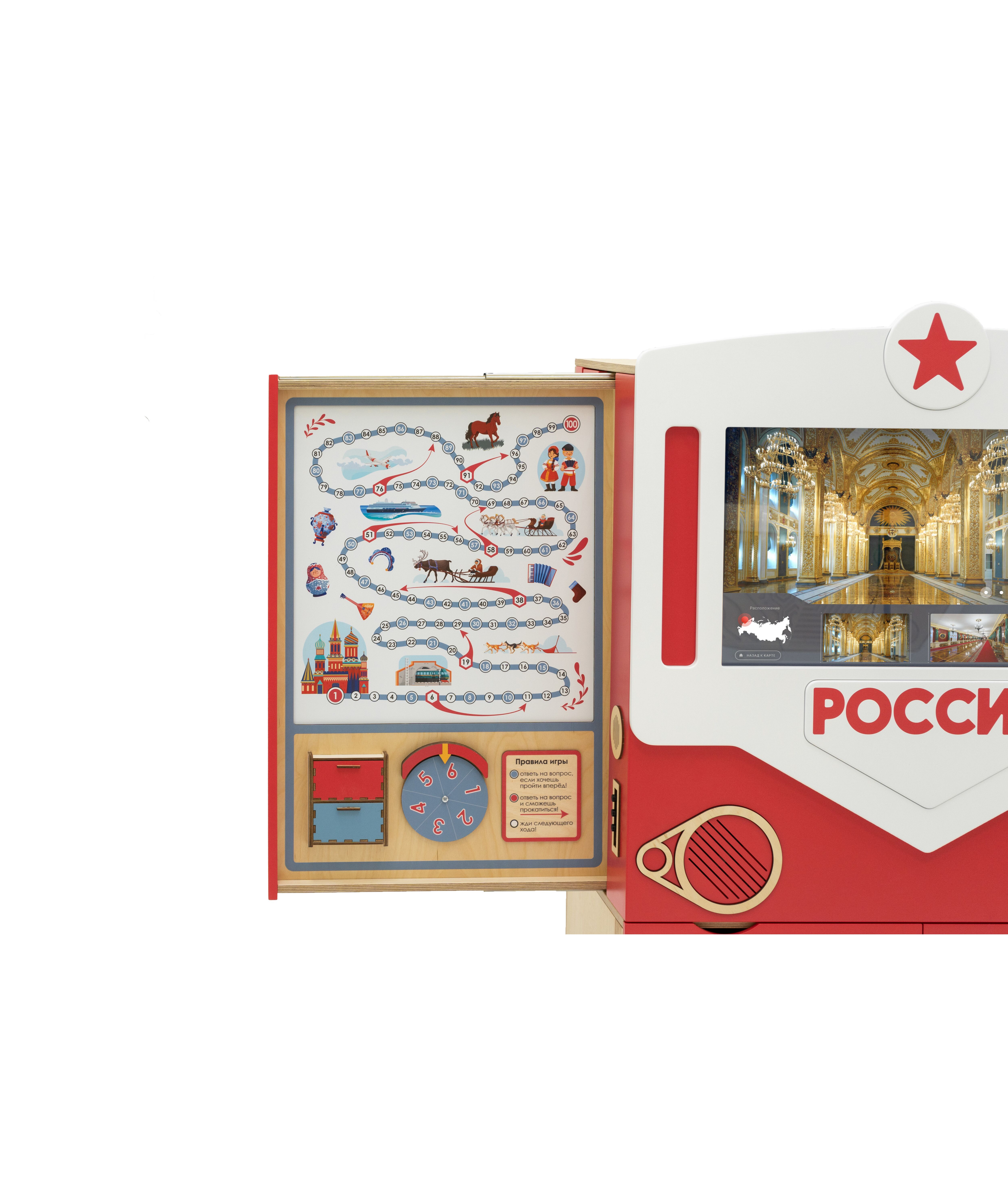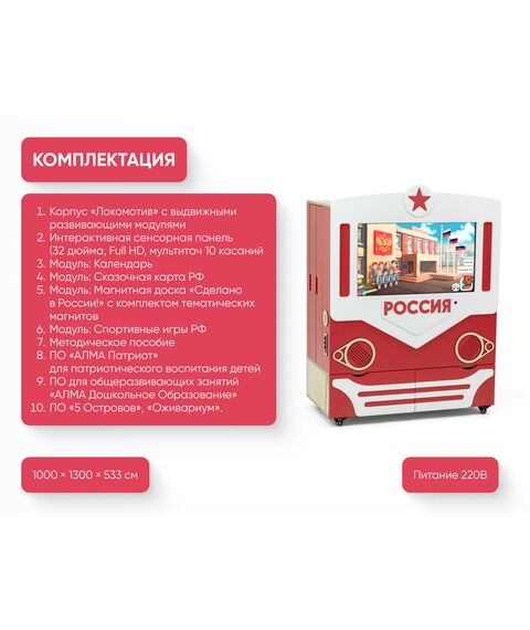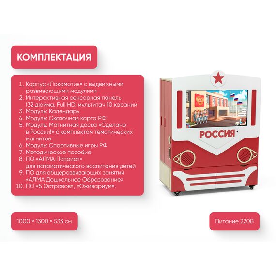 Главным центром притяжения является интерактивная сенсорная панель – на ней установлено фирменное программное обеспечение «АЛМА Патриот», состоящее из 5 тематических блоков: карта России, национальные праздники, государственность, выдающиеся личности, викторина. Также дополнительно идёт пакет общеразвивающих ПО: «АЛМА Дошкольное образование», «5 Островов» и раскраска «Оживариум».