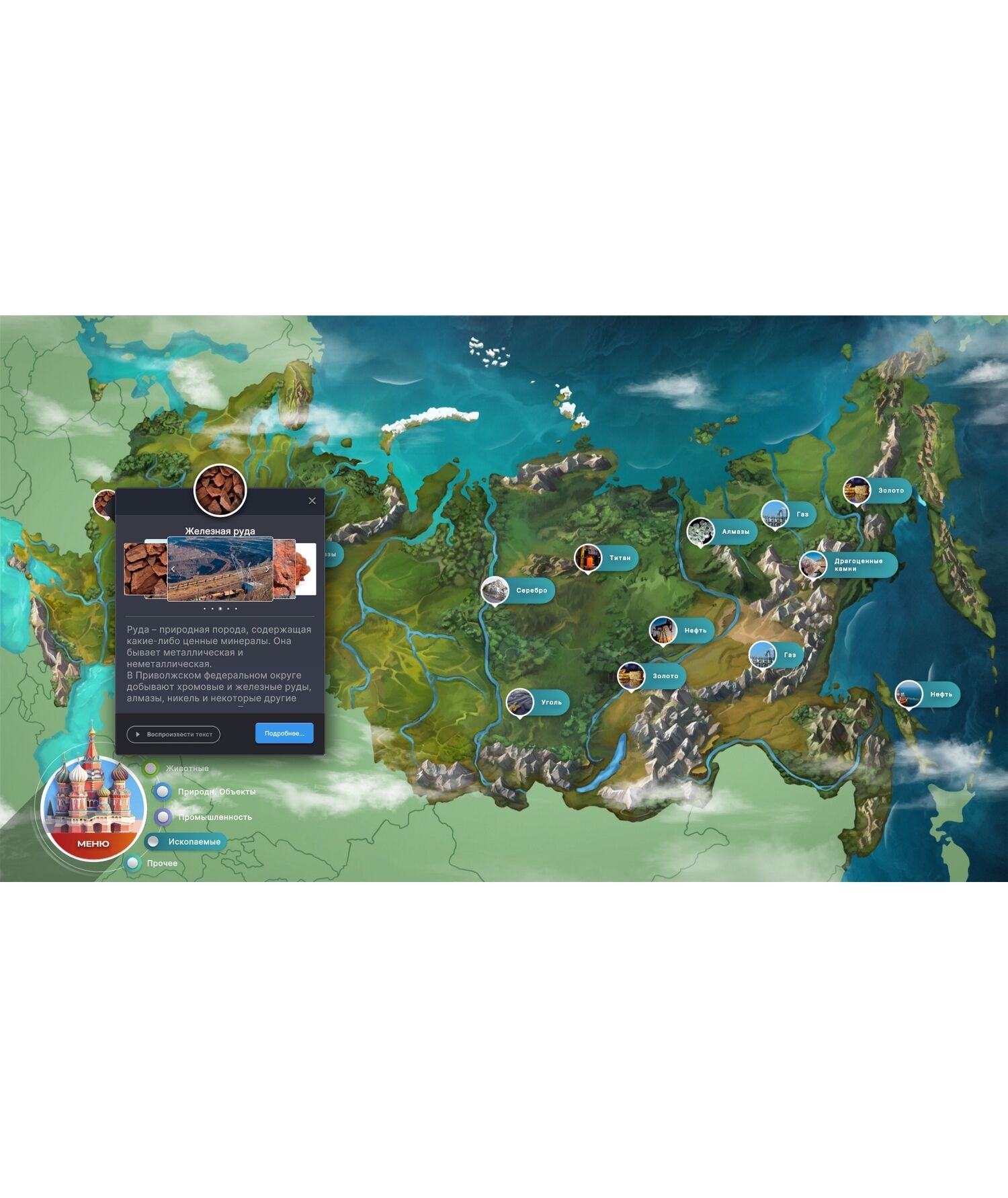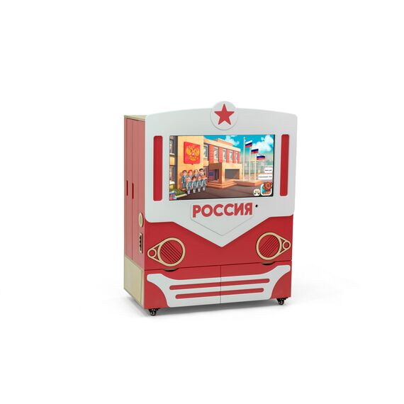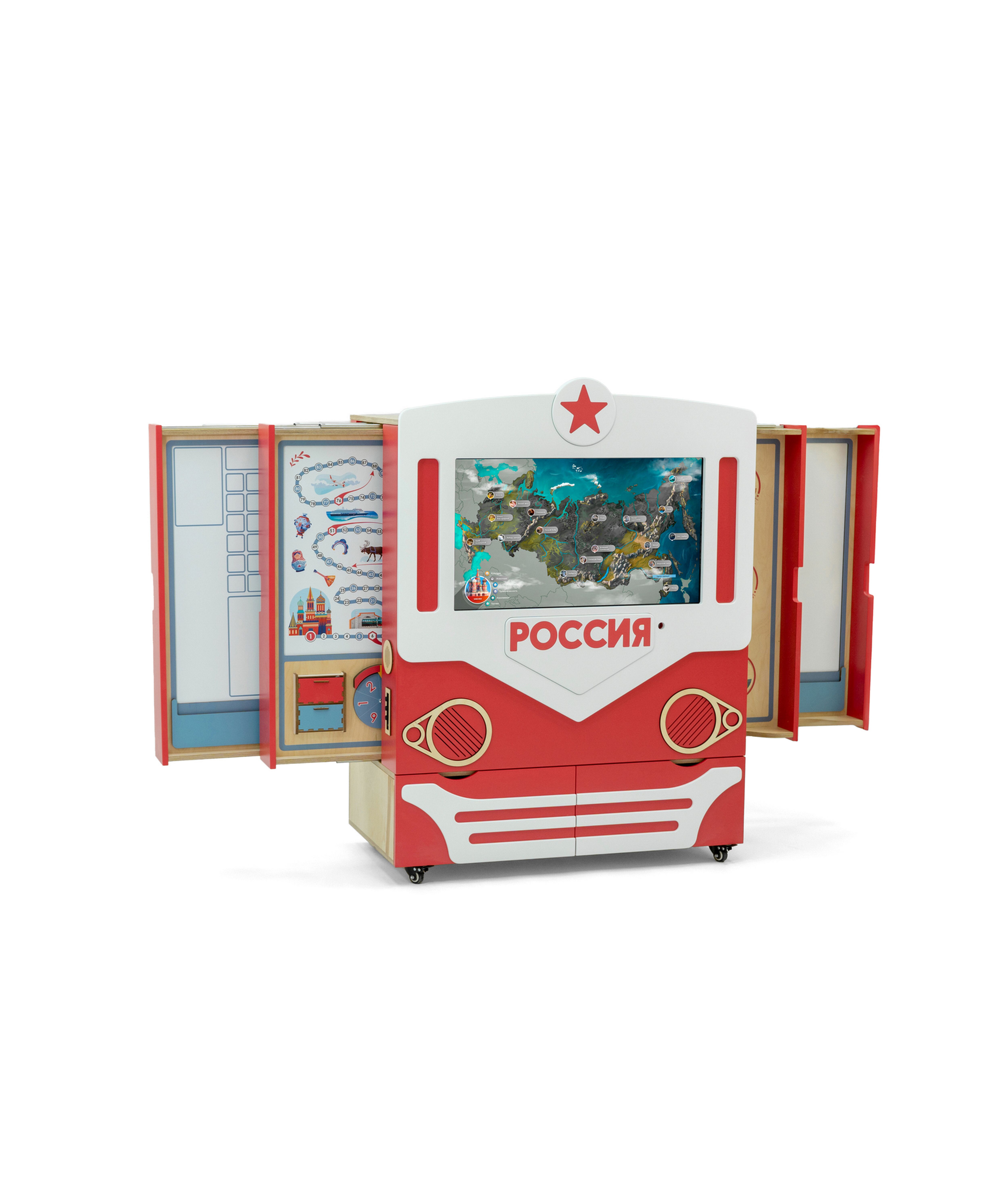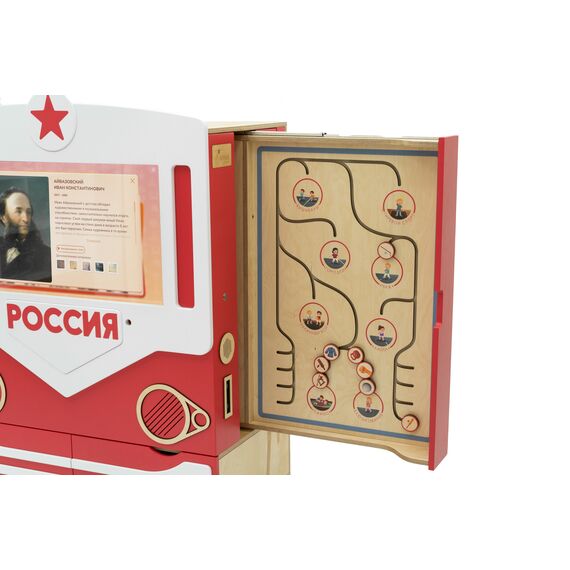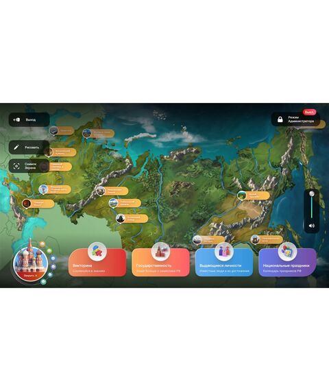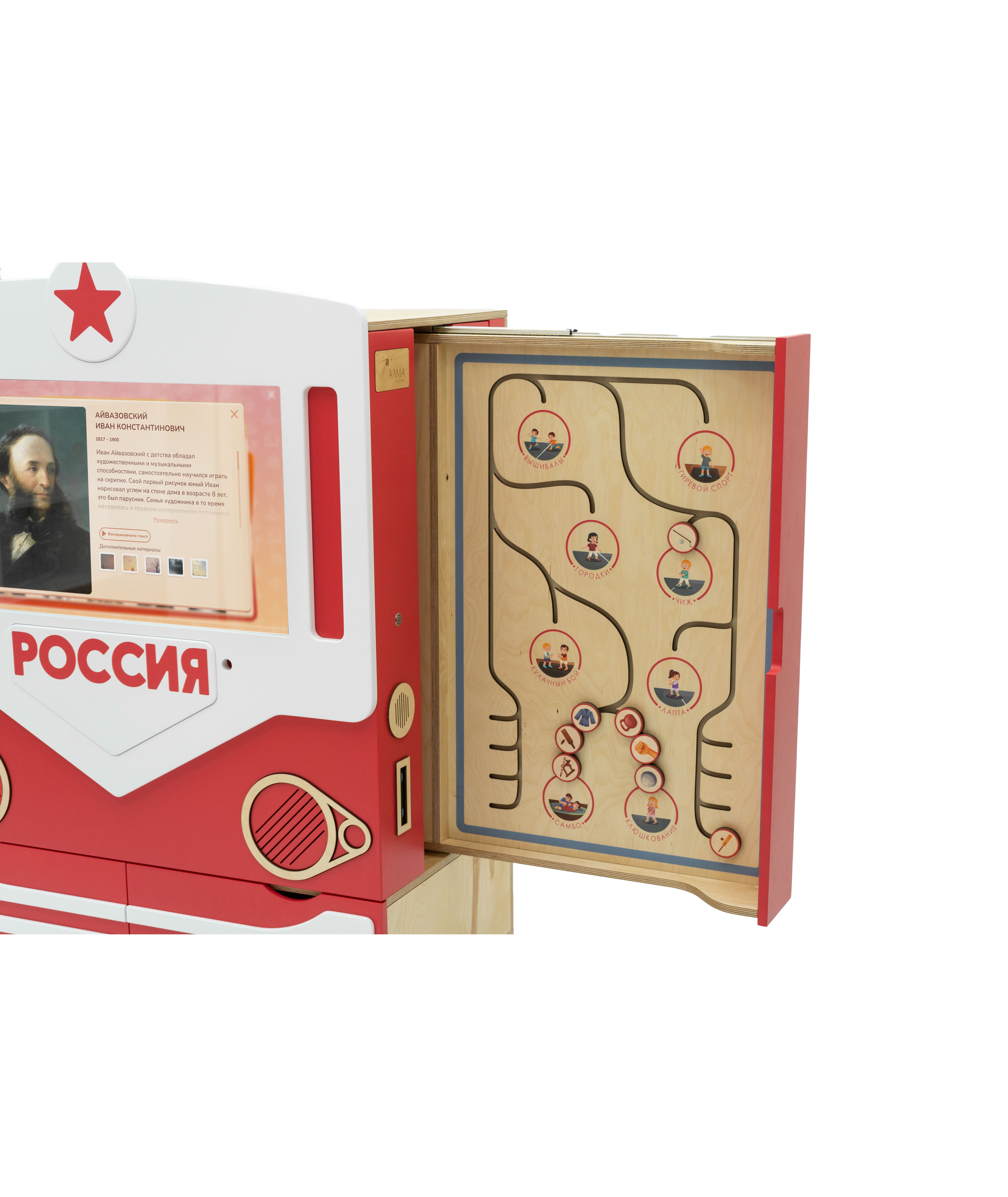 Главным центром притяжения является интерактивная сенсорная панель – на ней установлено фирменное программное обеспечение «АЛМА Патриот», состоящее из 5 тематических блоков: карта России, национальные праздники, государственность, выдающиеся личности, викторина. Также дополнительно идёт пакет общеразвивающих ПО: «АЛМА Дошкольное образование», «5 Островов» и раскраска «Оживариум».