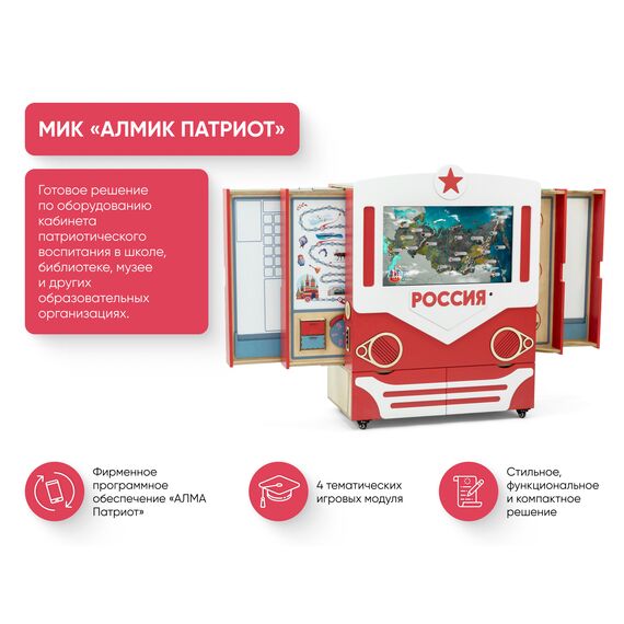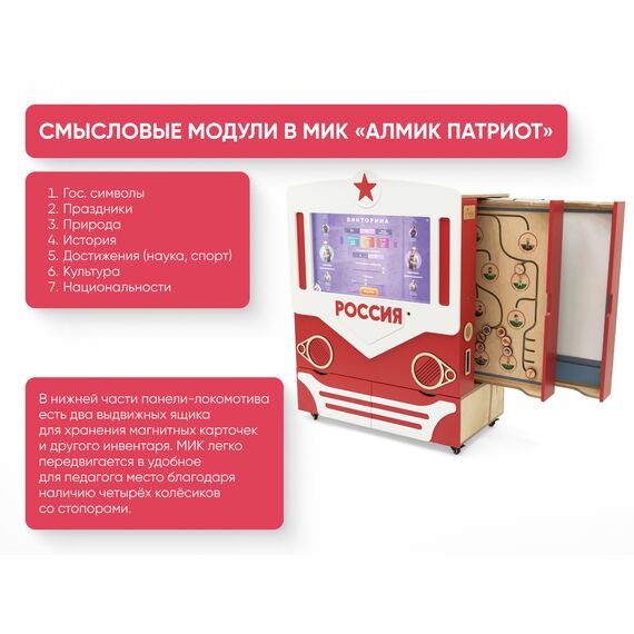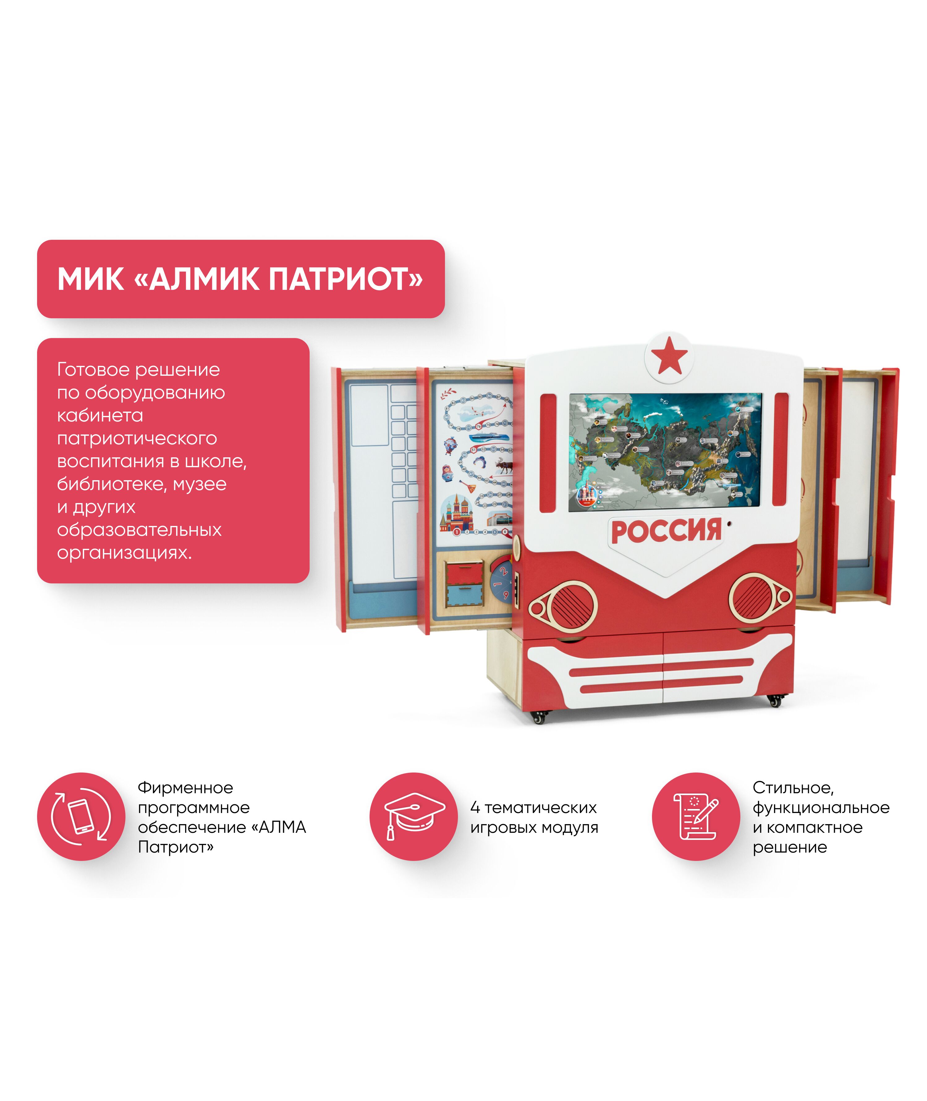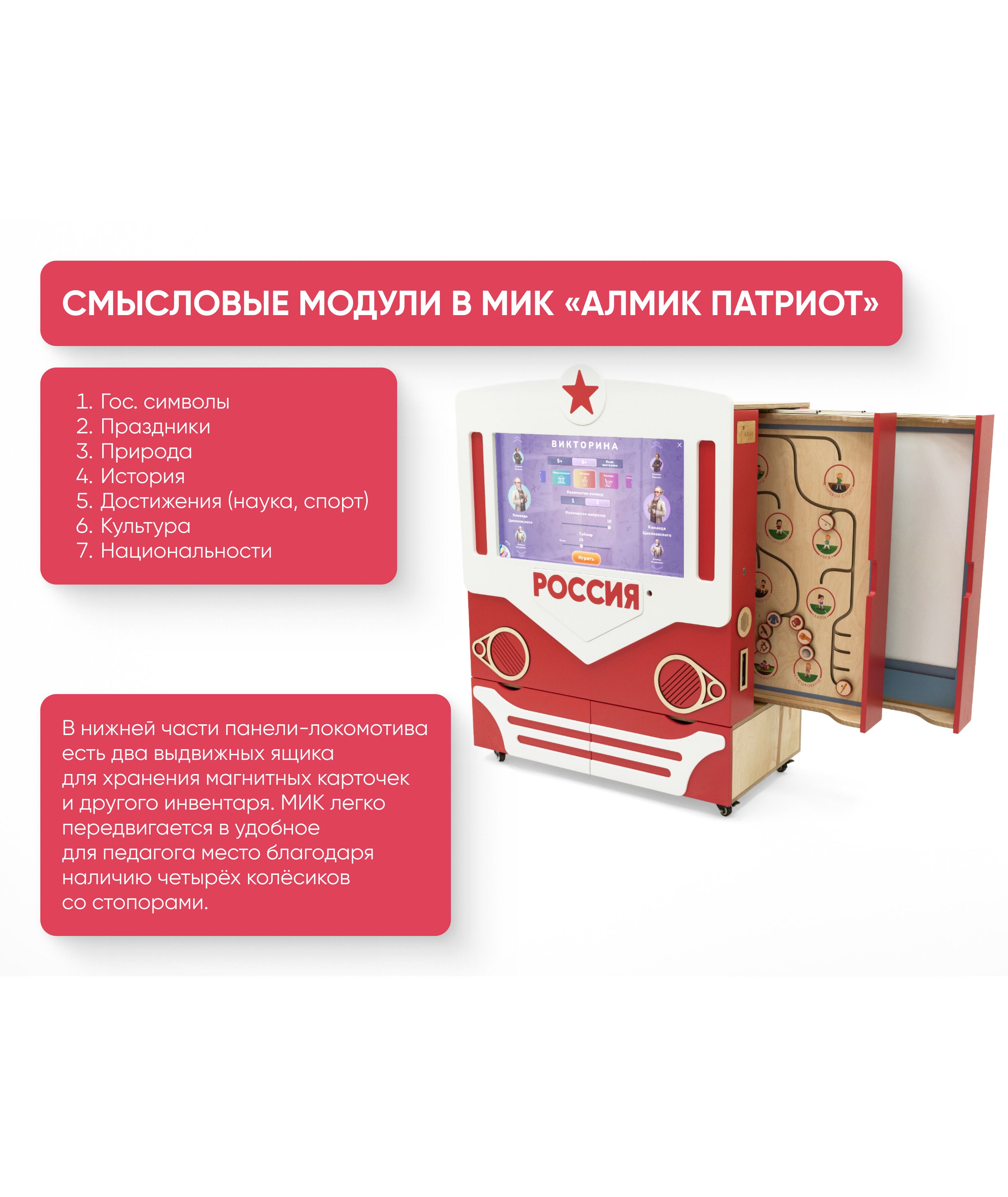 МИК «АЛМИК Патриот» создан для реализации национального проекта «Патриотическое воспитание» в детских садах и дошкольных развивающих центрах. Комплекс оформлен в виде локомотива с интерактивной сенсорной панелью в качестве лобового стекла. По бокам выдвигаются 4 тематических игровых модуля.