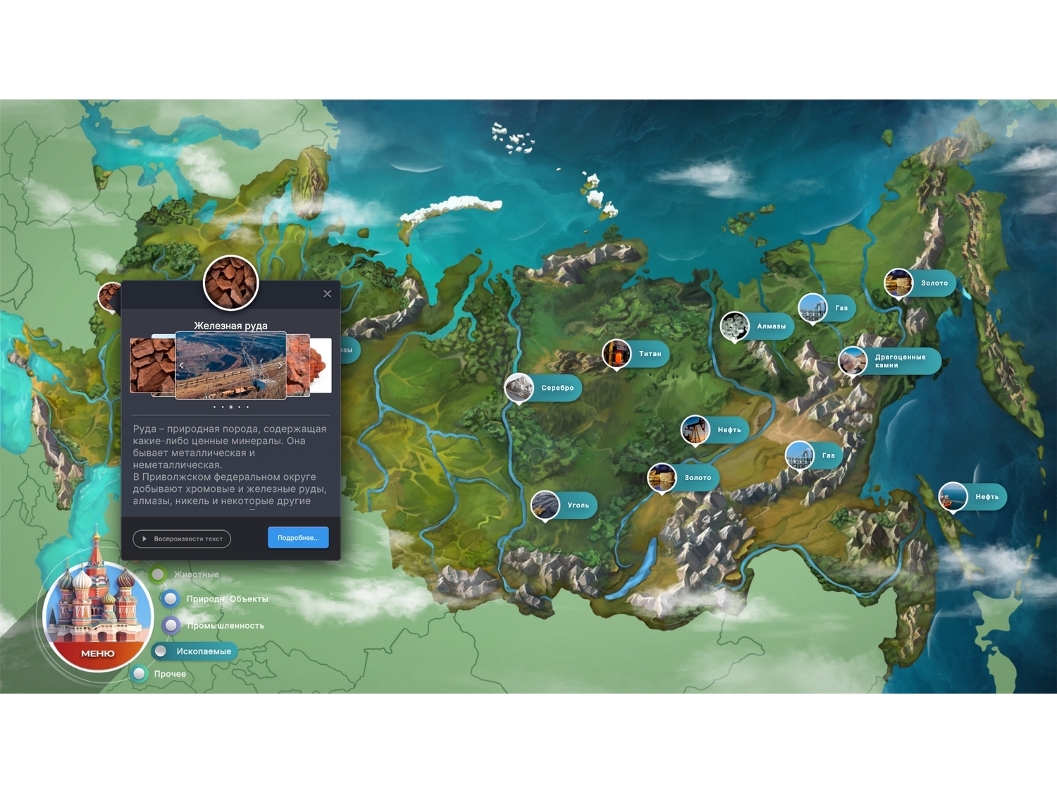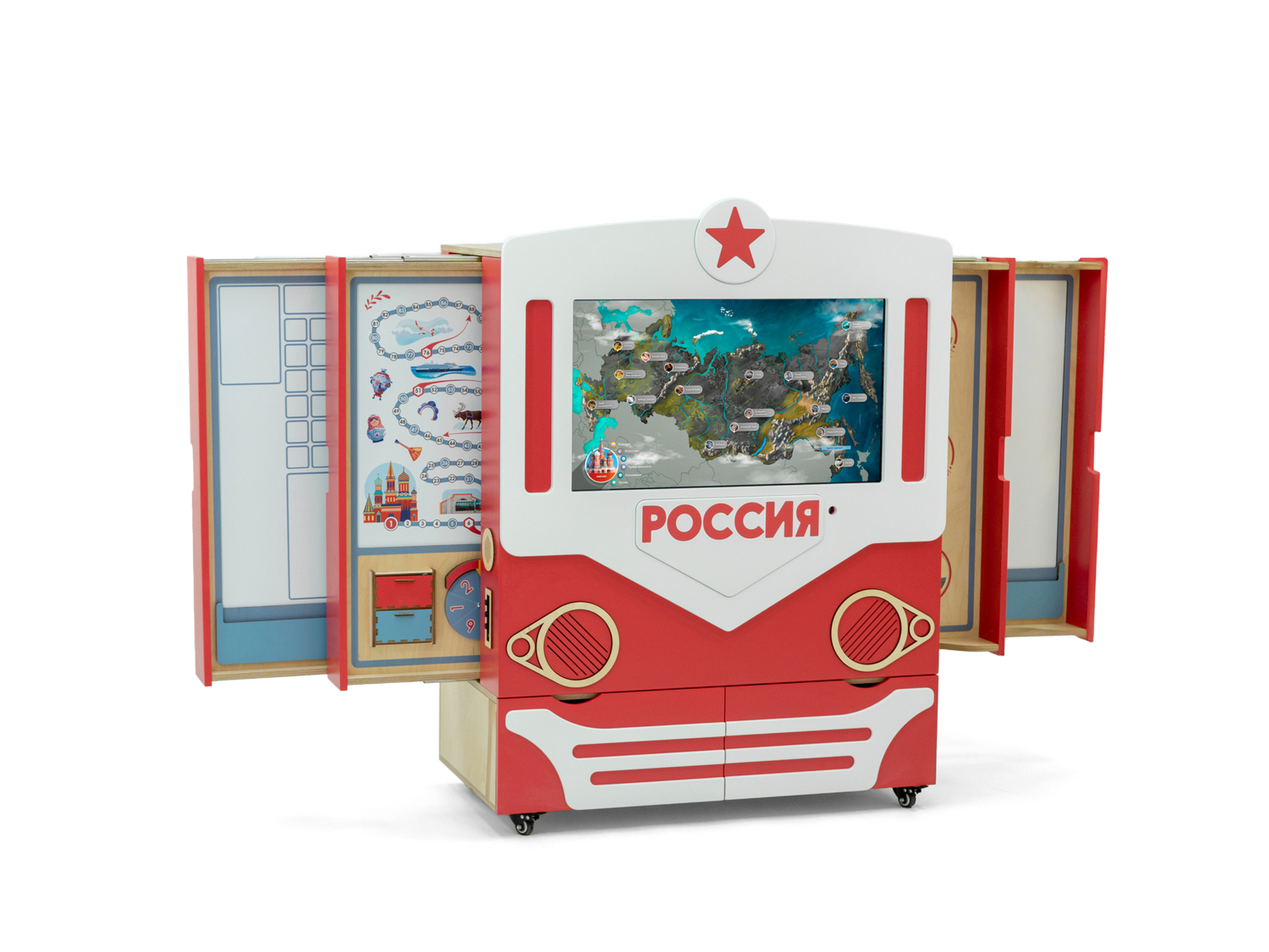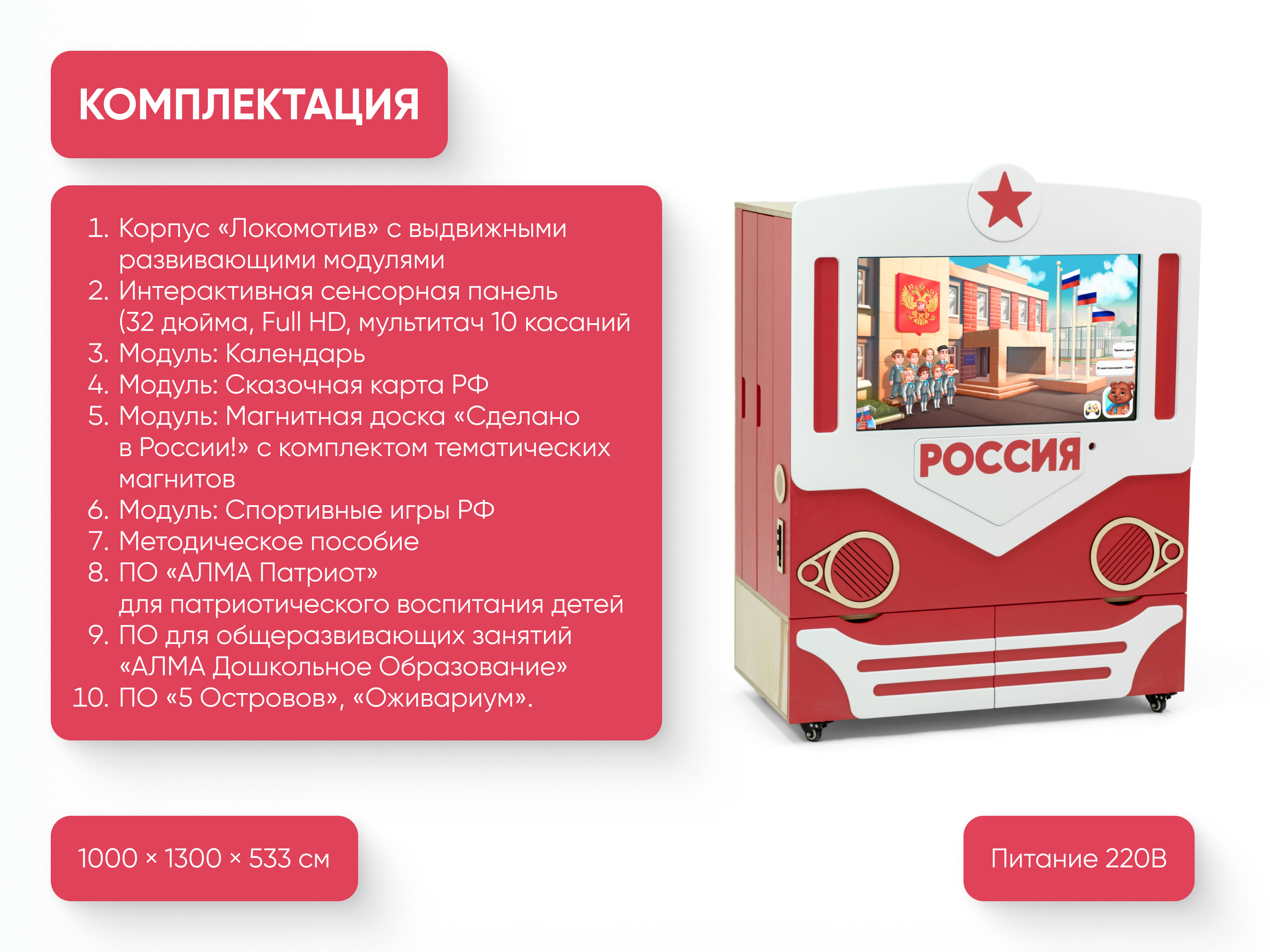 Главным центром притяжения является интерактивная сенсорная панель – на ней установлено фирменное программное обеспечение «АЛМА Патриот», состоящее из 5 тематических блоков: карта России, национальные праздники, государственность, выдающиеся личности, викторина. Также дополнительно идёт пакет общеразвивающих ПО: «АЛМА Дошкольное образование», «5 Островов» и раскраска «Оживариум».