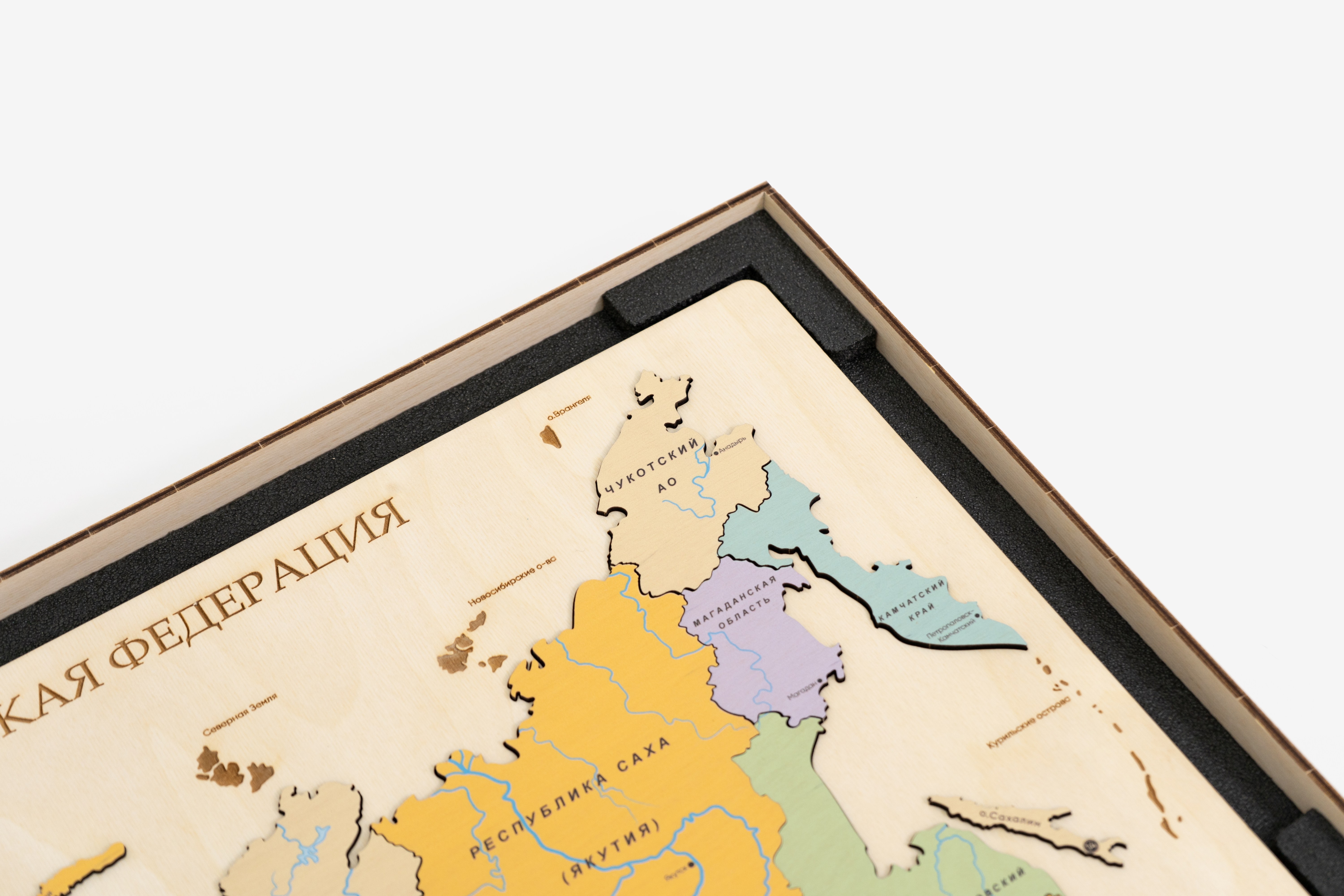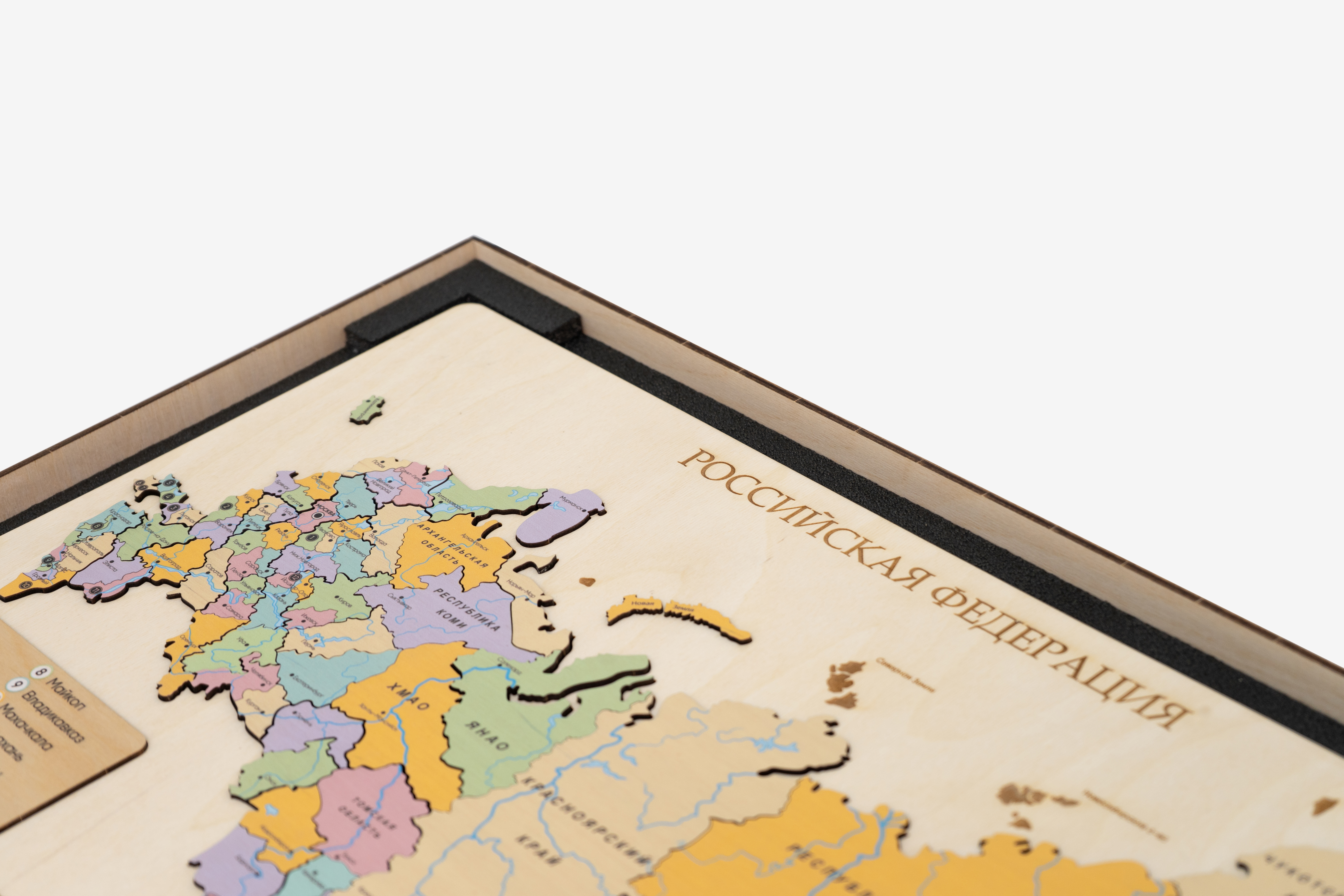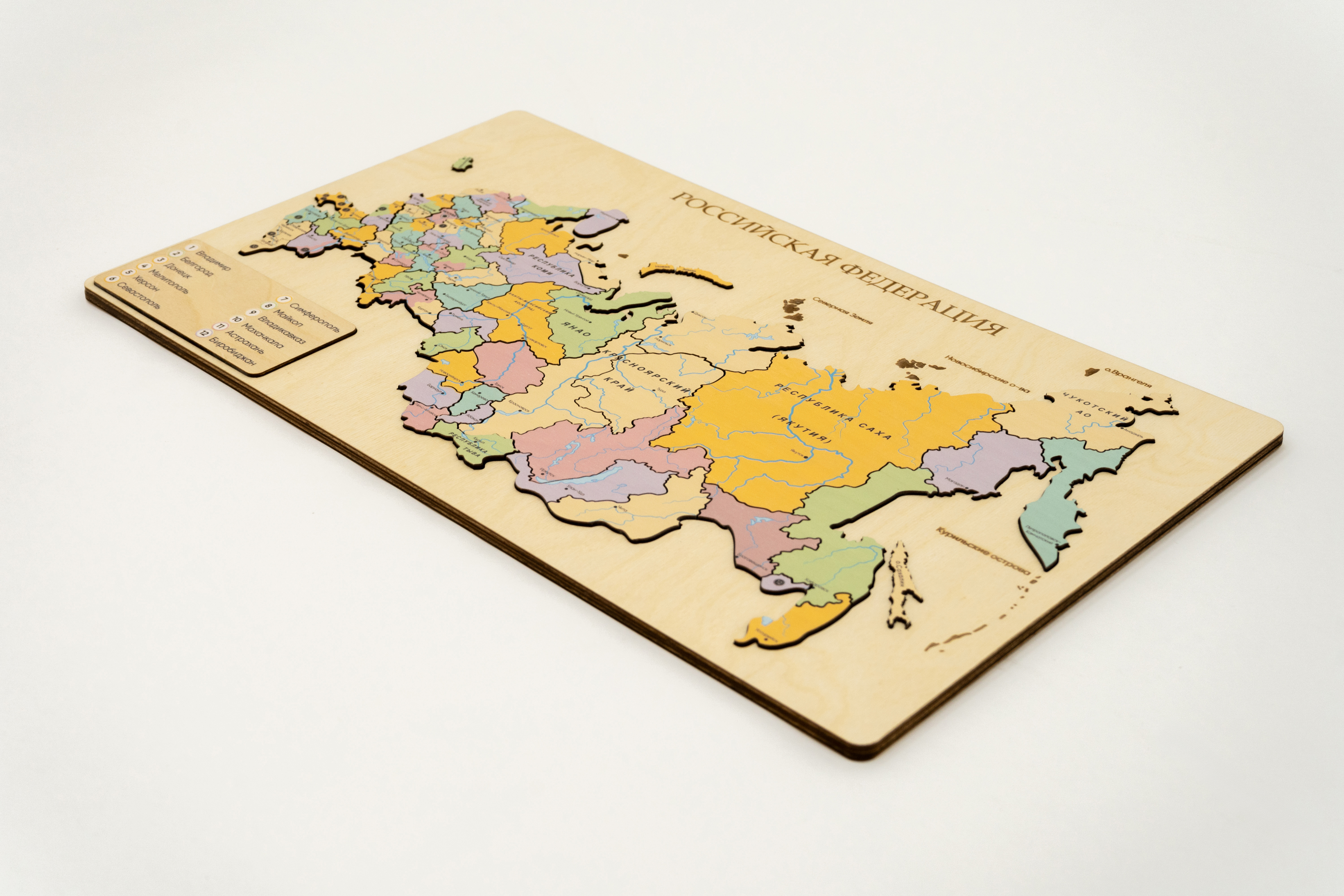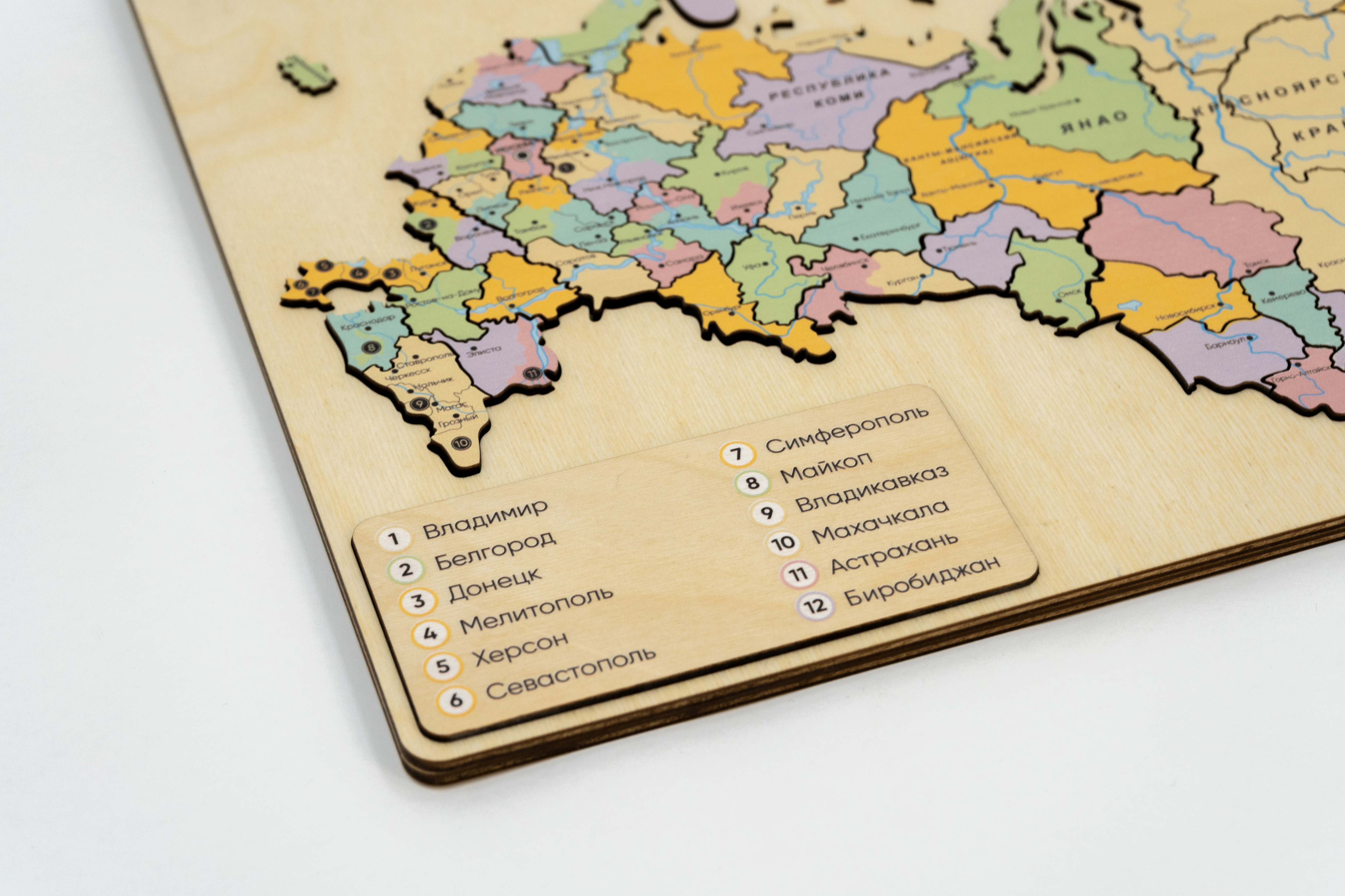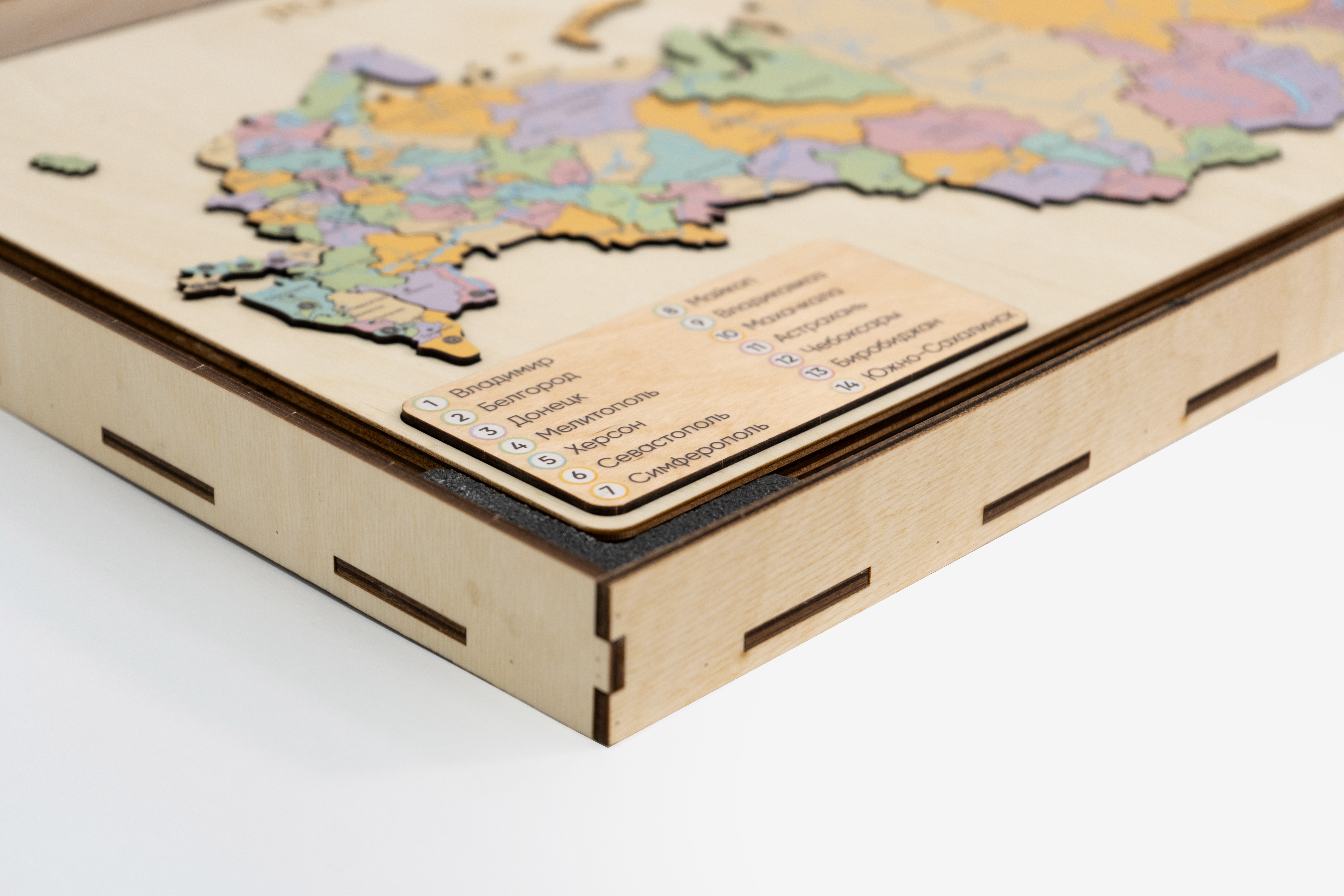 Карта изготовлена из экологичной берёзовой фанеры, все её контуры и фрагменты тщательно отшлифованы. Специальная UF-печать обеспечивает стойкость красок к выцветанию, сохраняя яркость и чёткость изображений на протяжении длительного времени.